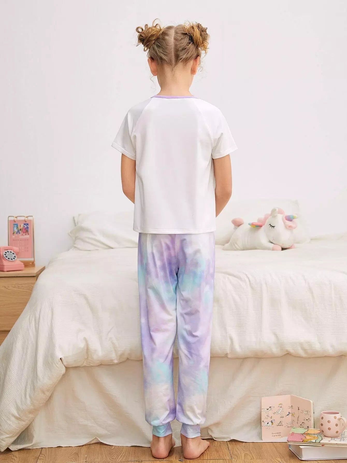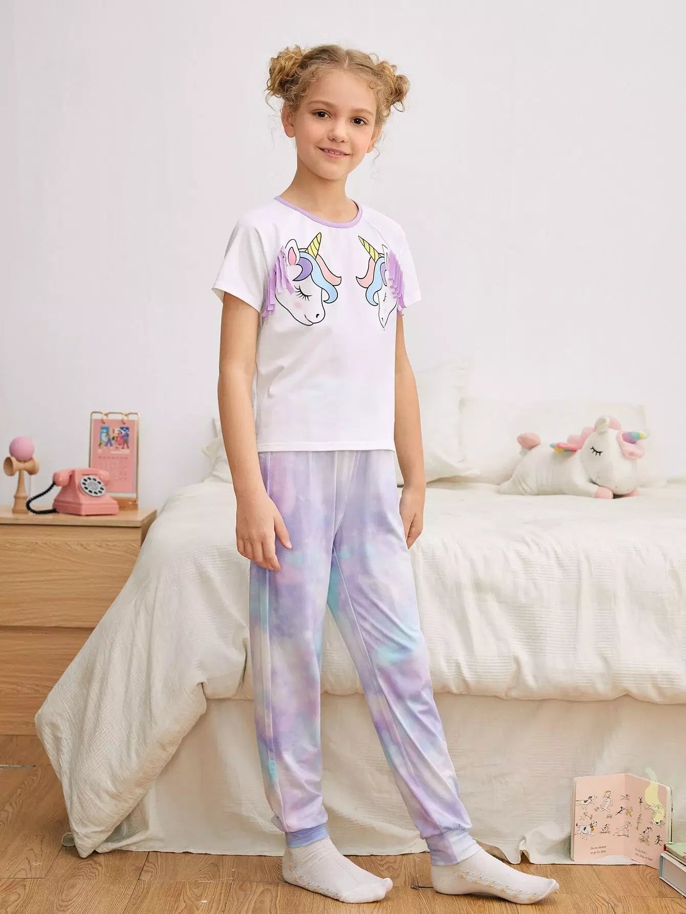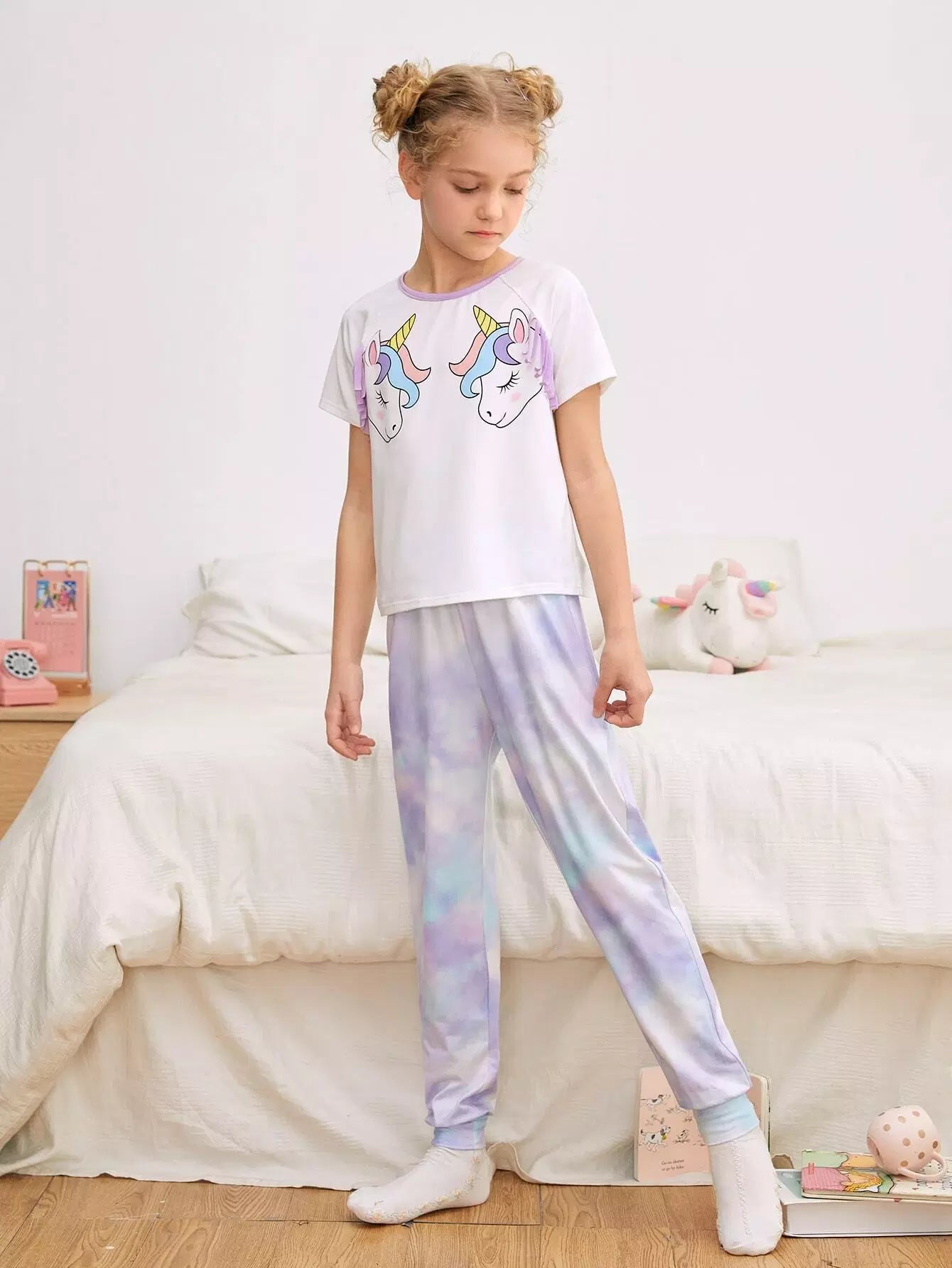 طقم بيجامة بنطلون بأكمام راجلان مطبوع عليها يونيكورن وبنطلون رياضي مصبوغ
