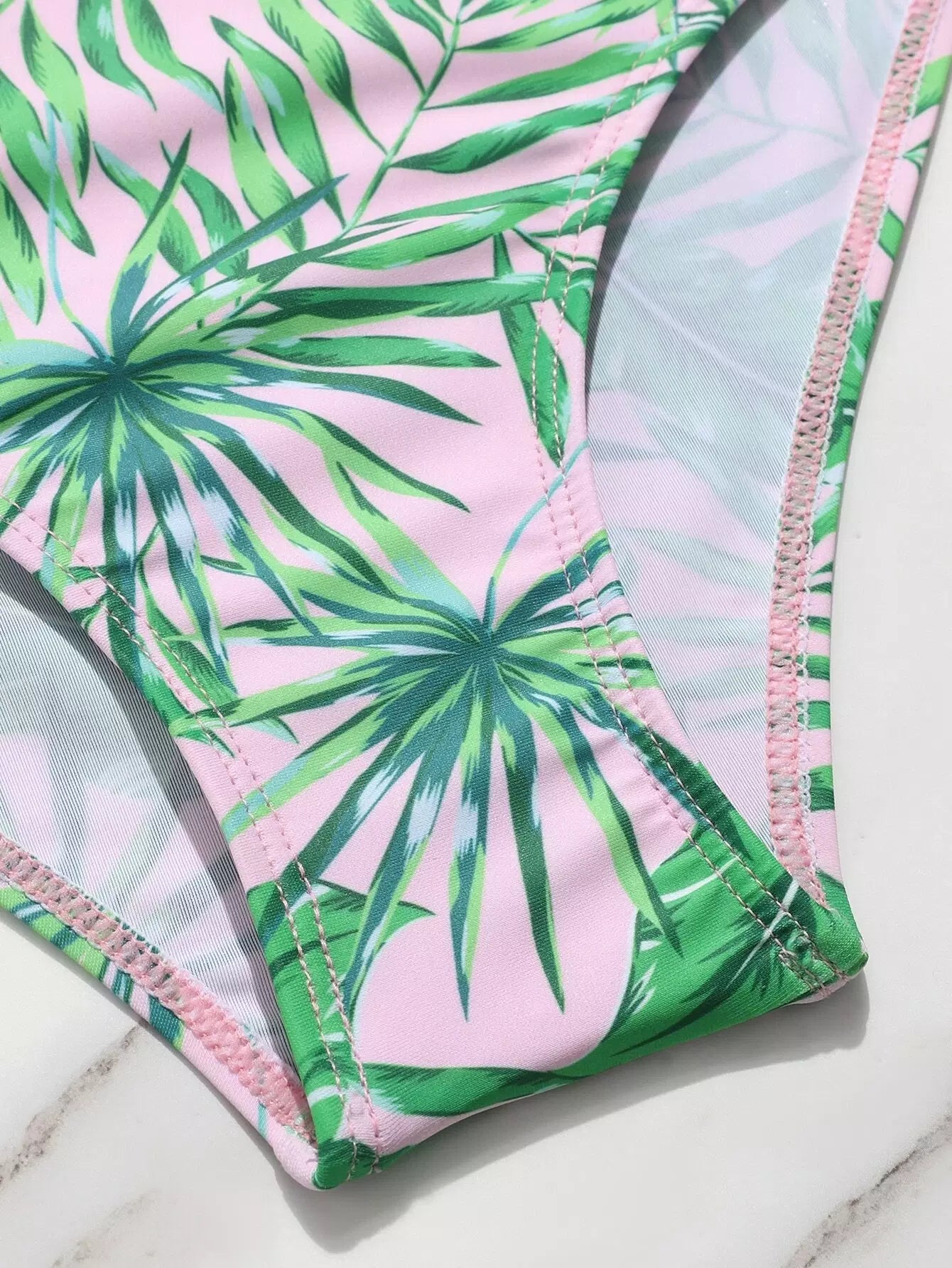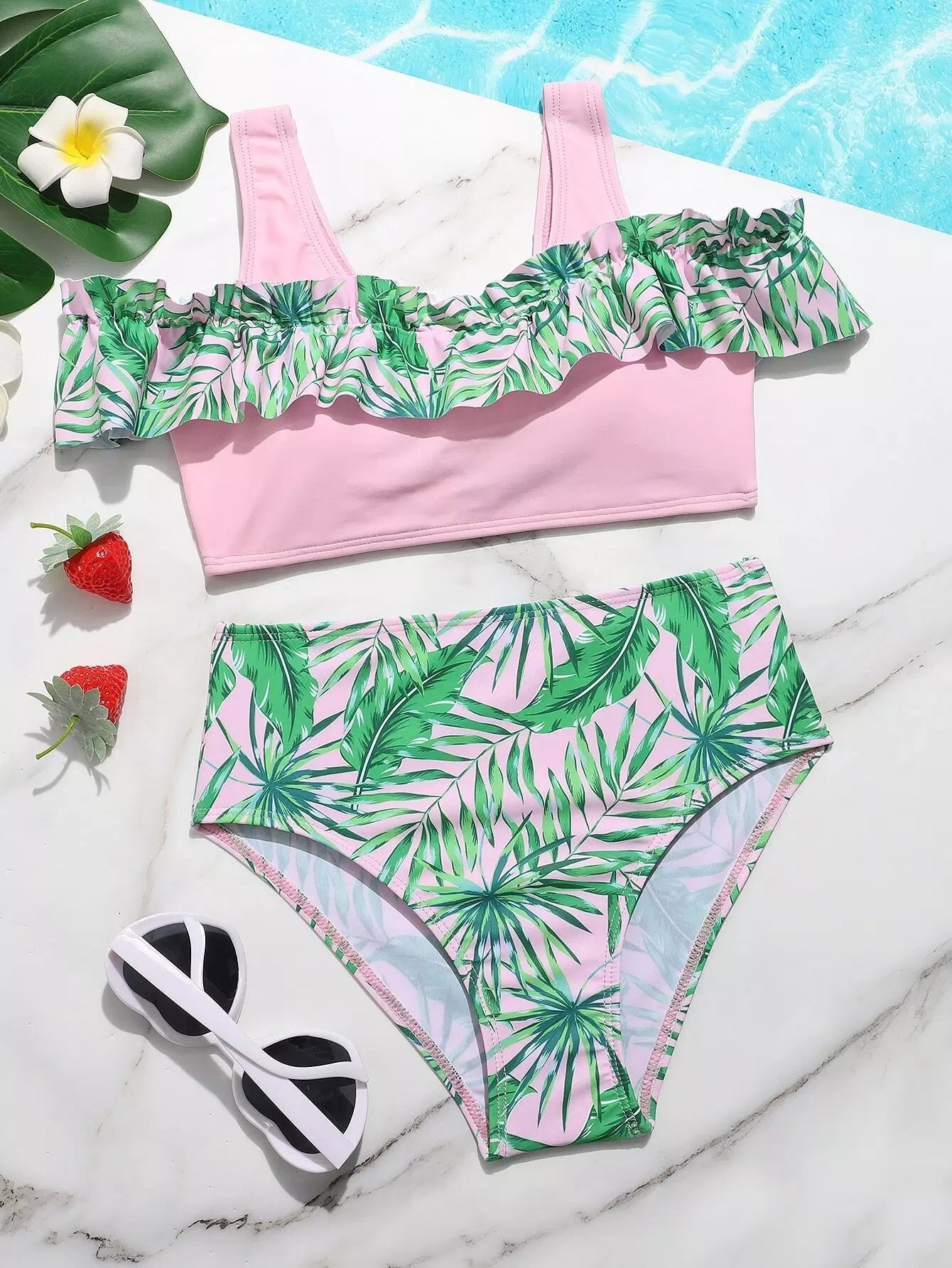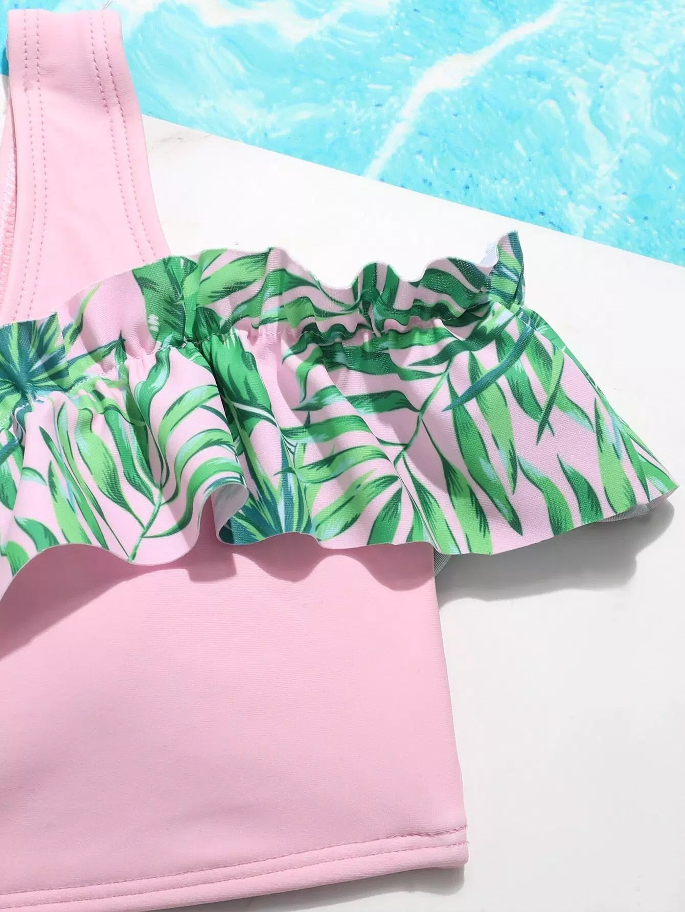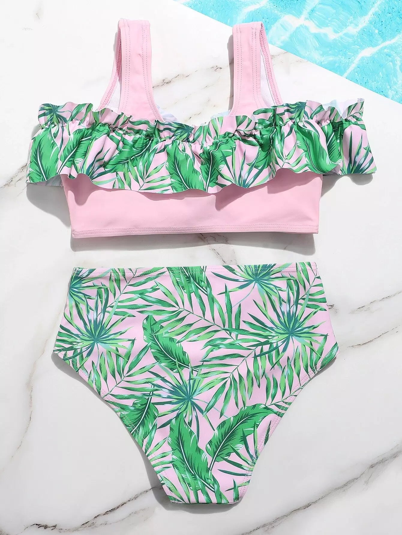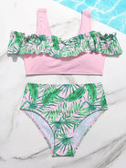 ملابس سباحة بيكيني كشكش بطبعة أوراق عشوائية للبنات