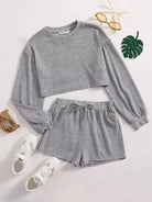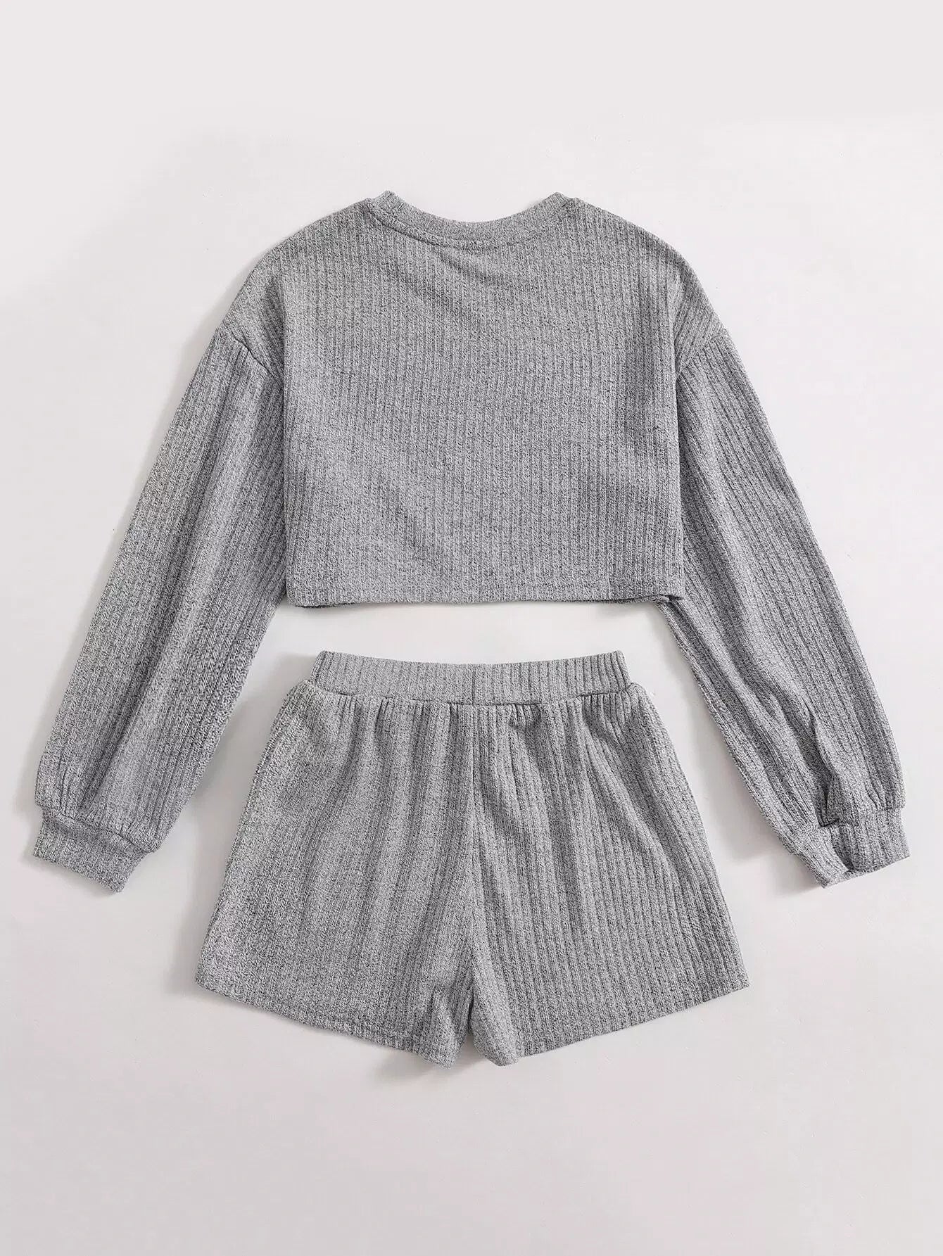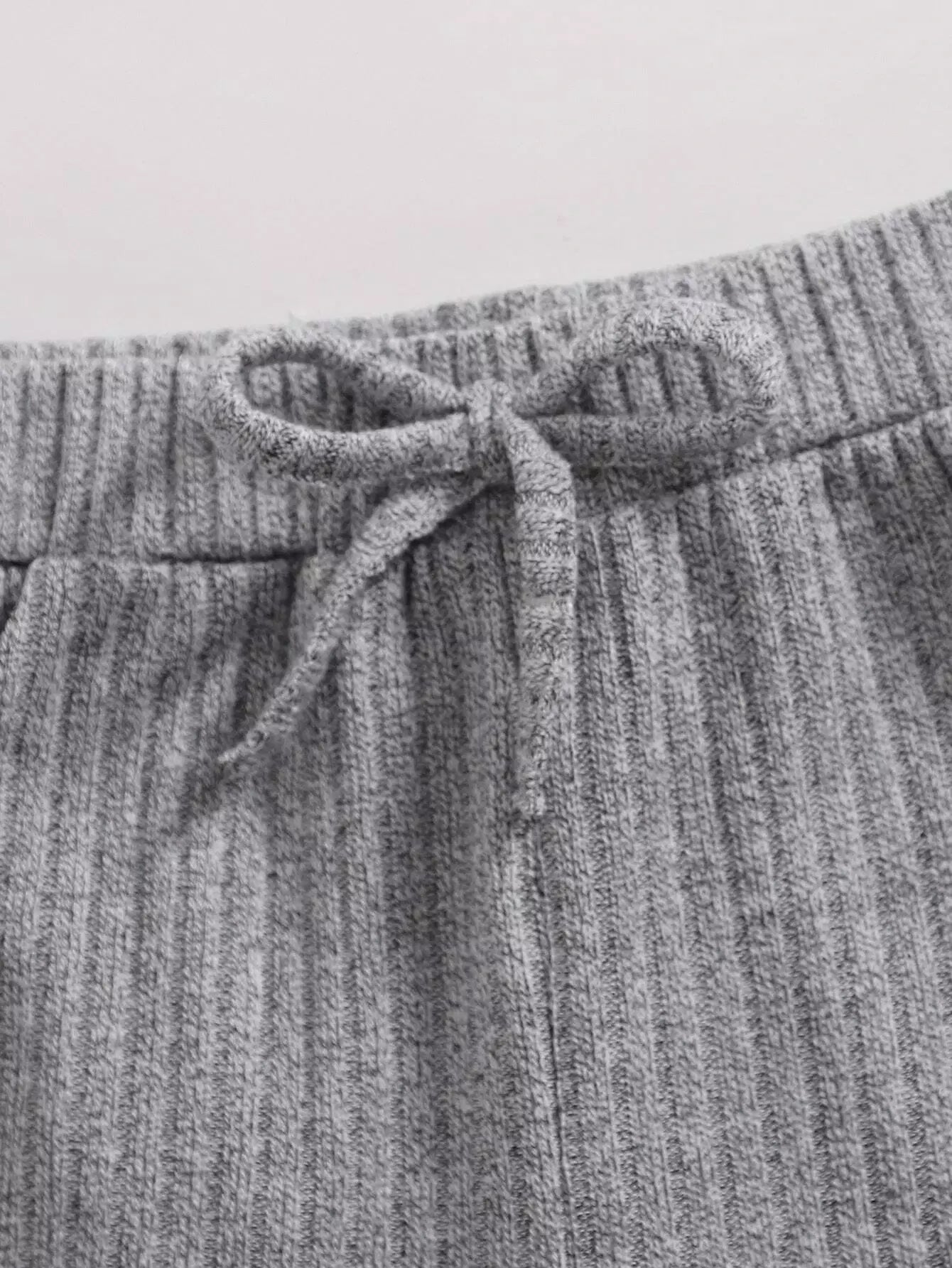 طقم تي شيرت بناتي محبوك على شكل ضلع محبوك وشورت بعقدة أمامية