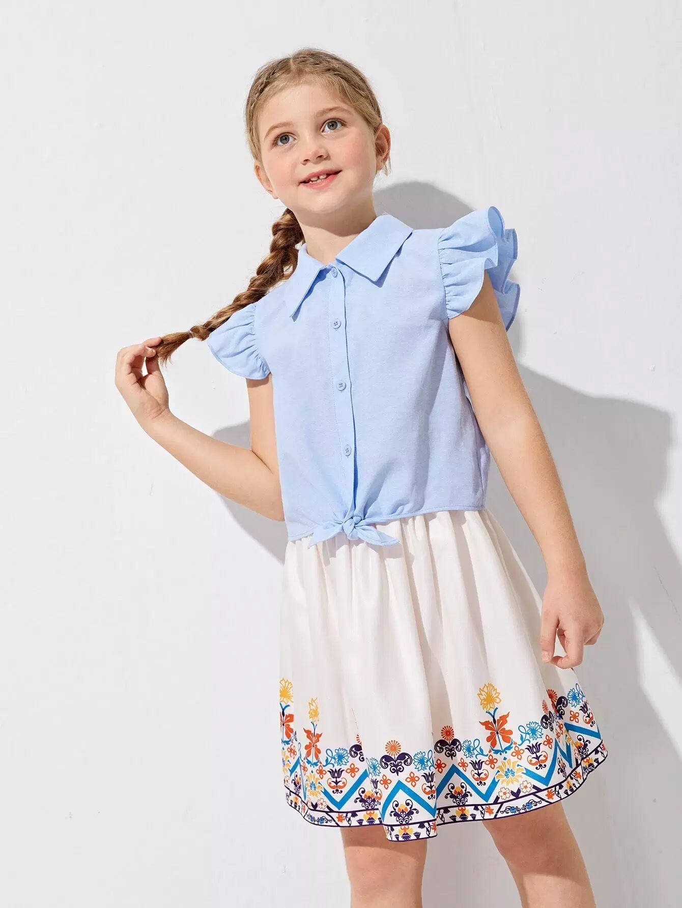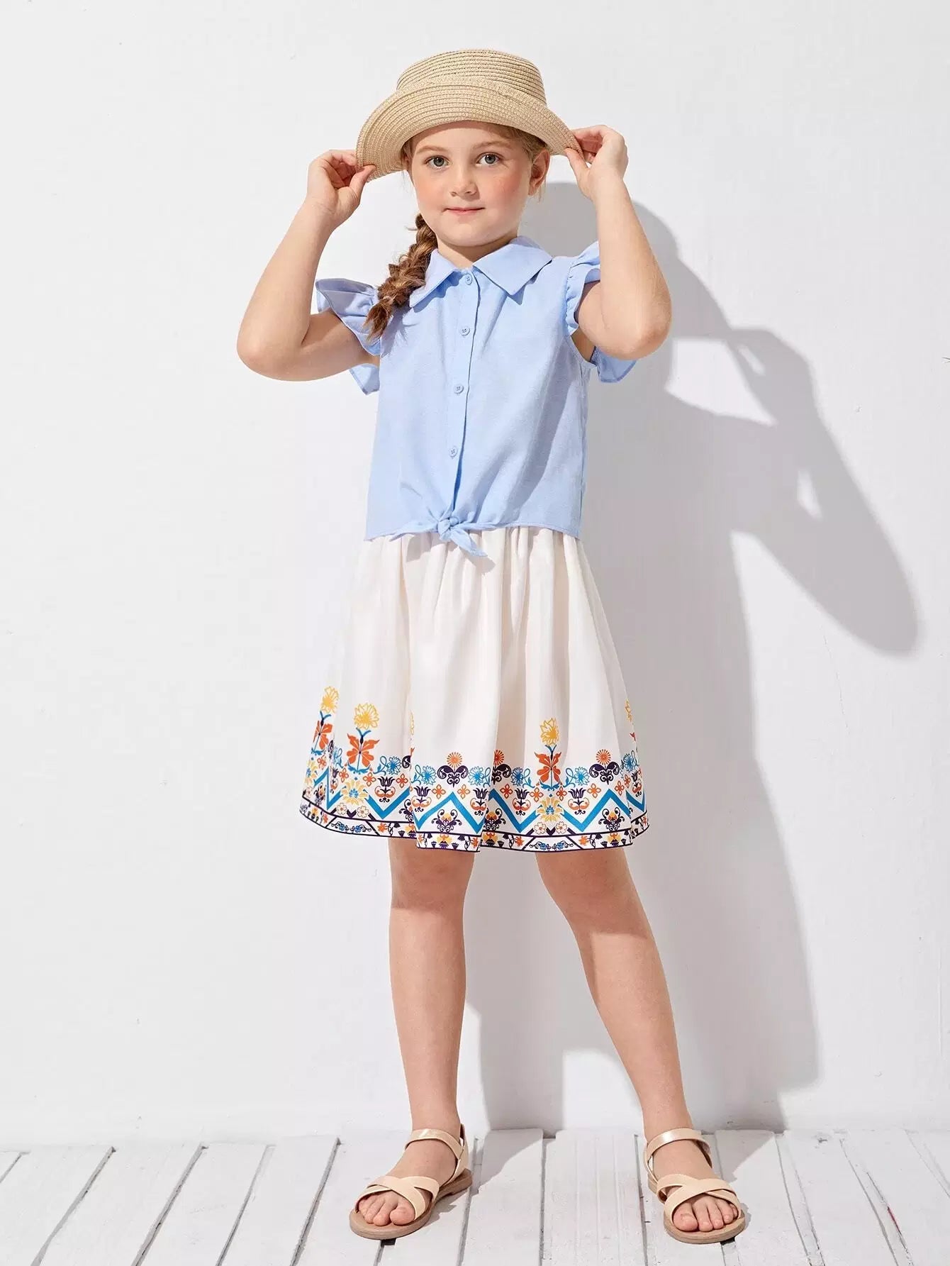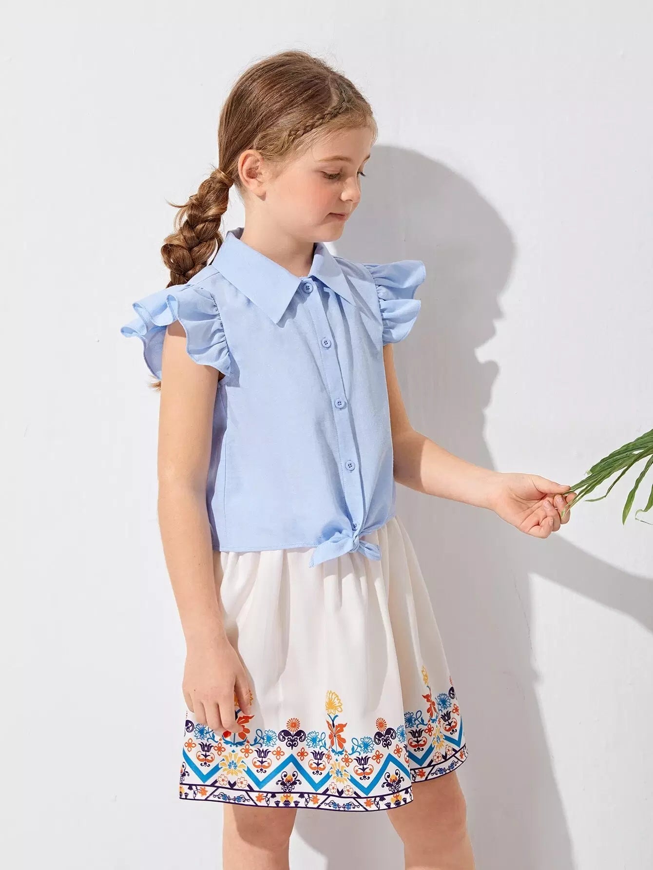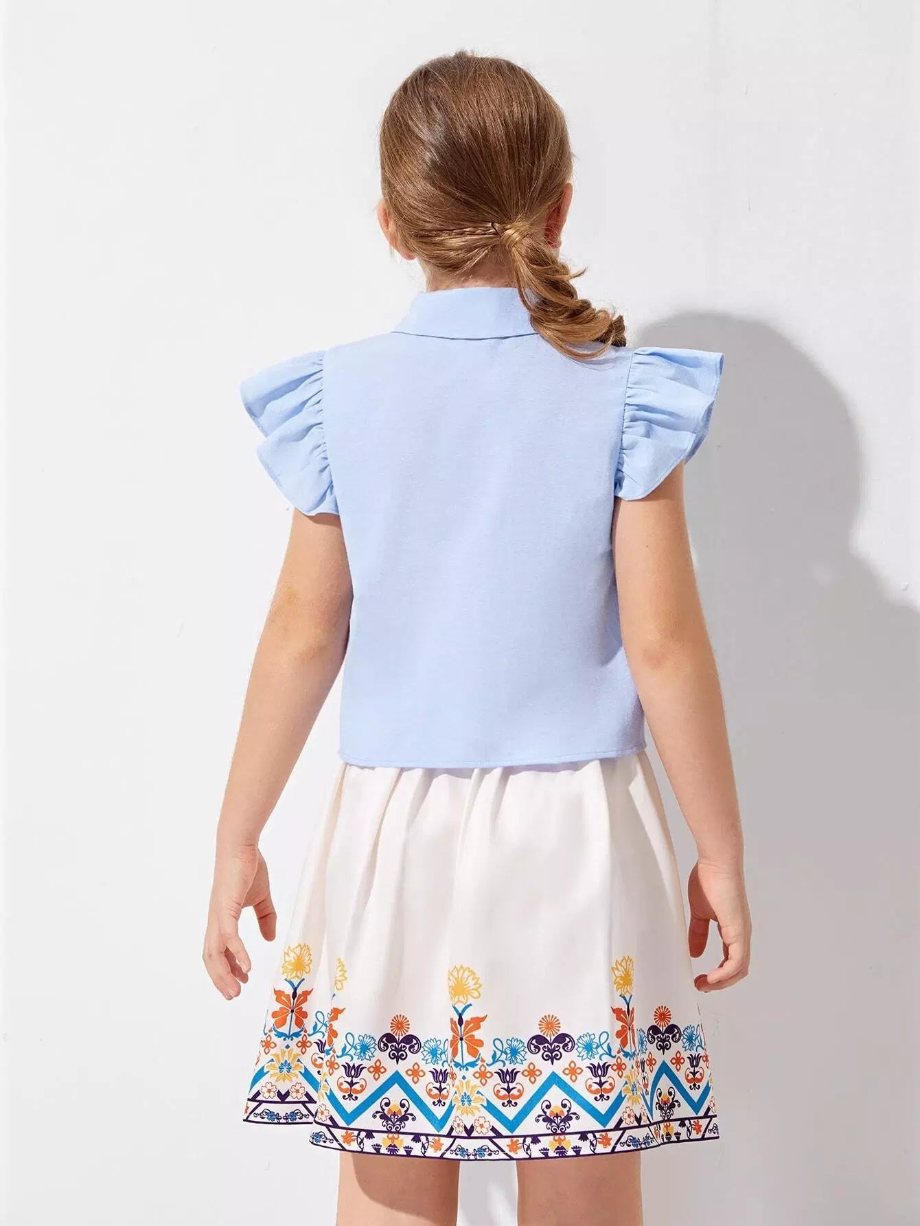 طقم بلوزة بأكمام مكشكشة وتنورة مزهرة للبنات