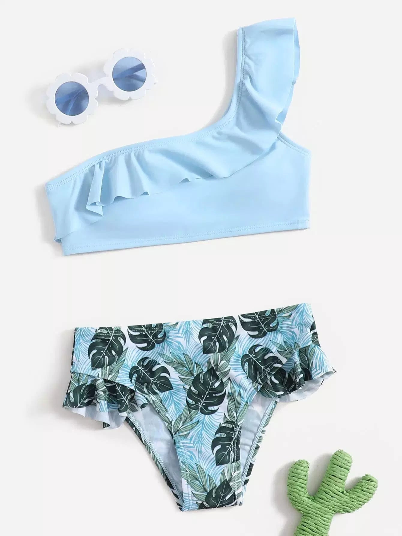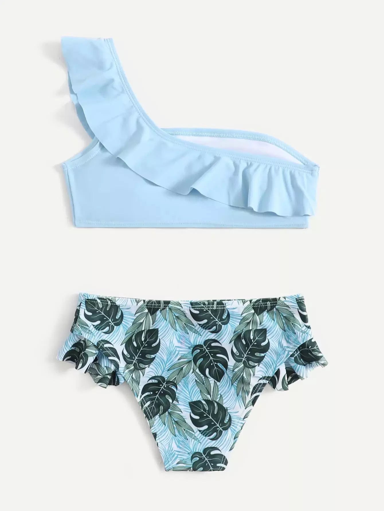 ملابس سباحة بيكيني كشكش استوائي بكتف واحد للبنات