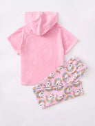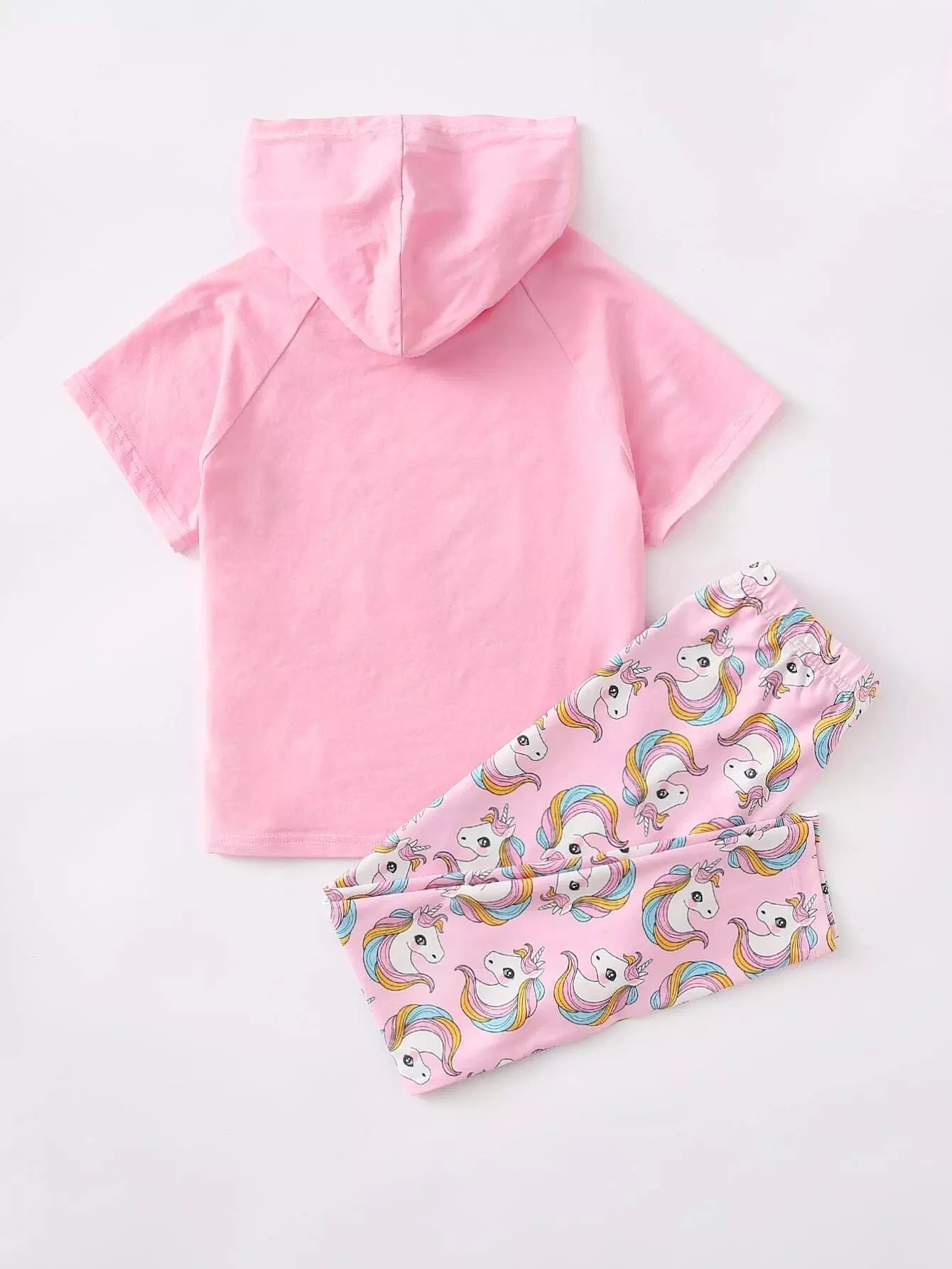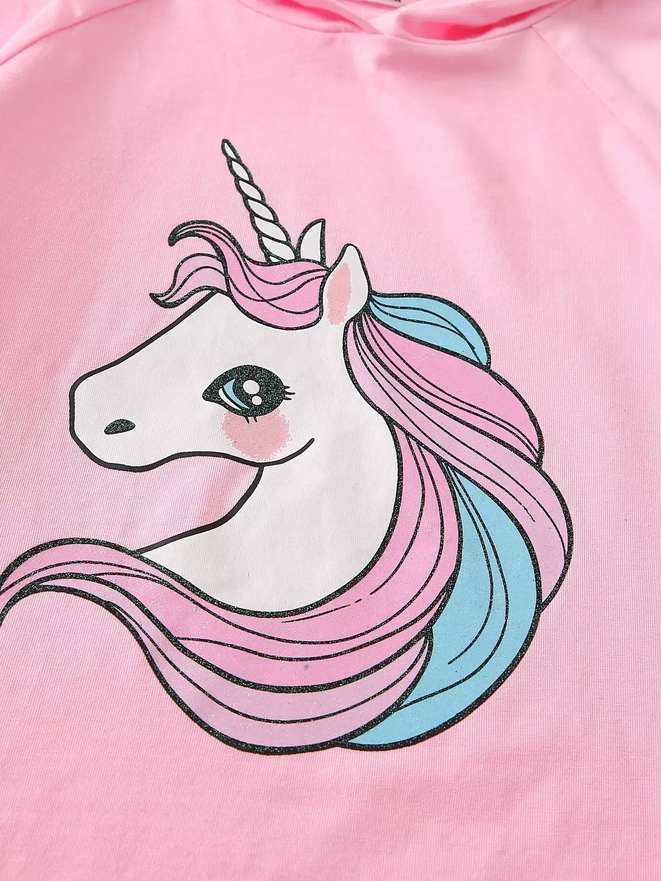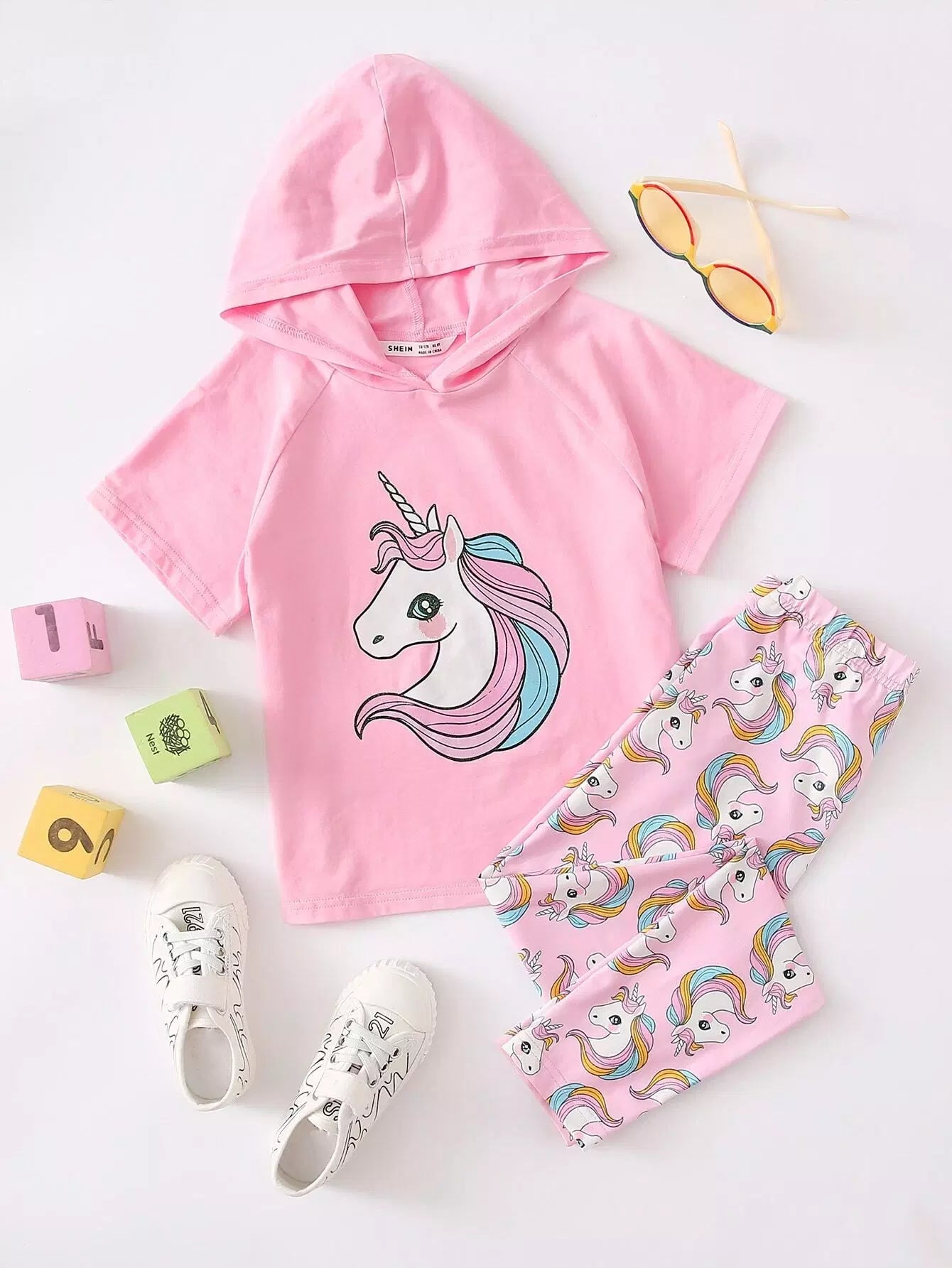 طقم تي شيرت بغطاء رأس وبنطال ضيق مطبوع عليه يونيكورن للبنات