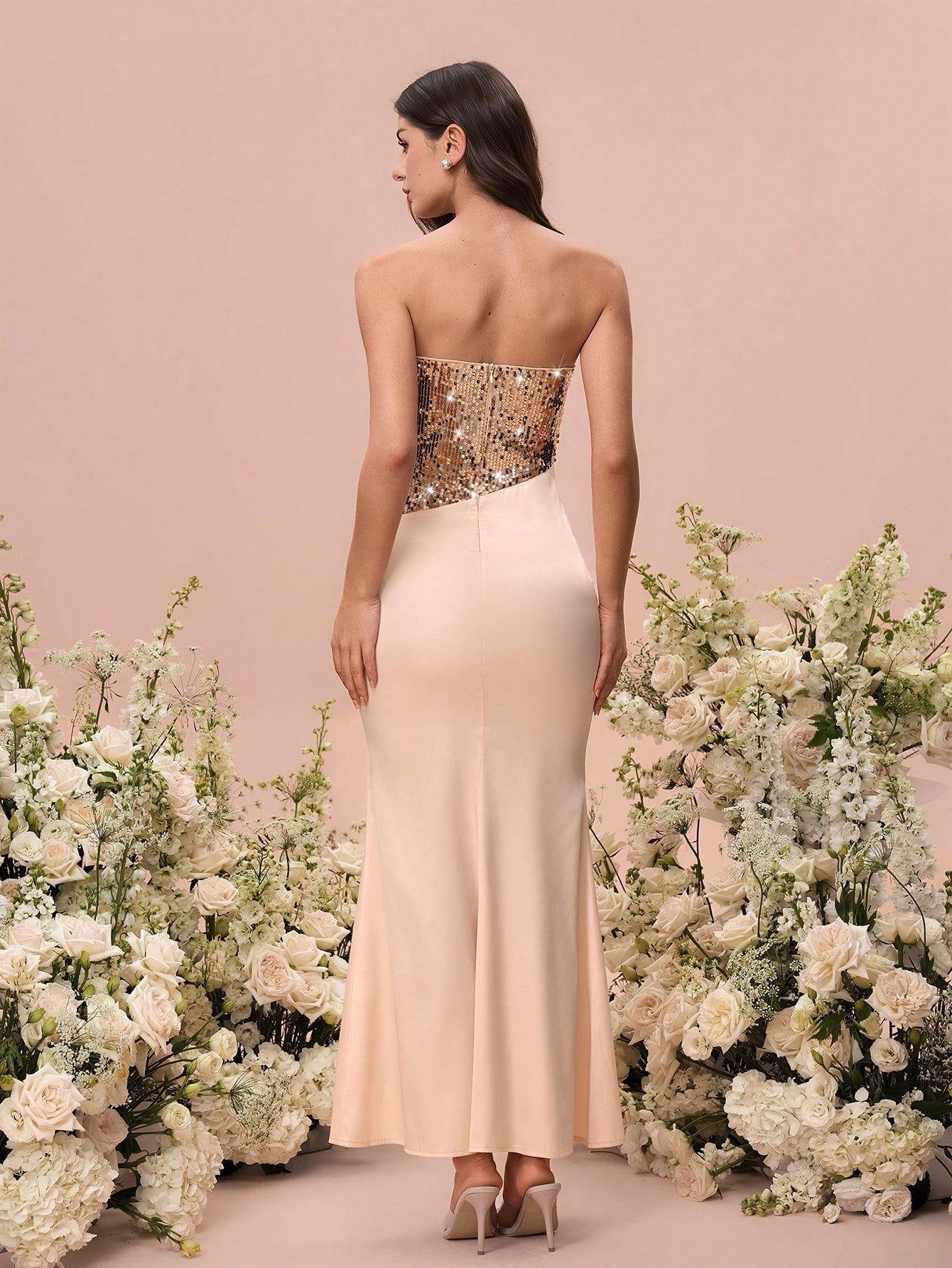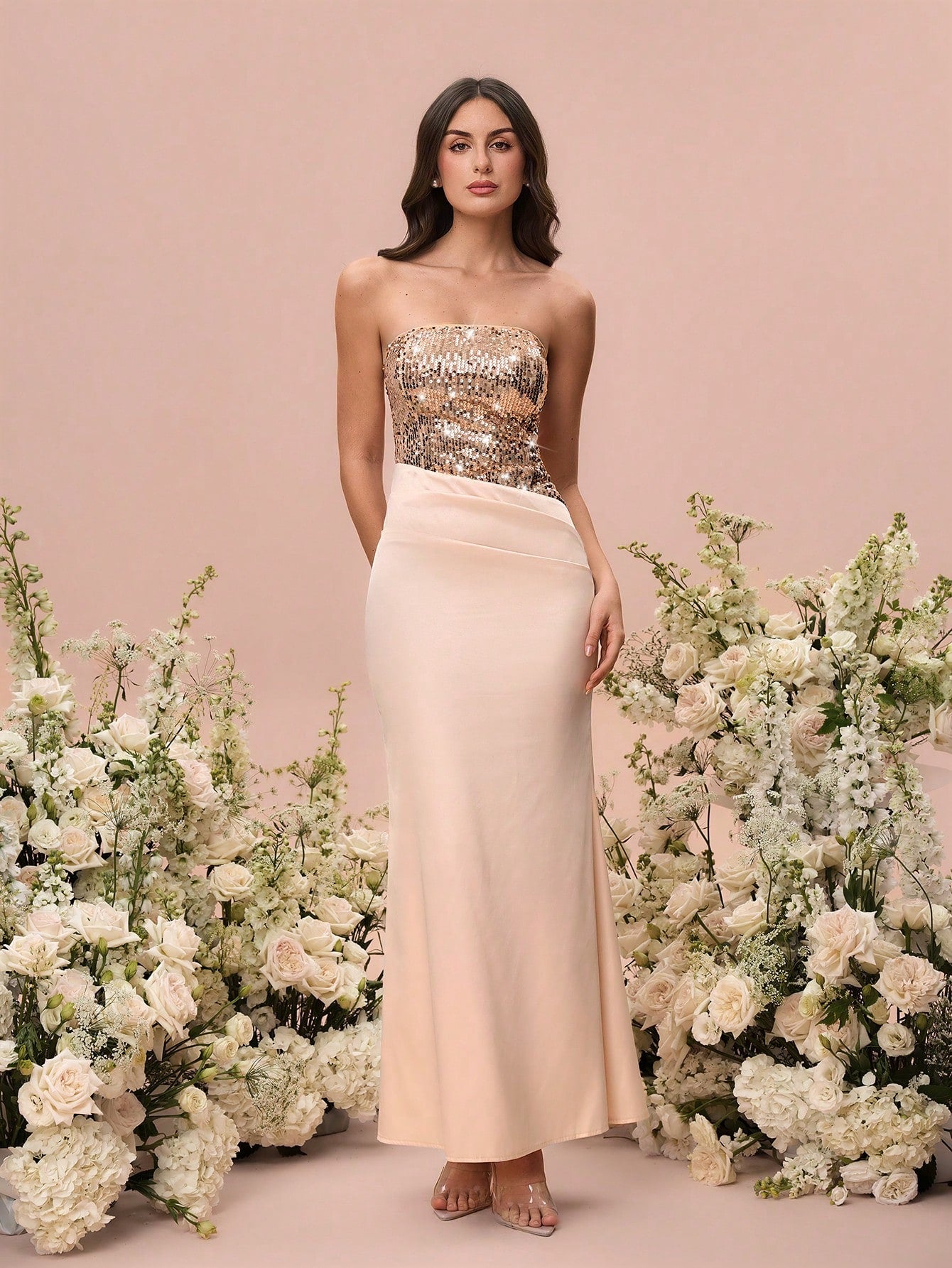 women Glamine New Champagne Color Knit Sequin Splicing Woven Satin Tube Top Backless Shrinkage At The Side Back Zip Up Slim Four Seasons Haute Elegant Long Women's Dresses