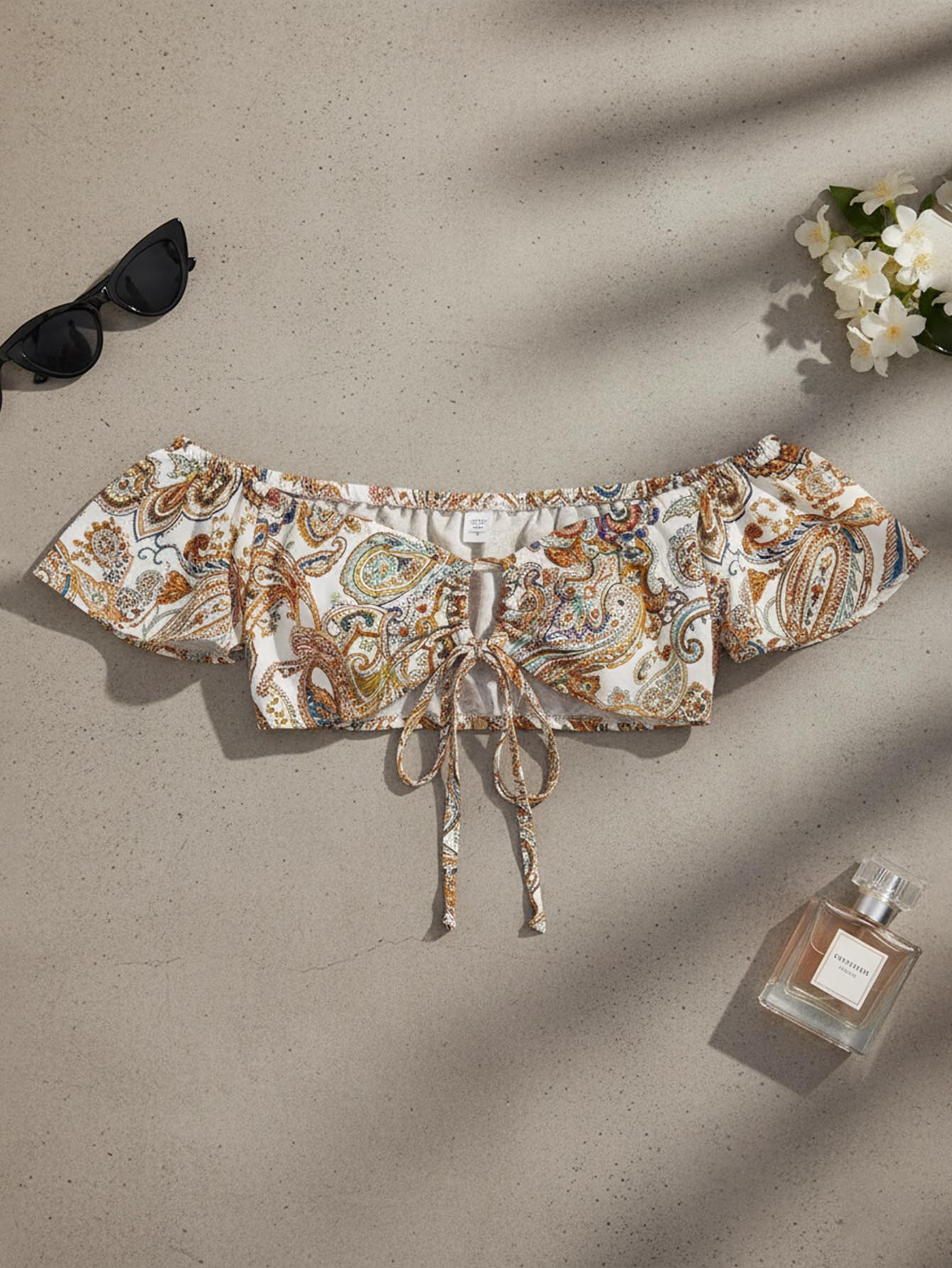 بلوزة بدون أكتاف بطباعة جرافيكية مع ربطة أمامية