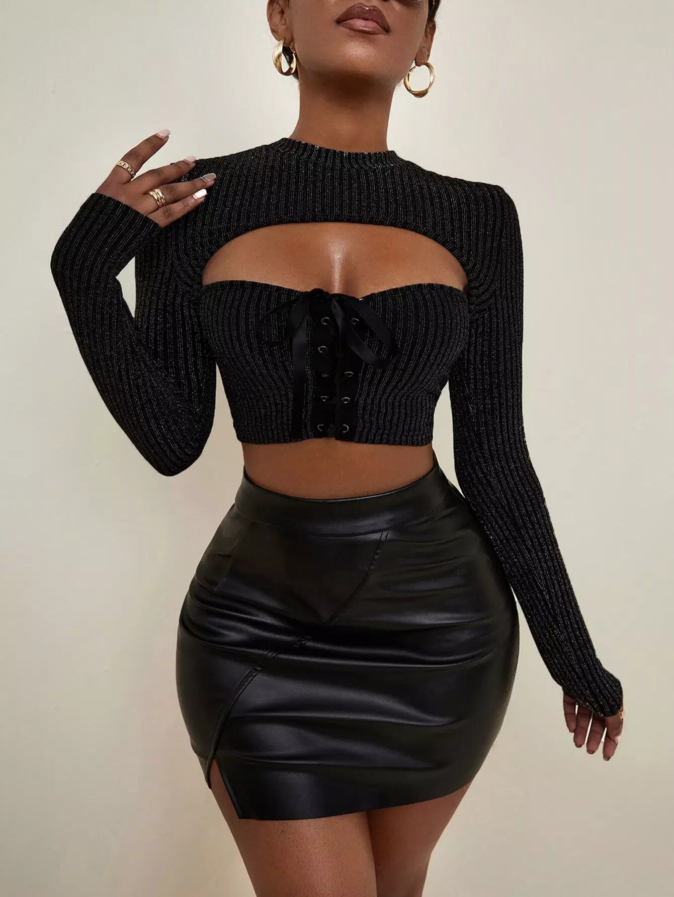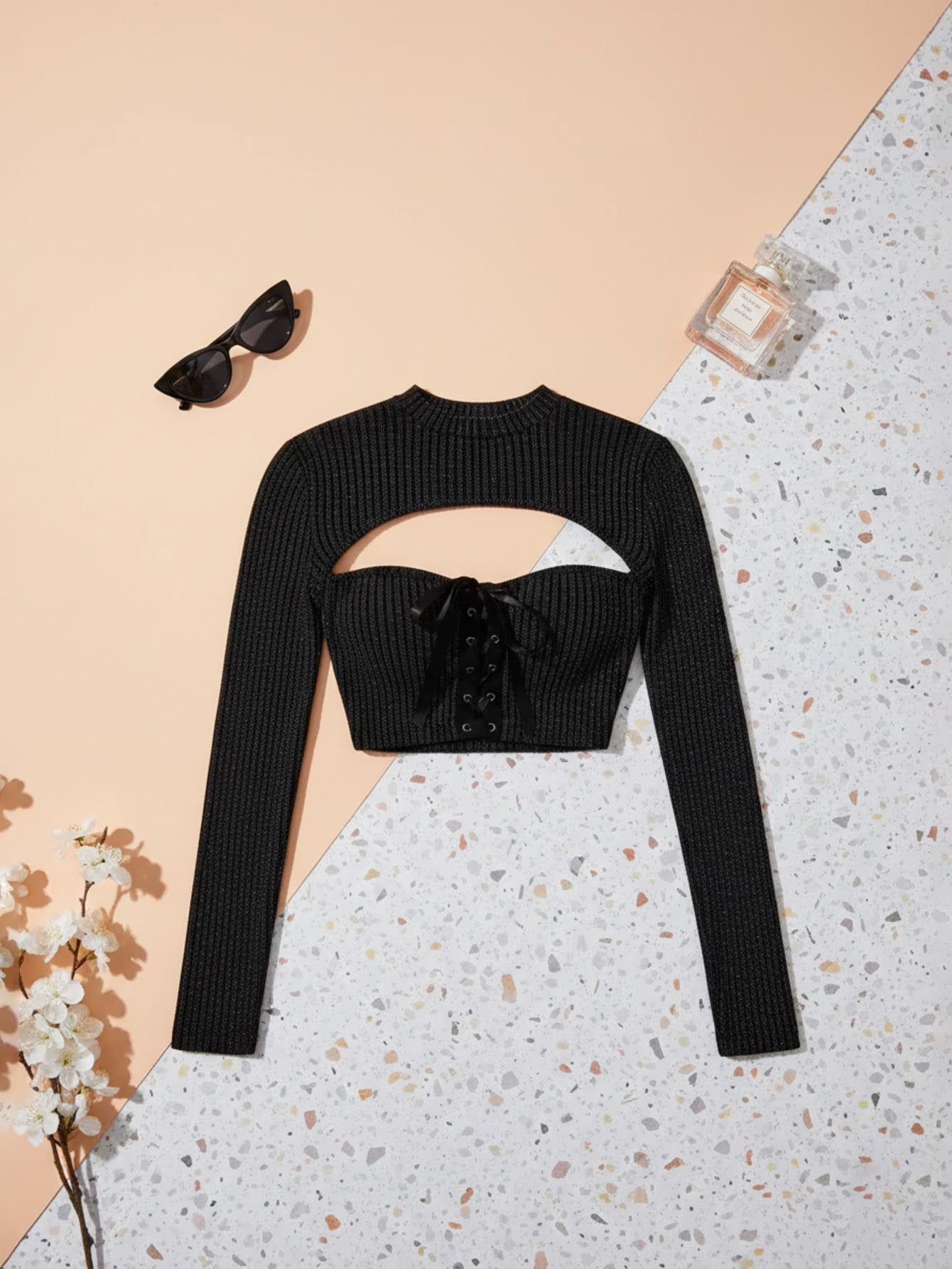 تي شيرت قصير لامع بفتحة رباط وحلقات معدنية