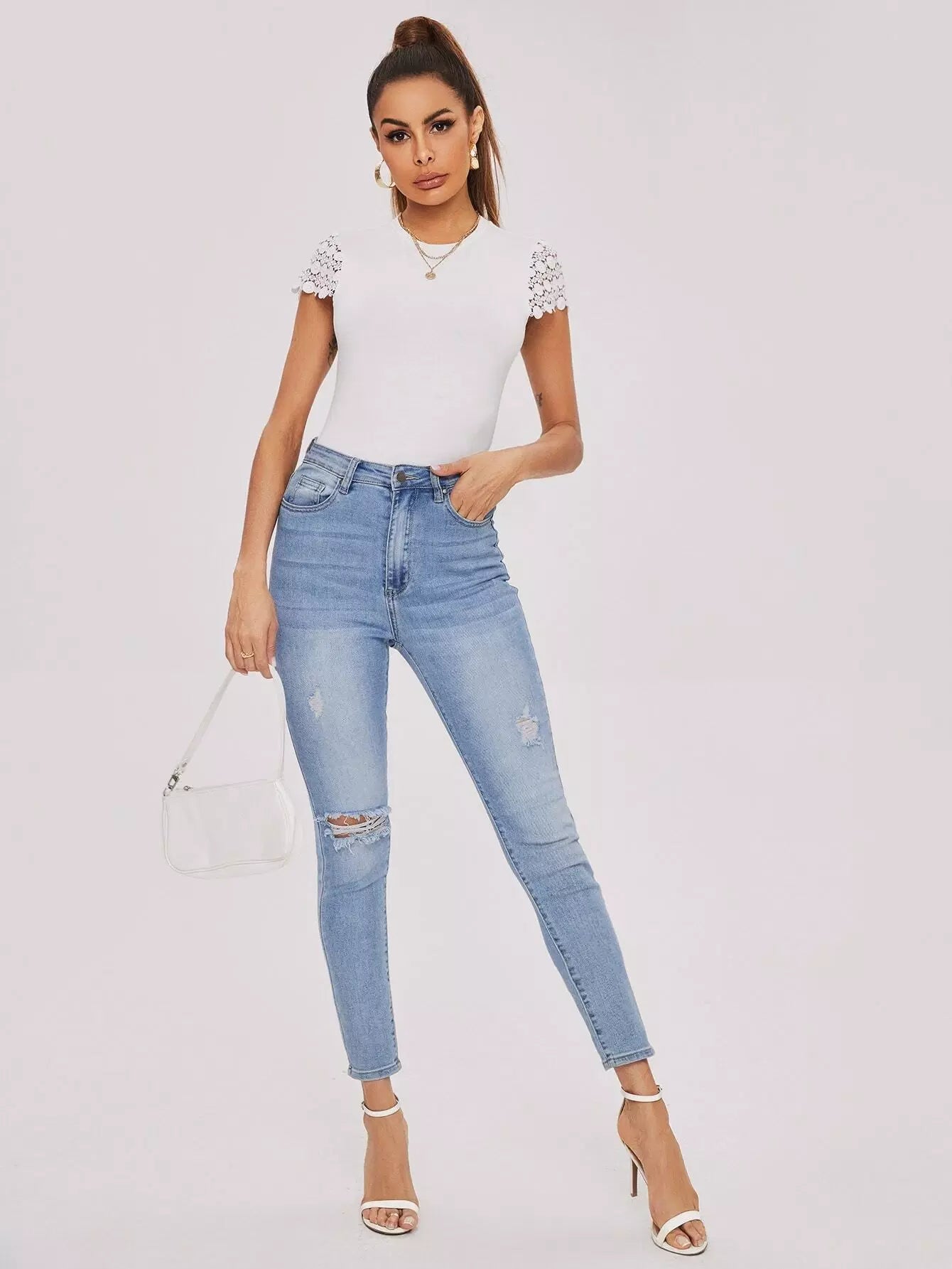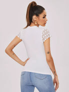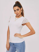 تي شيرت بأكمام من الدانتيل المخرم بأربطة مخرمة