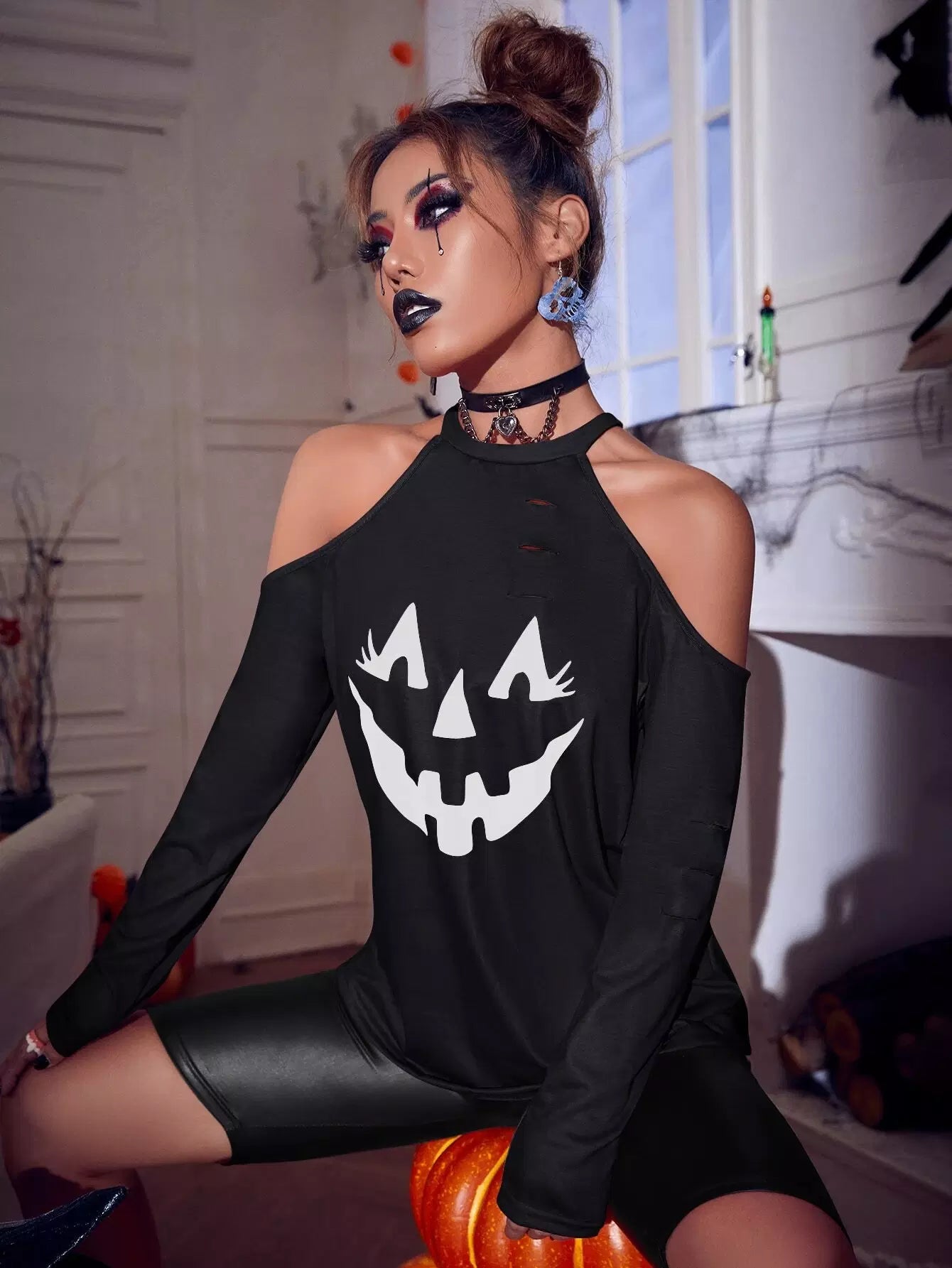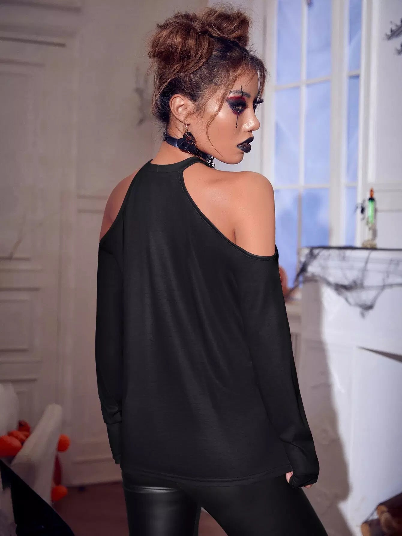 تي شيرت بأكتاف باردة مطبوع عليه طبعة هالوين