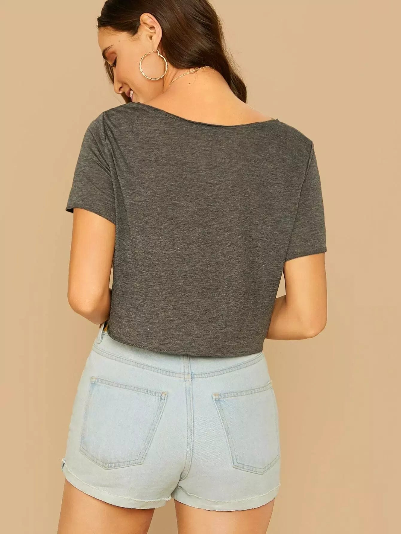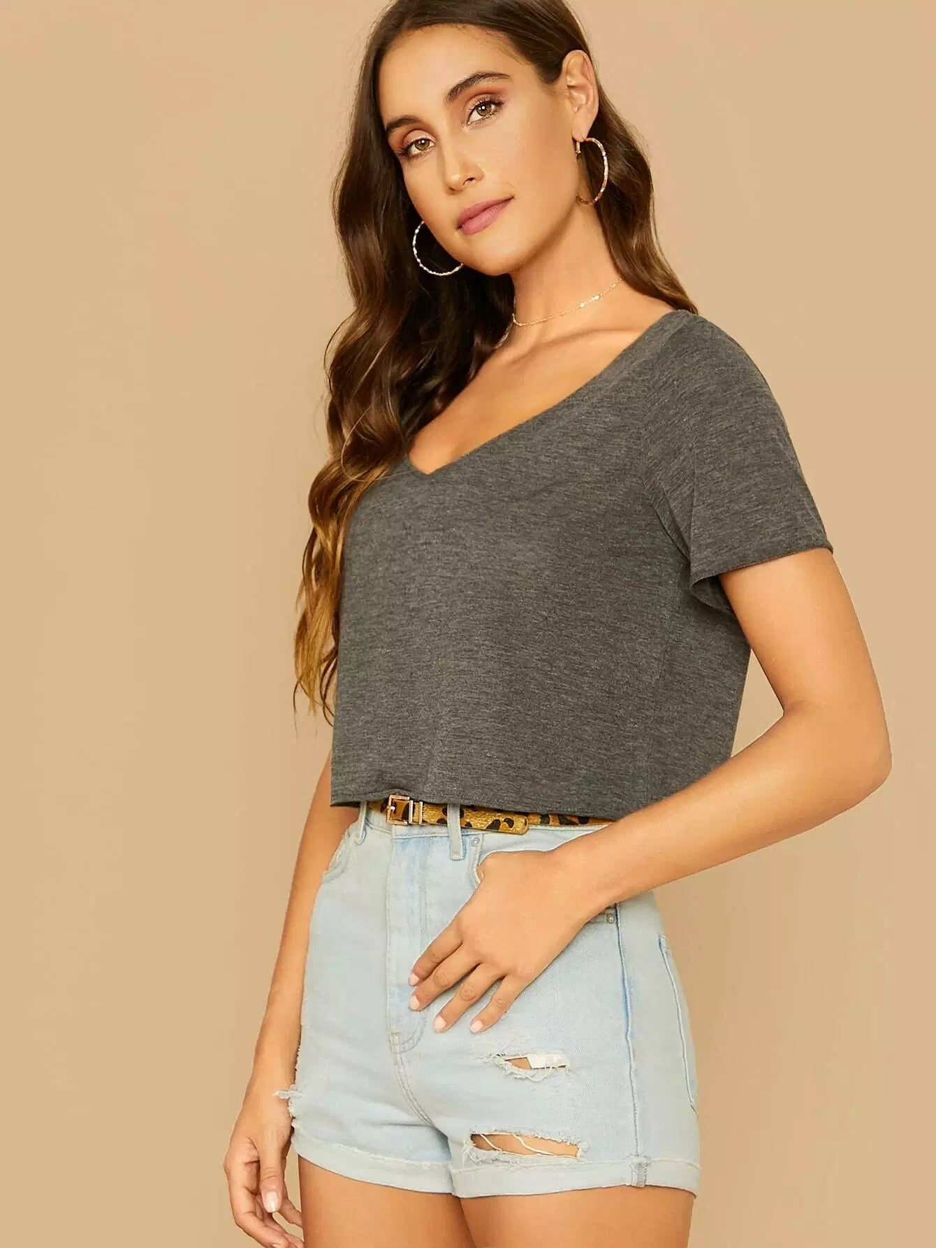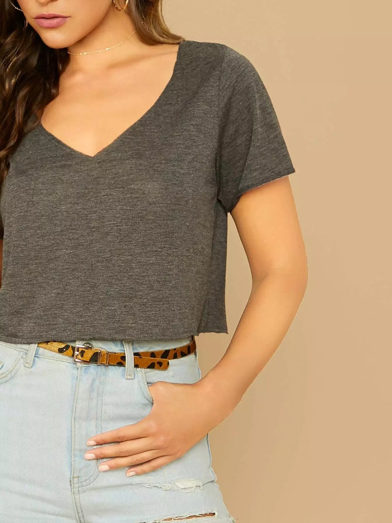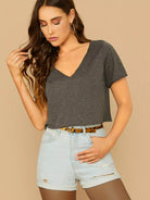 تي شيرت بياقة على شكل مربع محبوك على شكل حرف V برقبة على شكل مربع