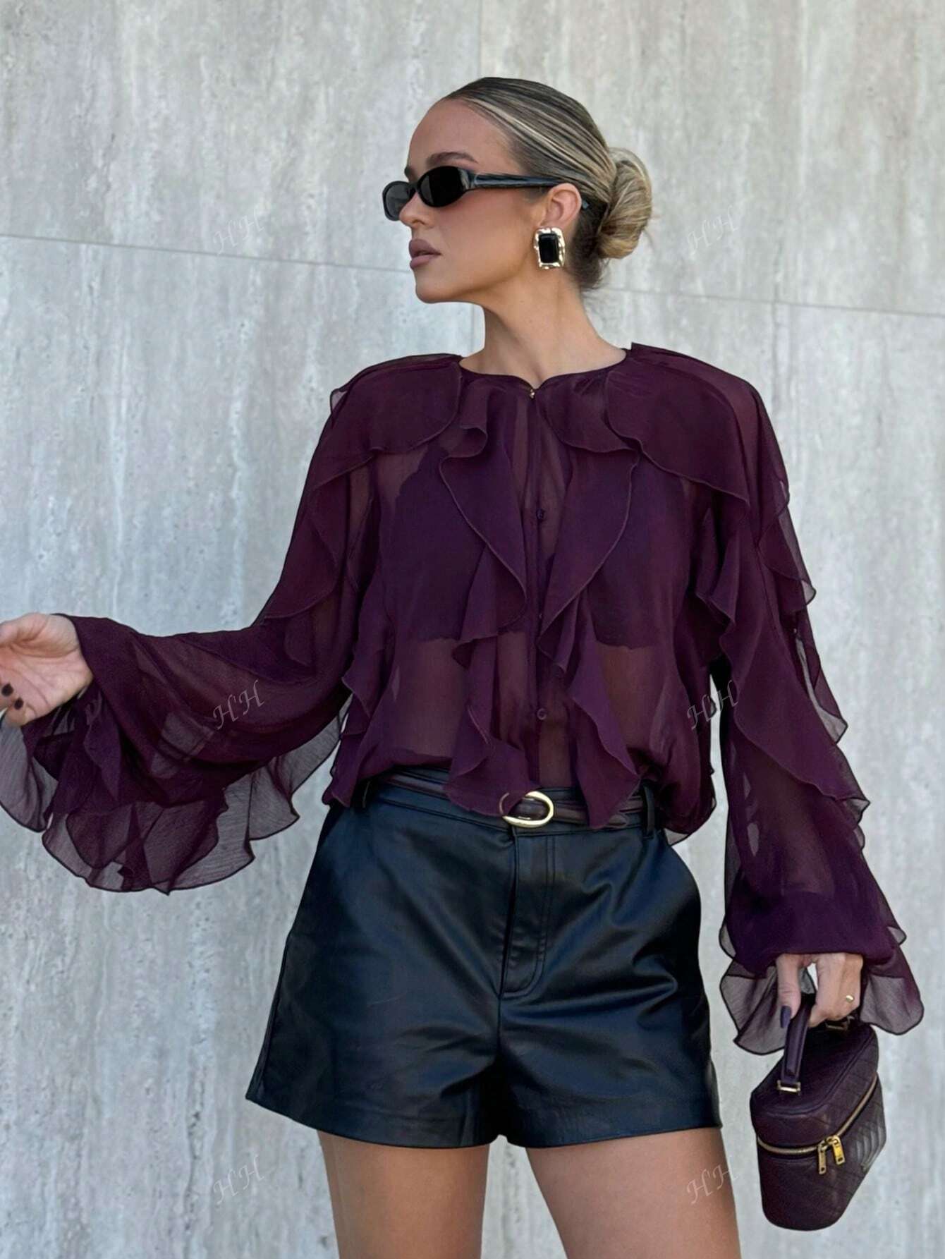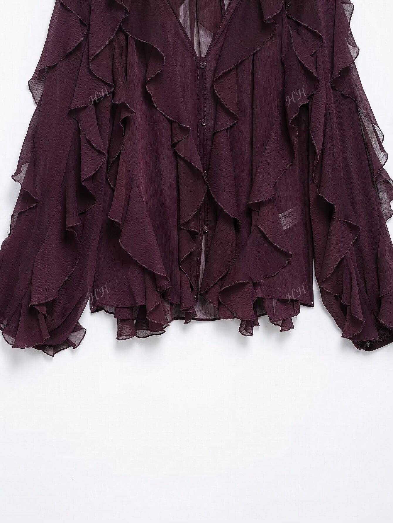 HH 2025 Spring Women Elegant V-Neck Blouse Single-Breasted Women Long Sleeves Laminated Decorative Solid
