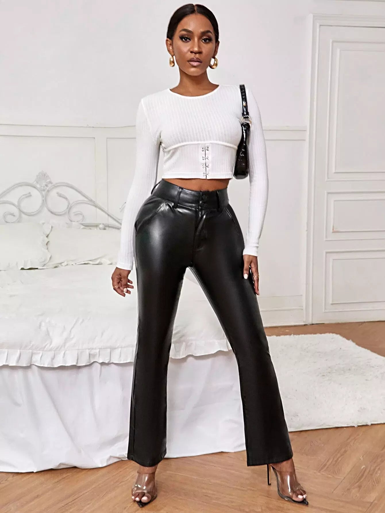بنطال من الجلد الصناعي بخصر مرتفع وواسع الساق