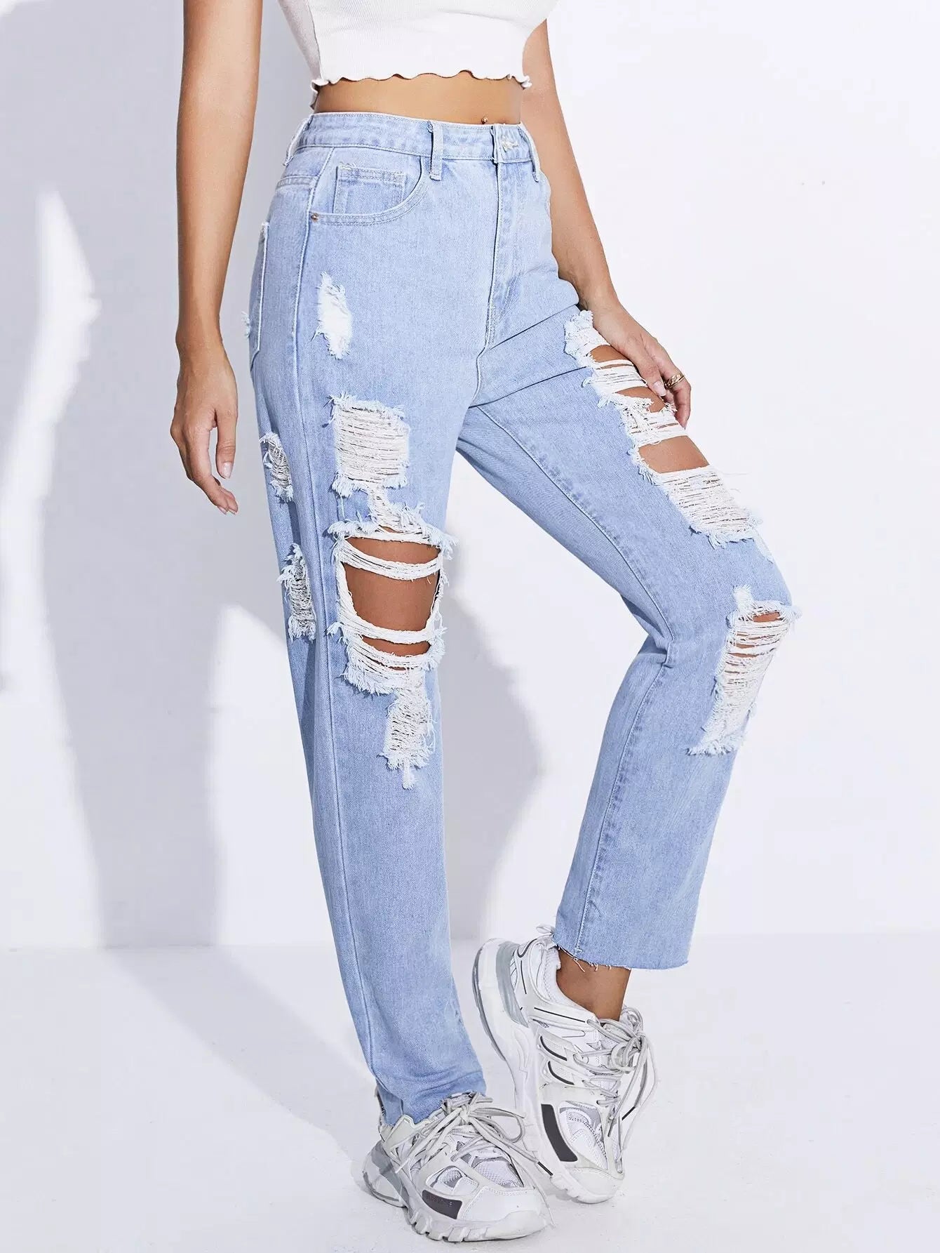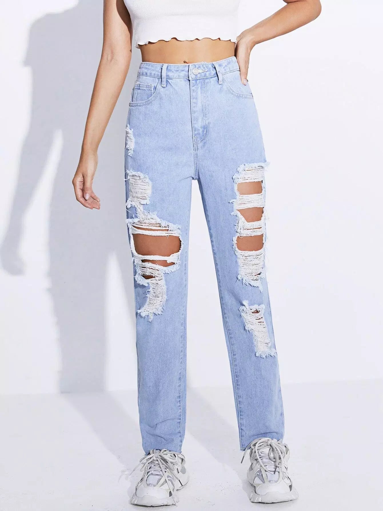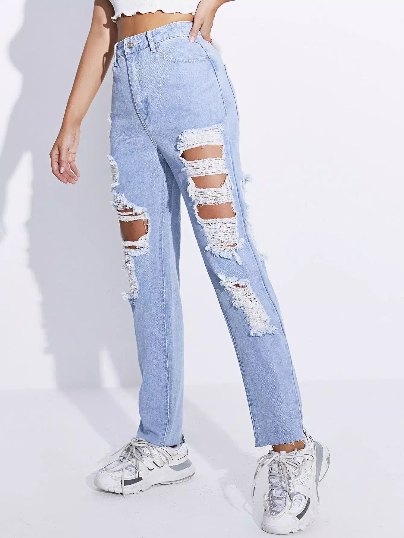 بنطلون جينز عالي الخصر ممزق التفاصيل