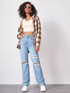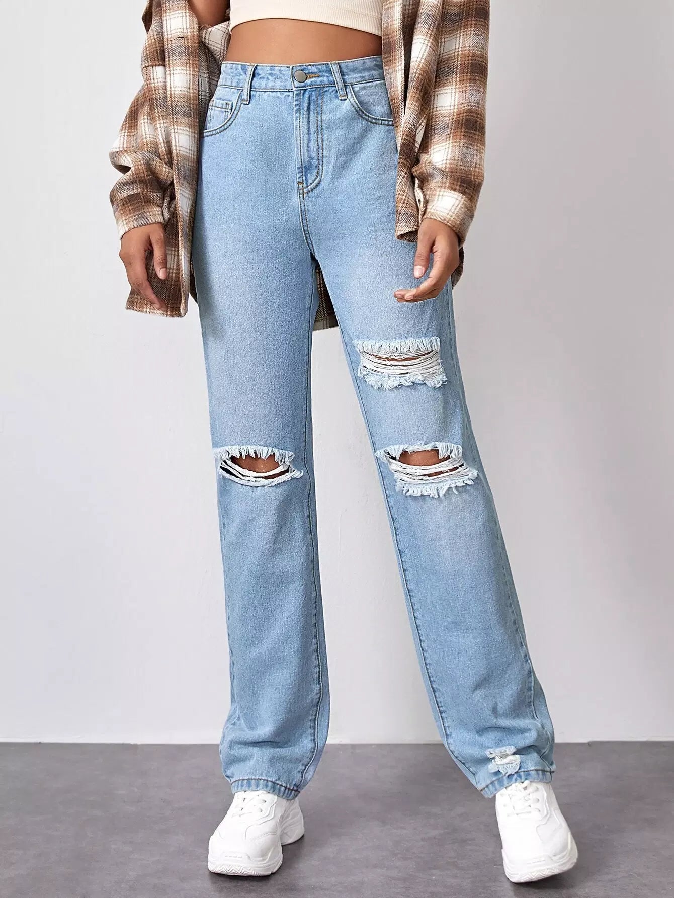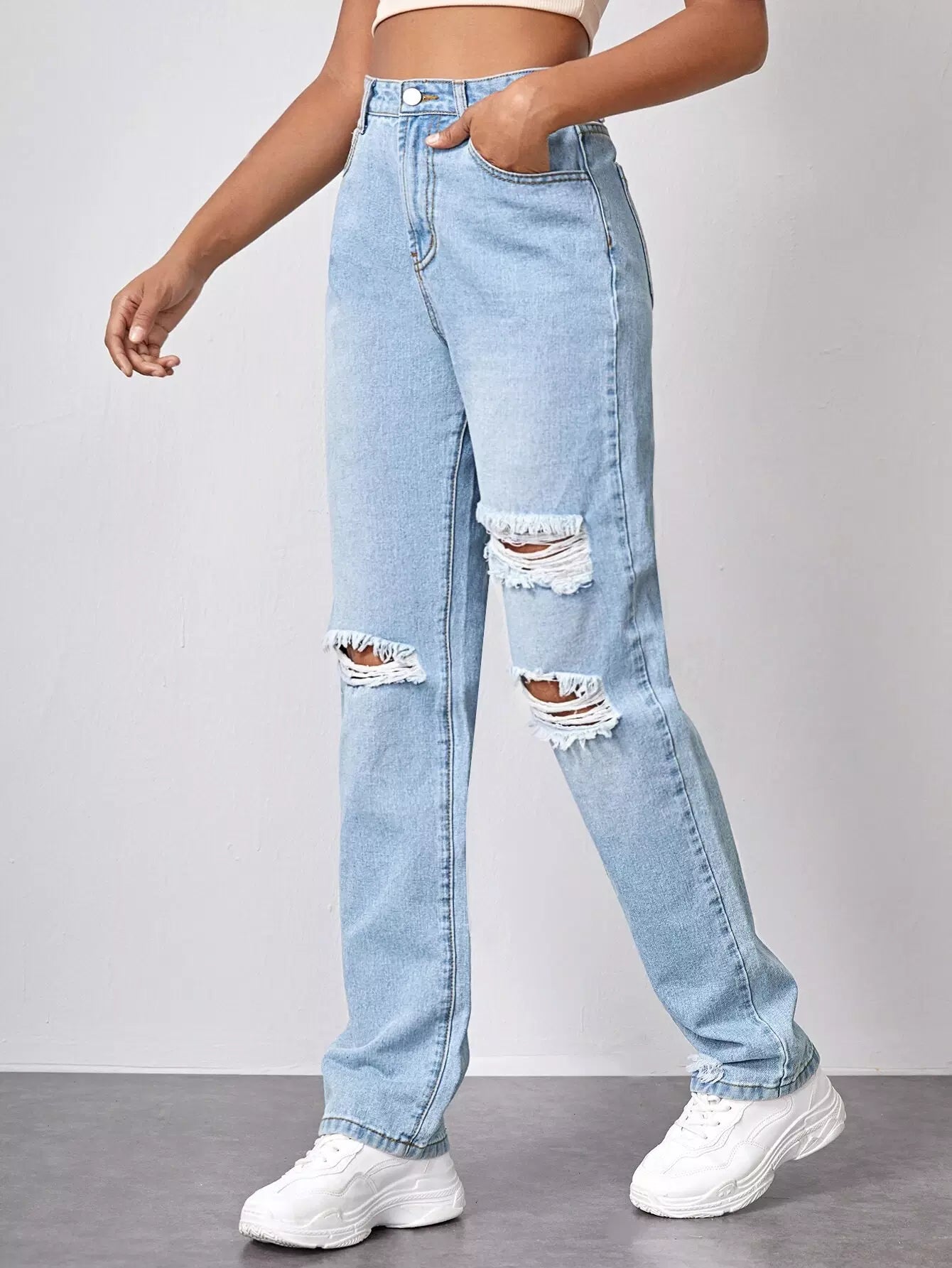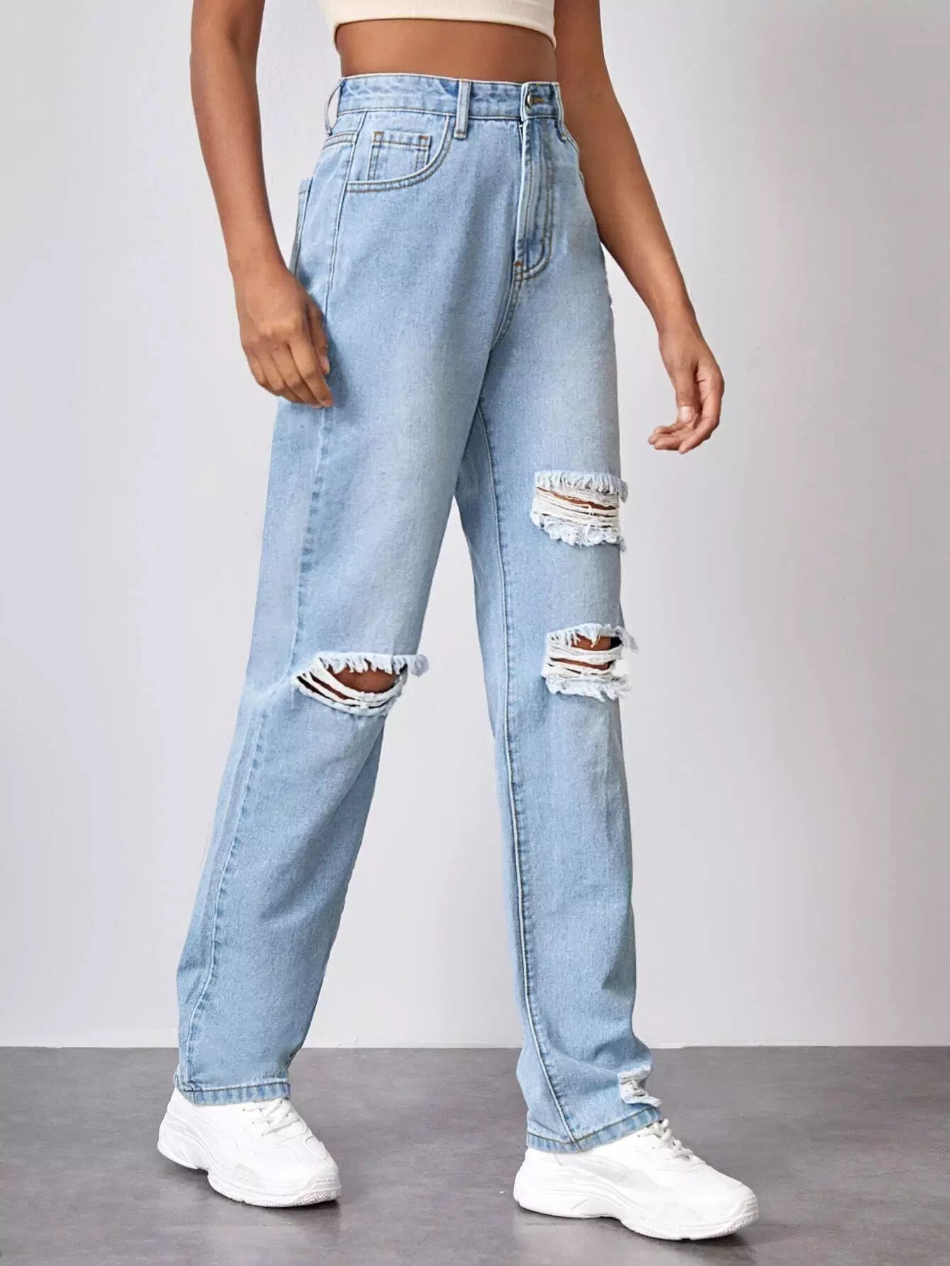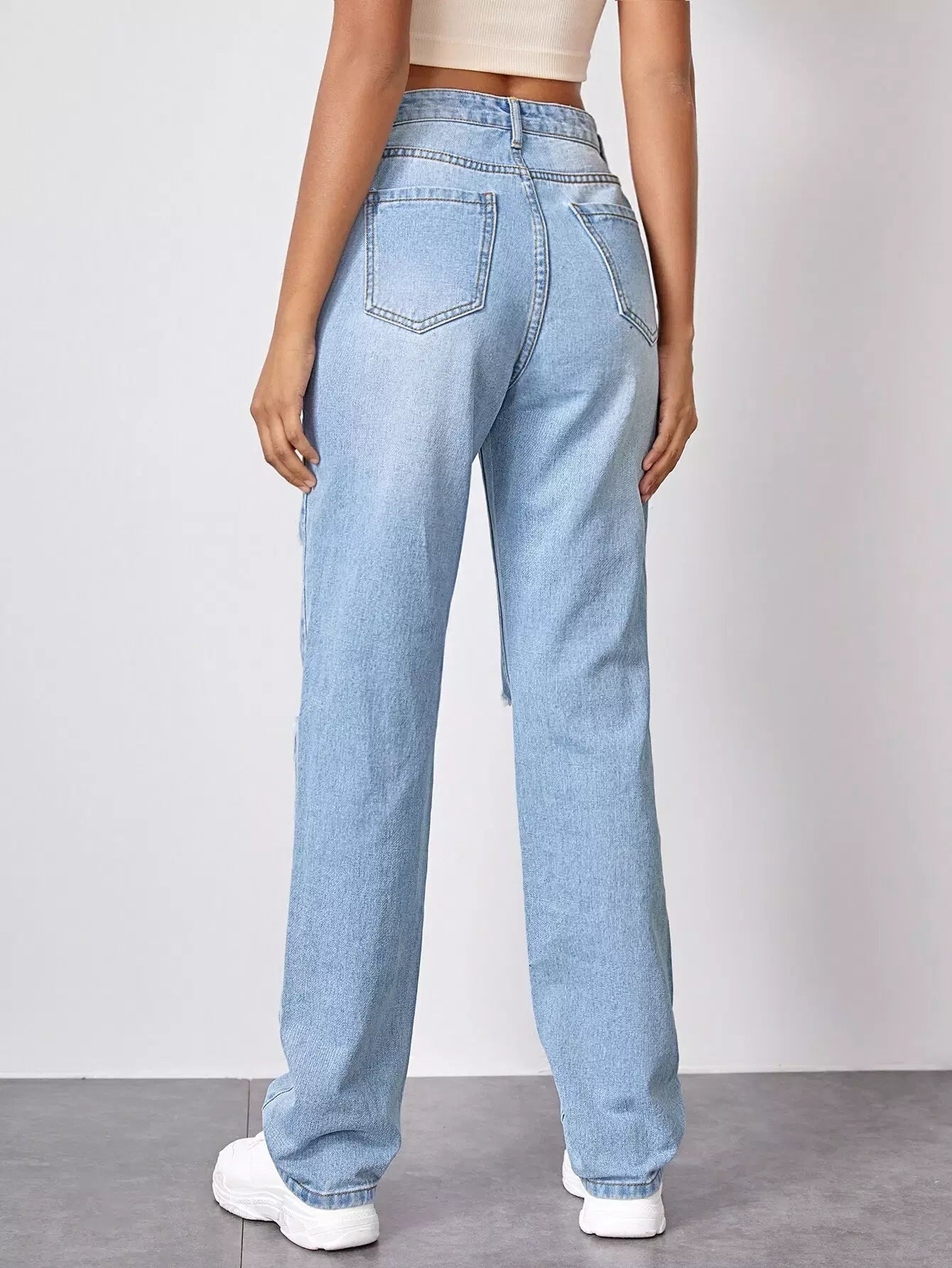 بنطلون جينز مستقيم ممزق عالي الخصر