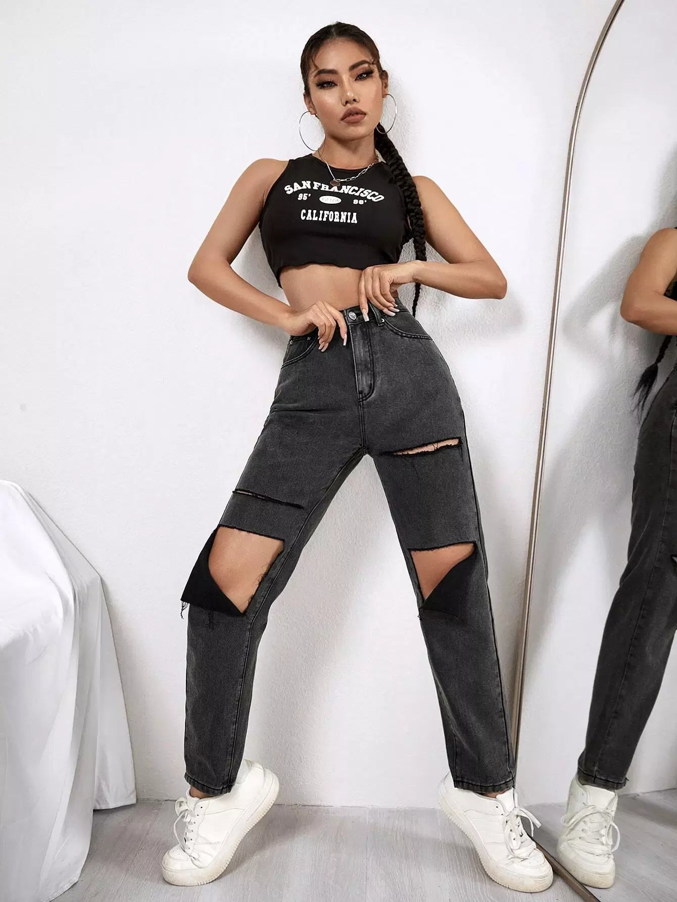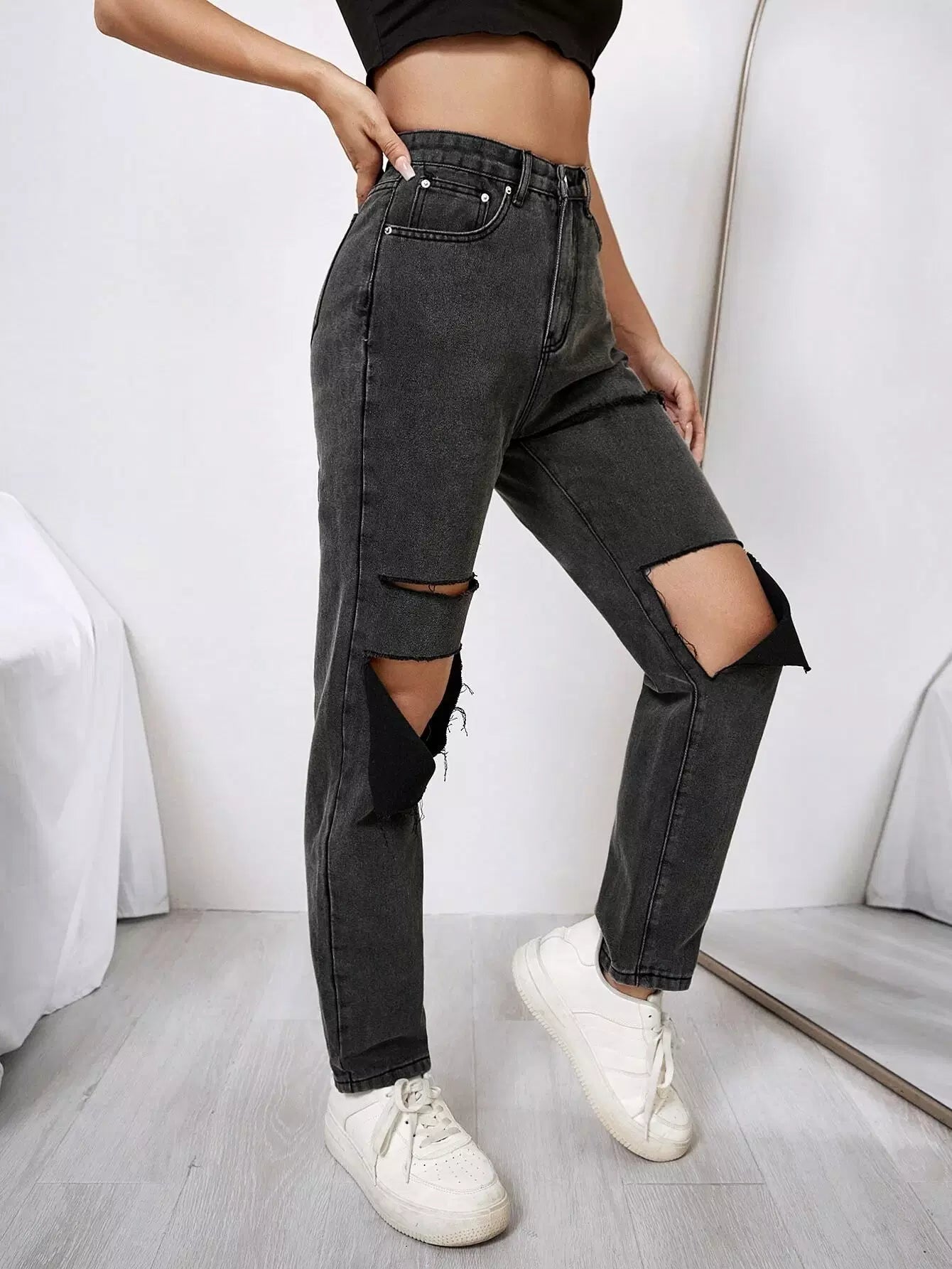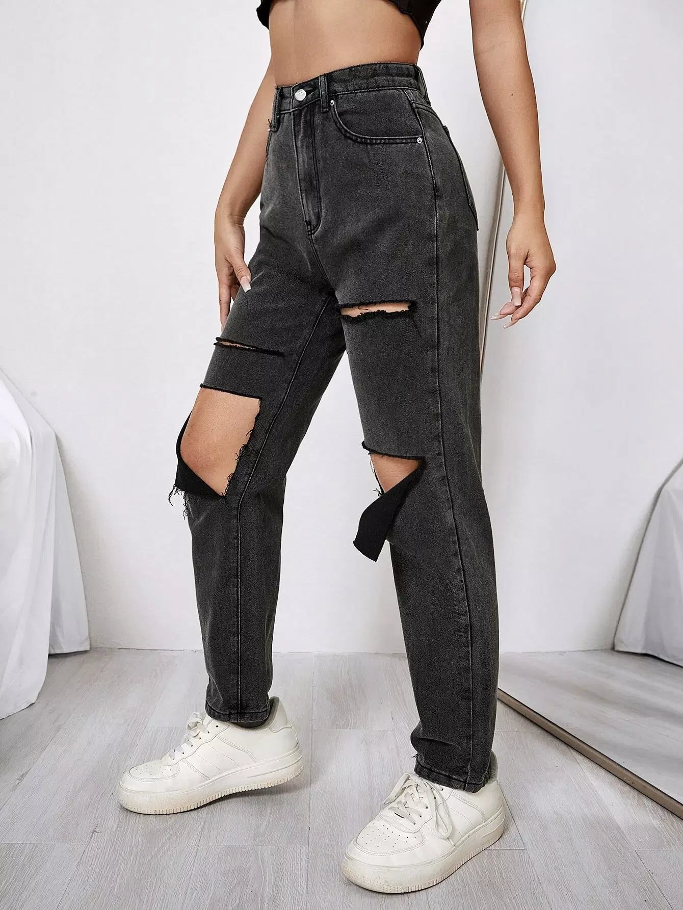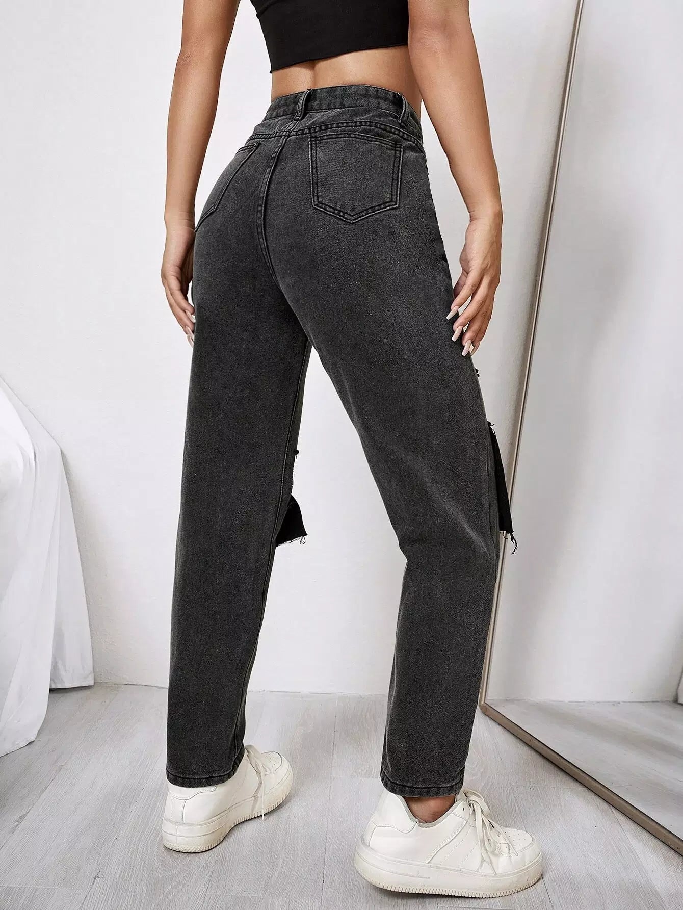 بنطلون جينز بخصر عالٍ ممزق بساق مستقيمة