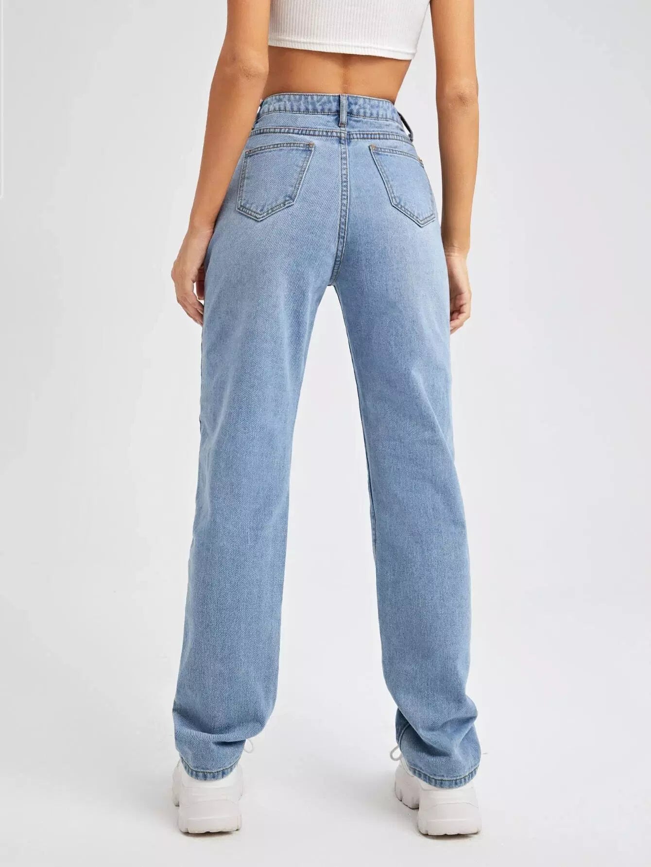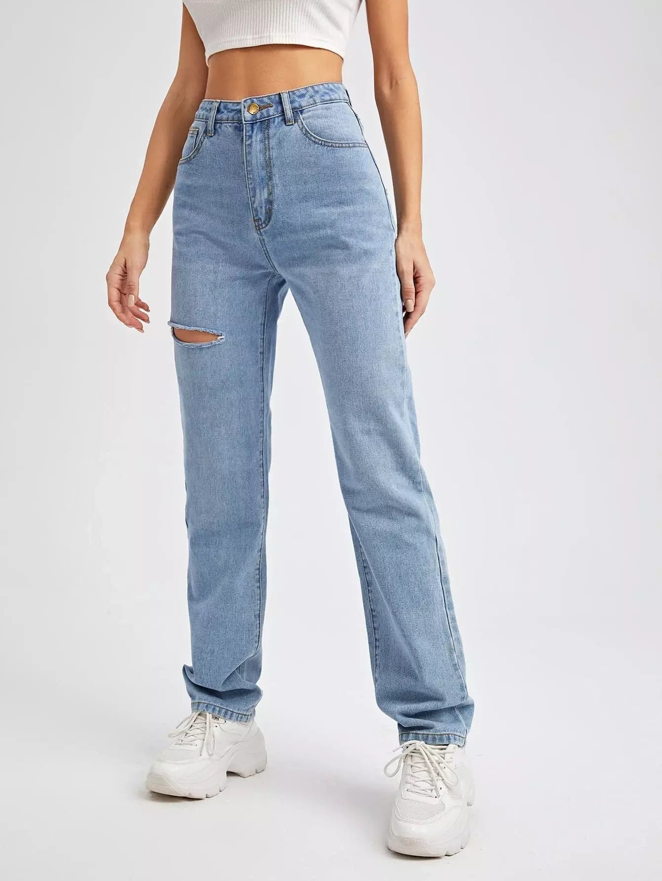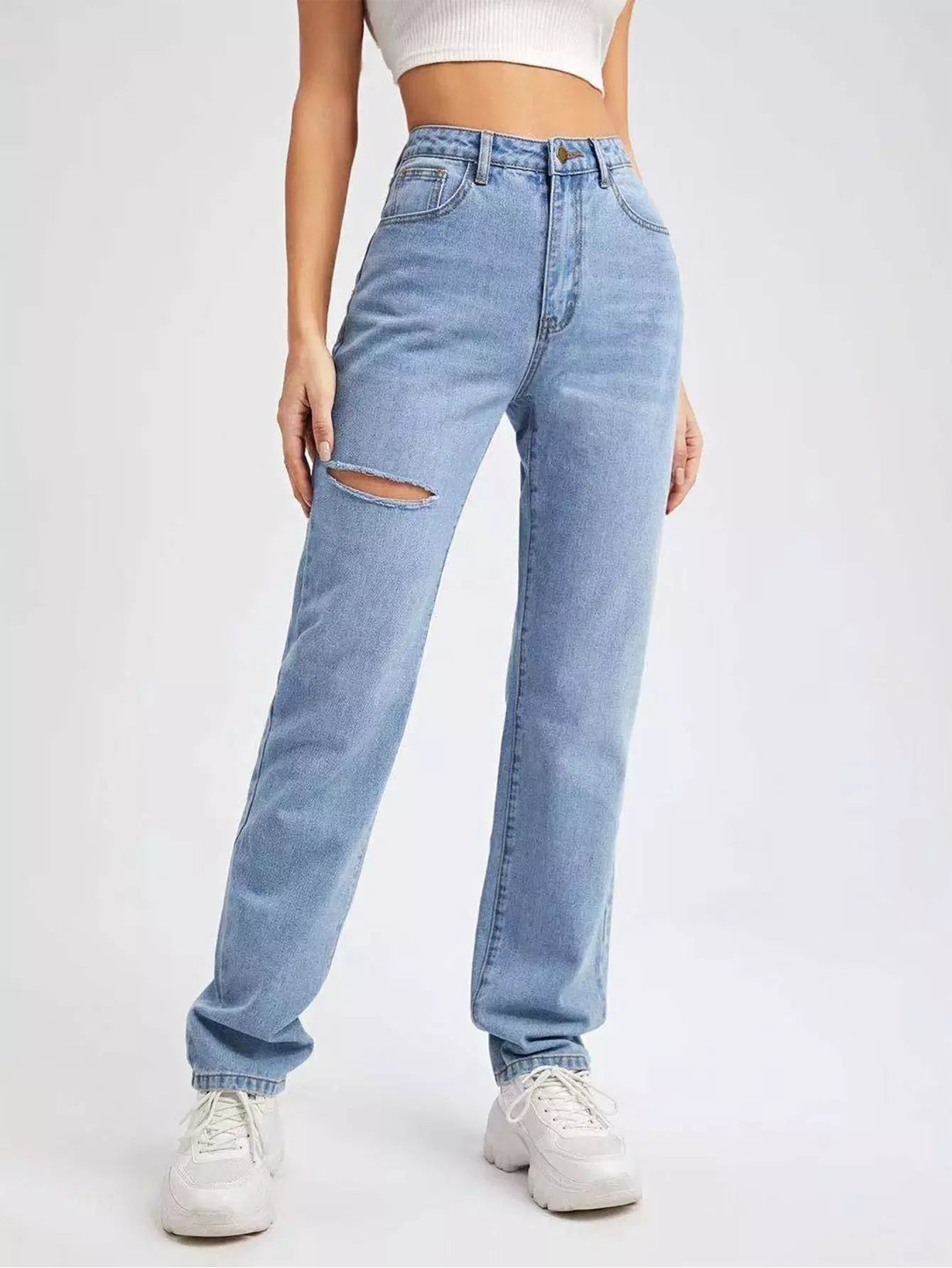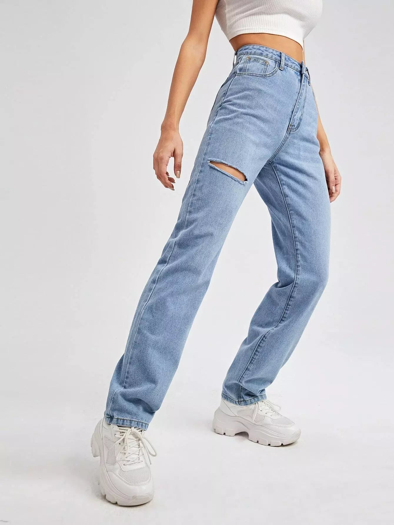 بنطلون جينز بخصر عالٍ ممزق بساق مستقيمة