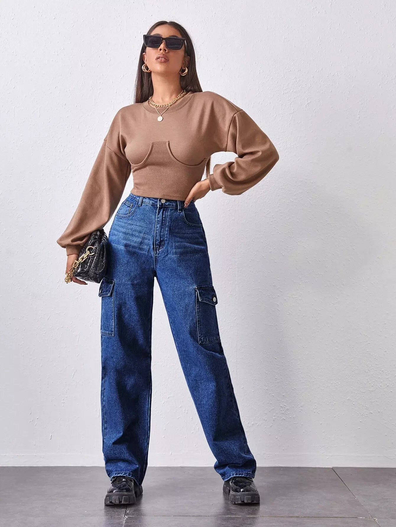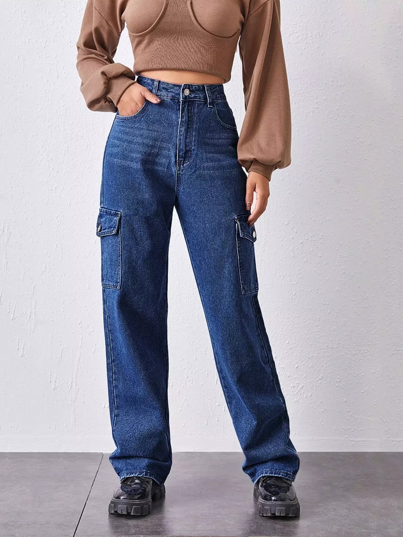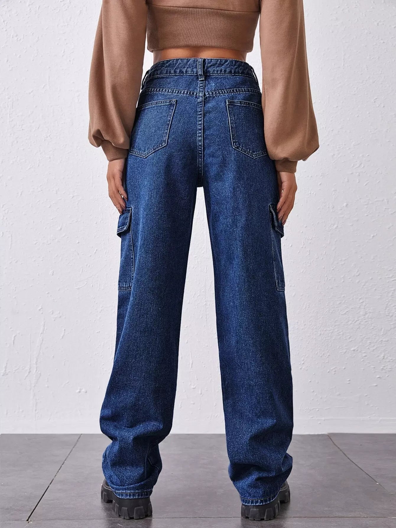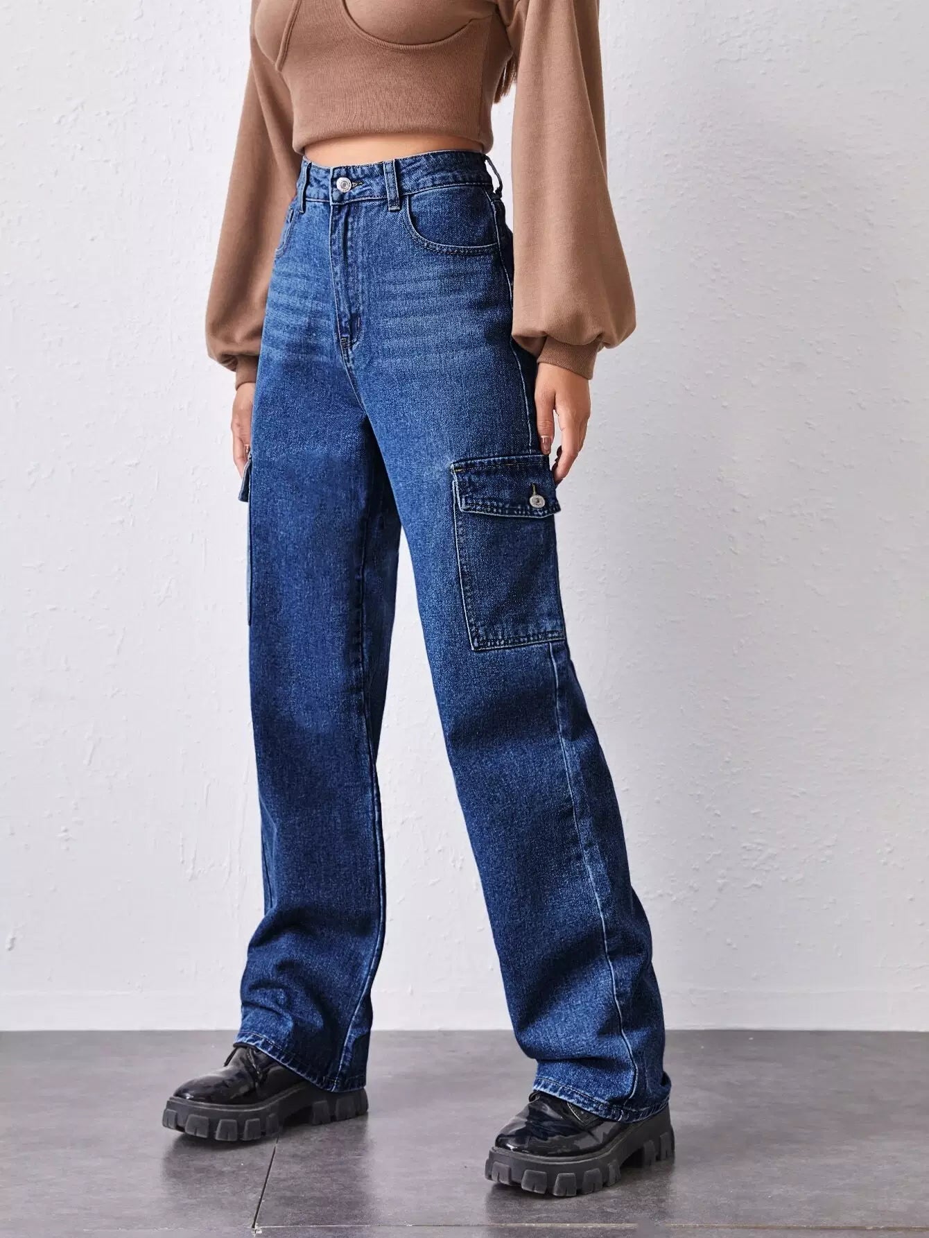 بنطلون جينز فضفاض بفتحة جانبية عالية الخصر وجيب جانبي مرتفع