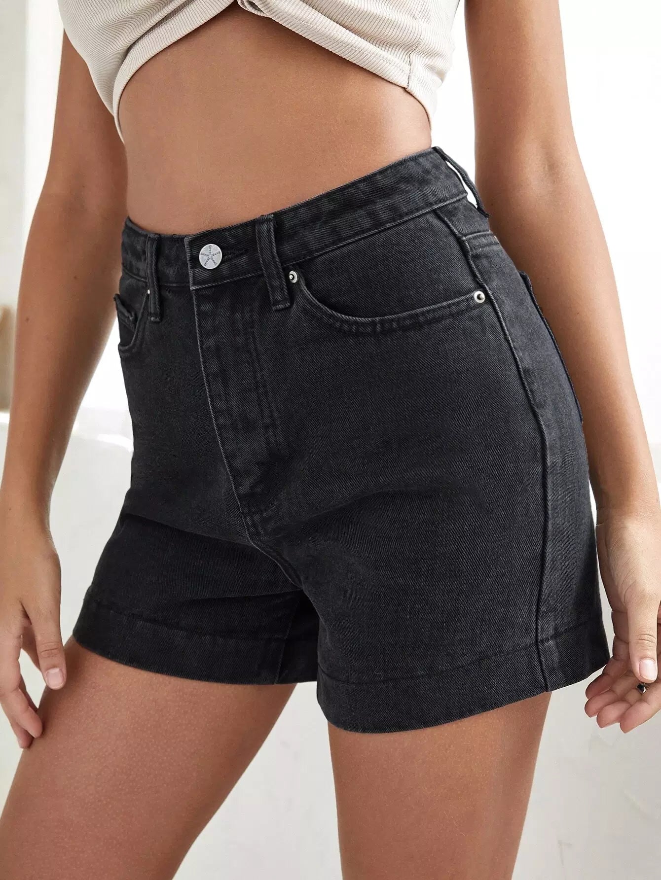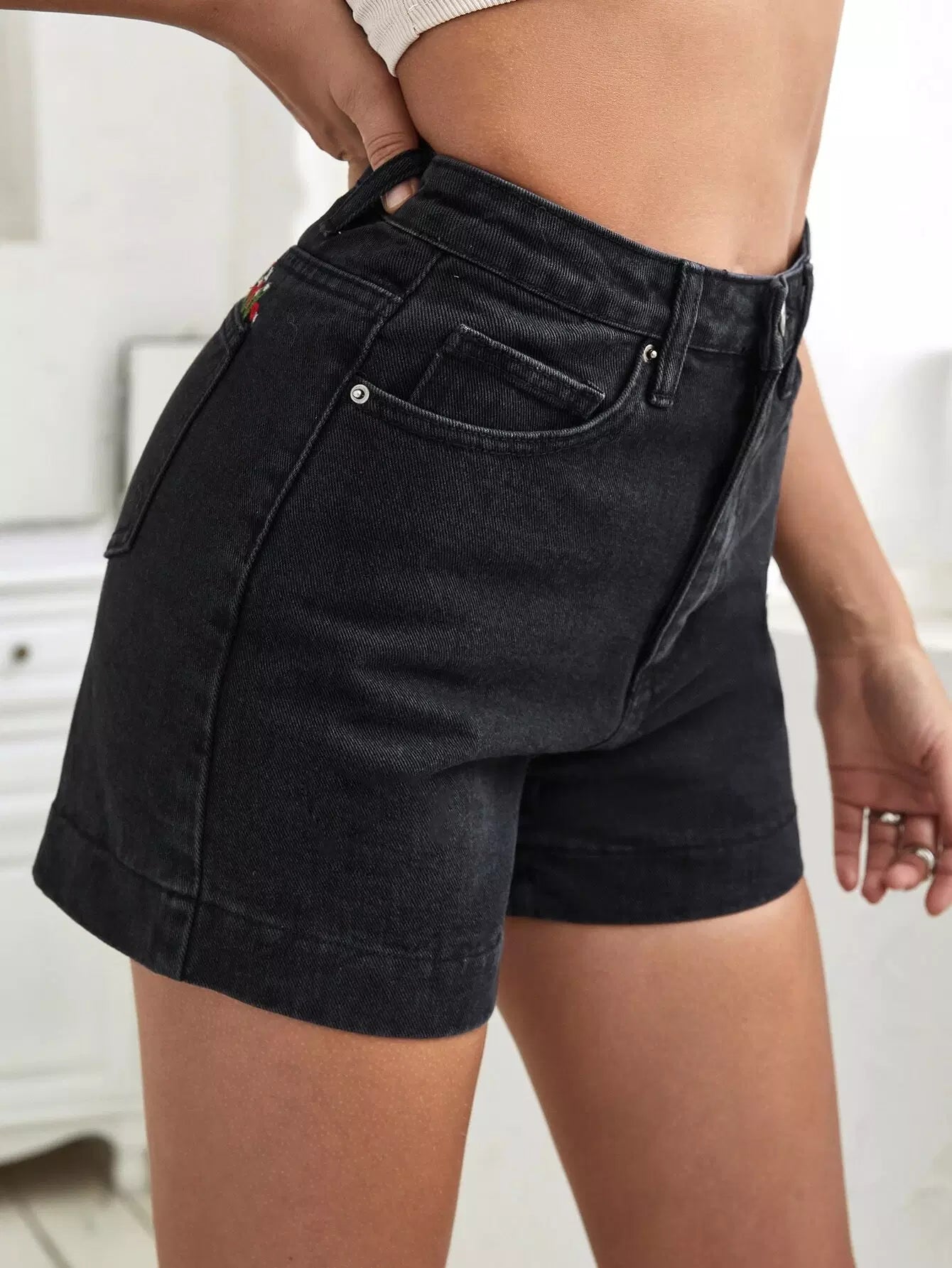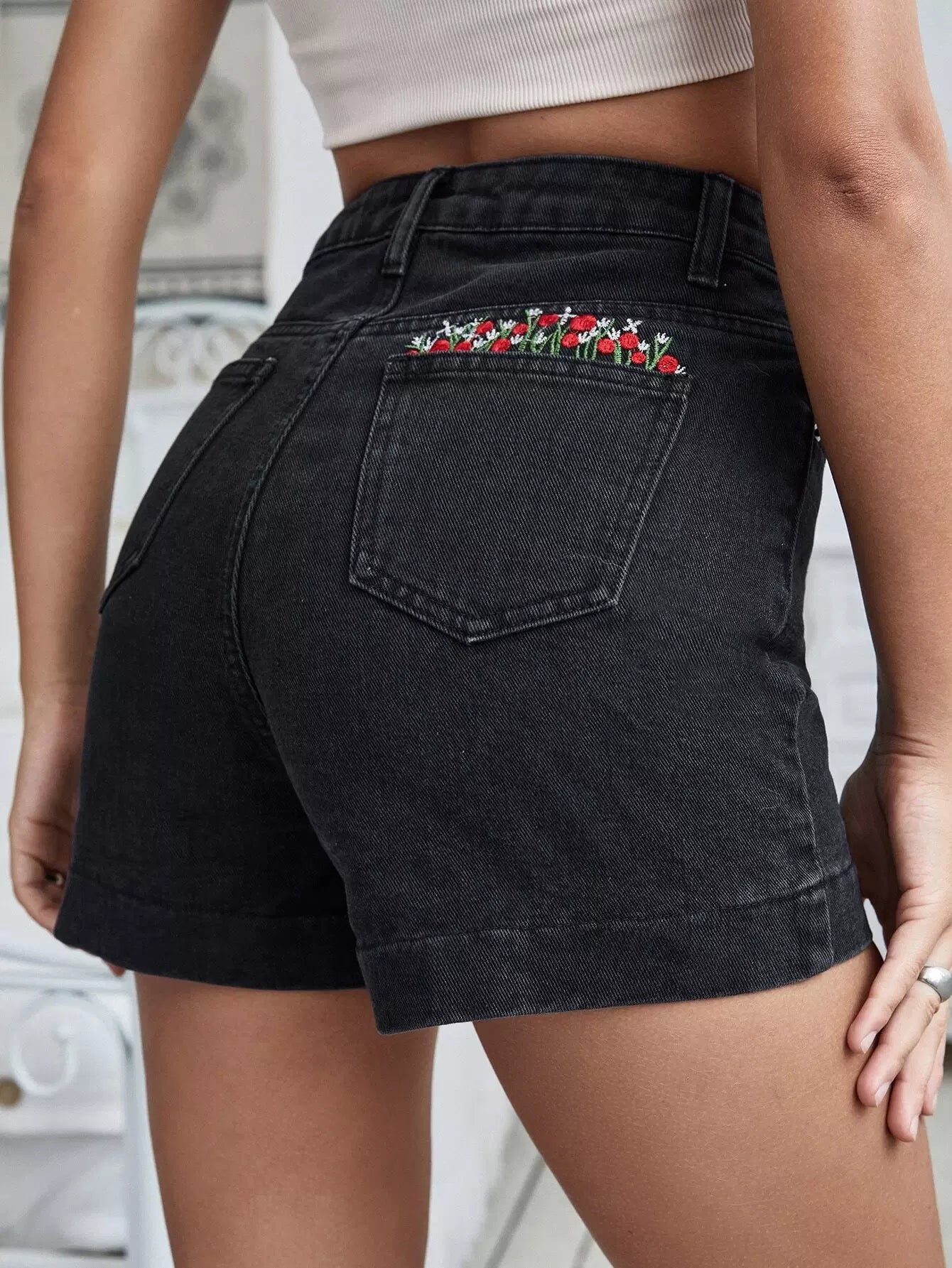 شورت دينم عالي الخصر ومطرز بالزهور بدون حزام