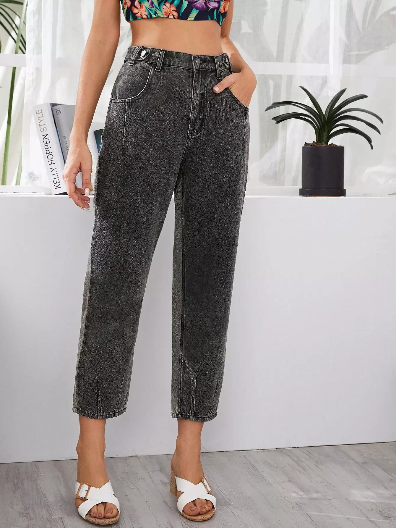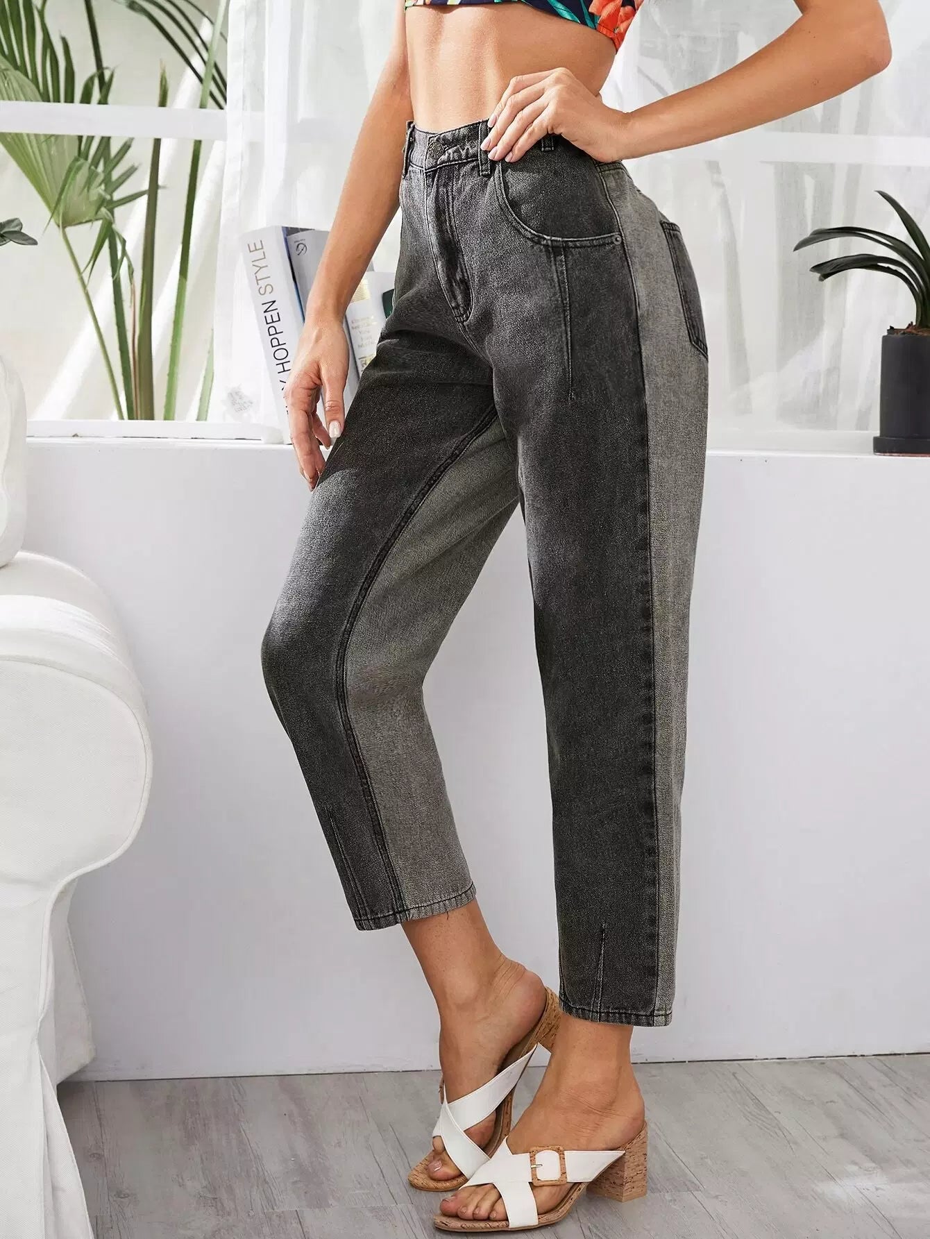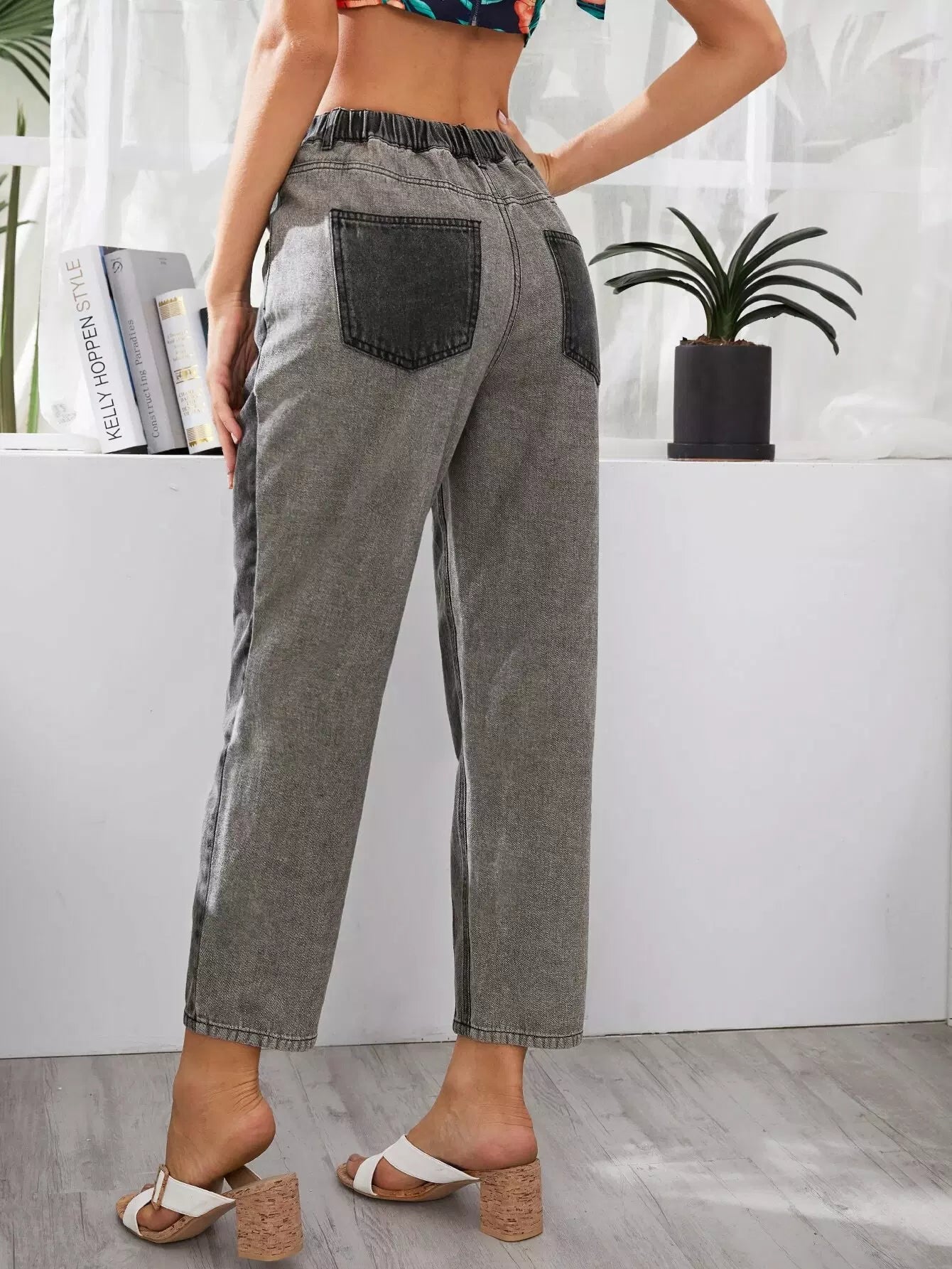 بنطلون جينز برقعة عالية الخصر بجيوب مرقعة بلونين متشابكين