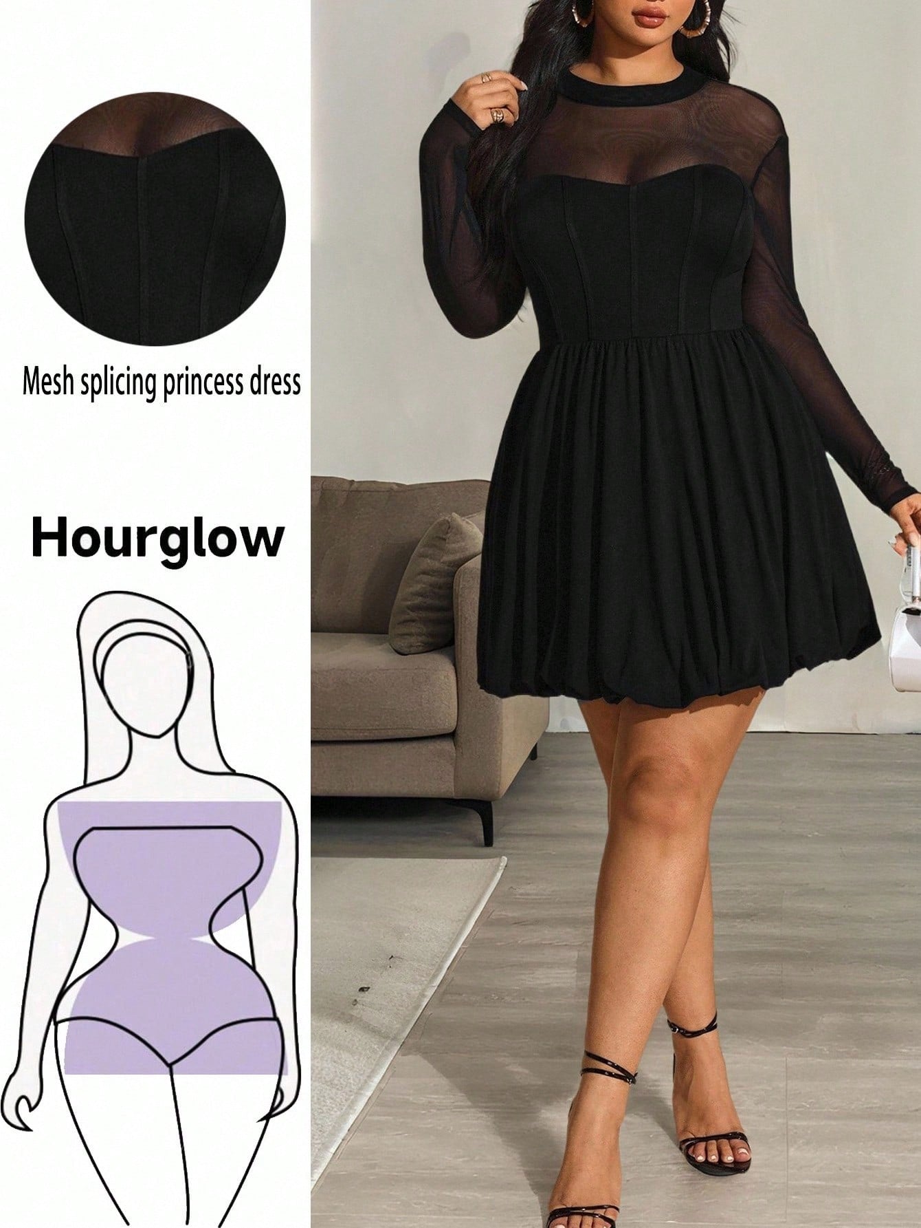فستان Hourglow نسائي بمقاسات كبيرة، بلون موحد، بياقة دائرية وأكمام طويلة، مصنوع من قماش شبكي، مناسب لفصلي الخريف والشتاء.