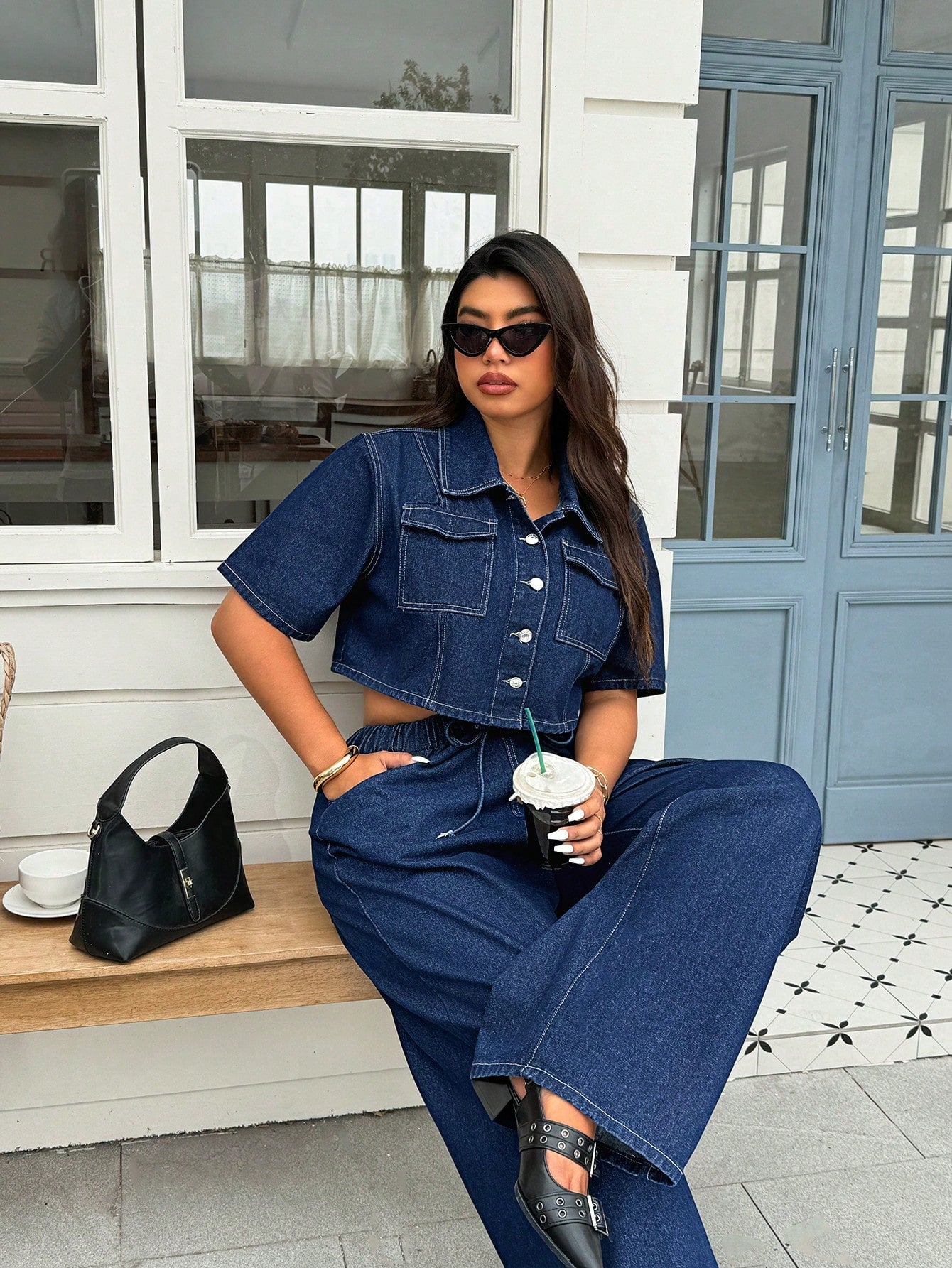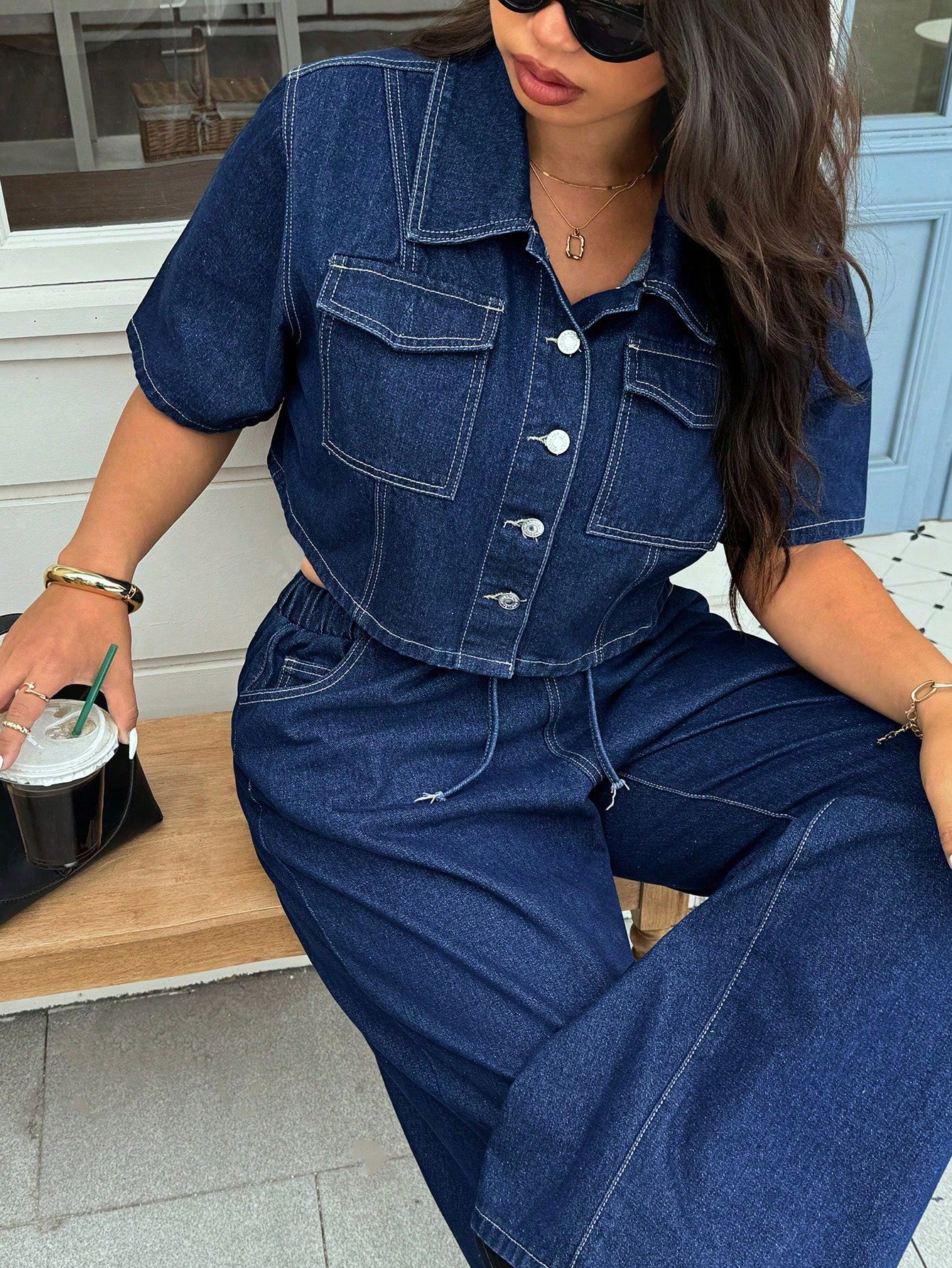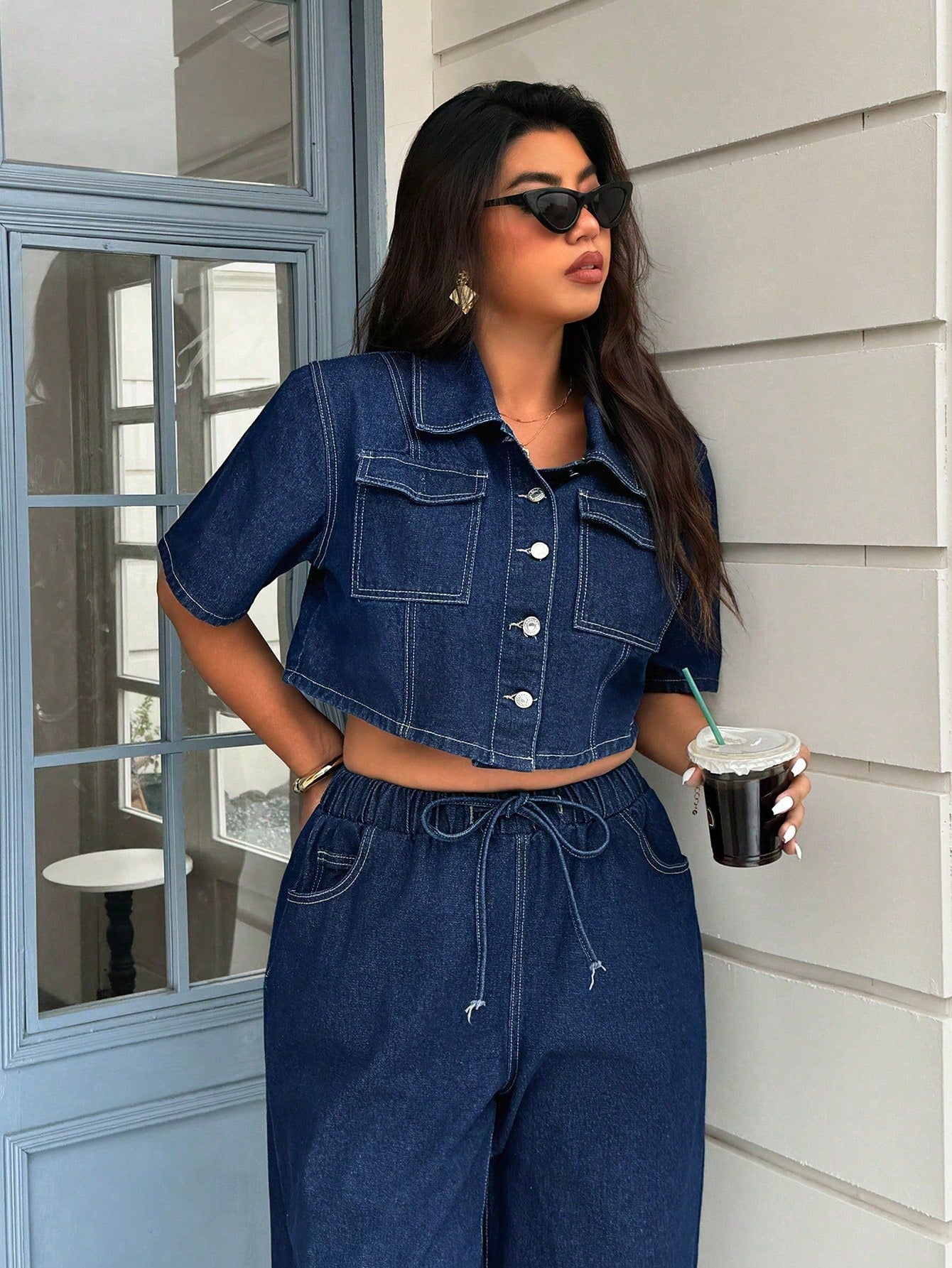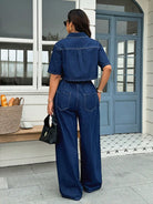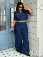 جاكيت جينز داكن مغسول بأكمام قصيرة للنساء من ICON، مقاسات كبيرة، عصري، بمقاسات كبيرة.