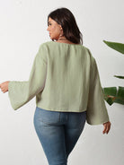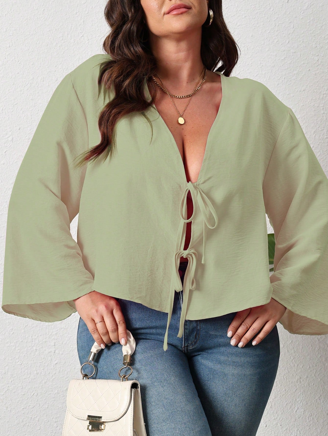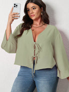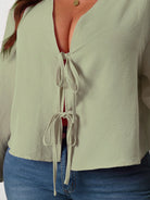 women INAWLY Plus Size Women's Solid Color Long Sleeve Front Tie Loose Casual Blouse
