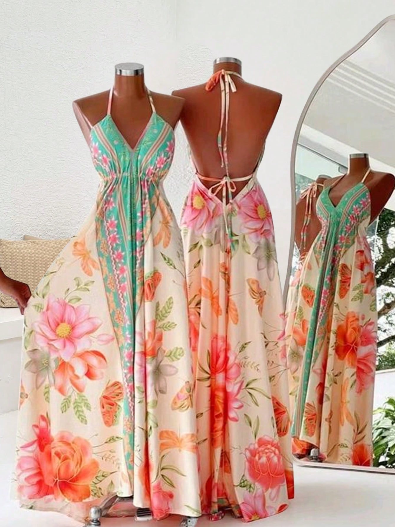فستان ماكسي نسائي من إيناولي مطبوع عليه زهور، مكشوف الظهر، بياقة هالتر