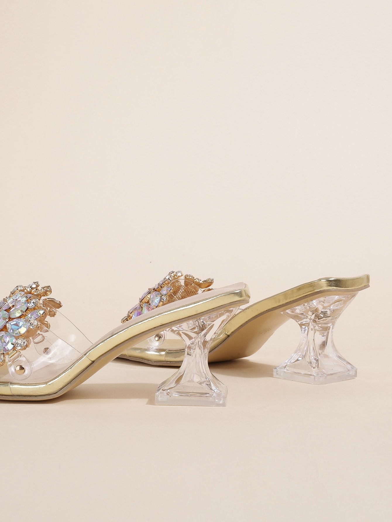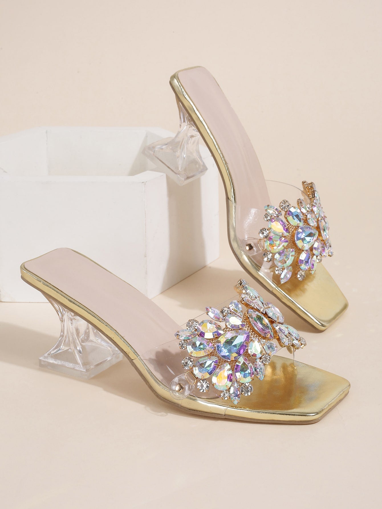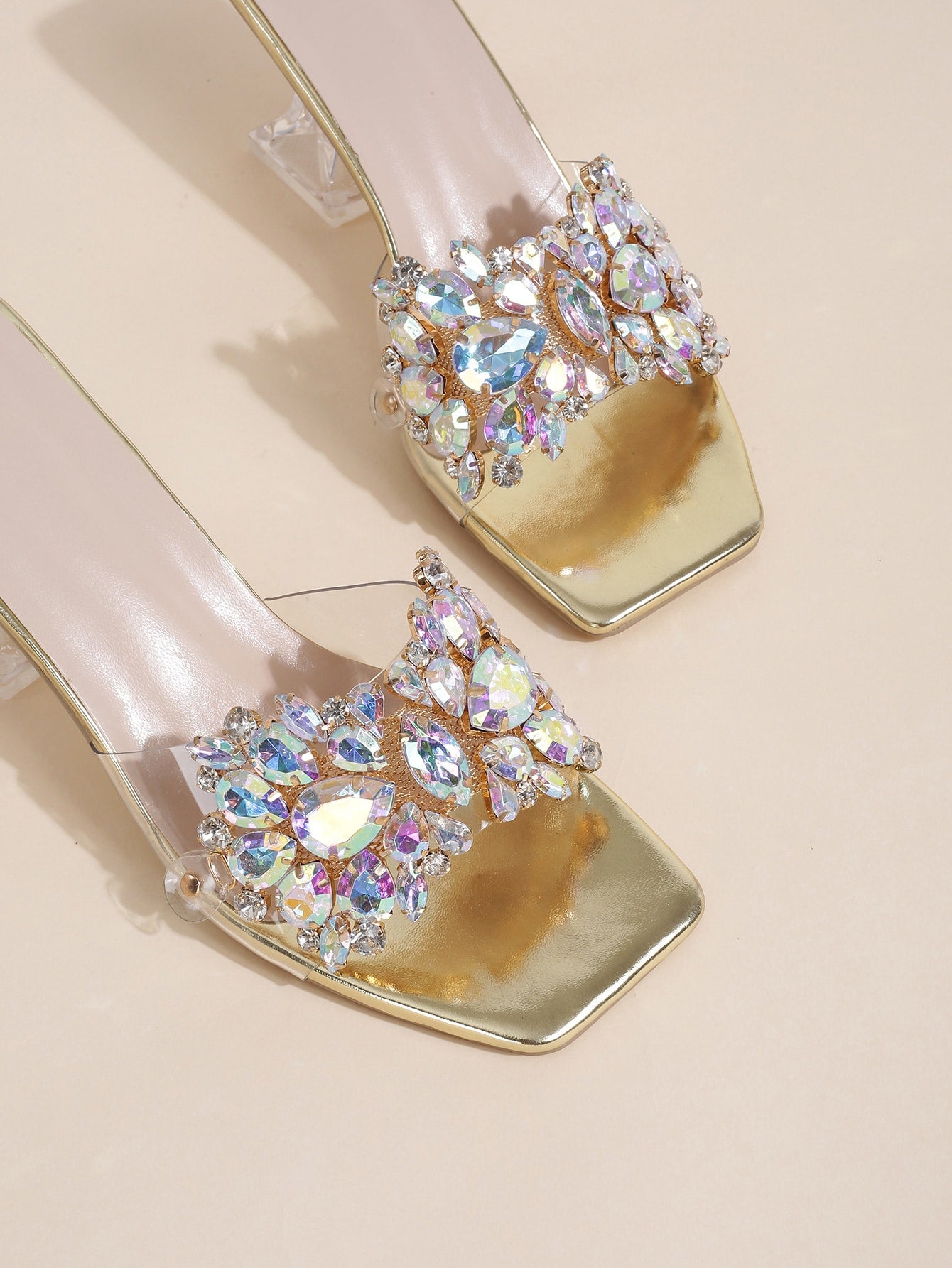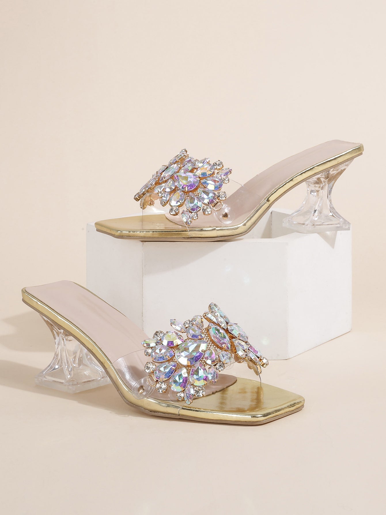 صندل مفتوح بكعب منحوت شفاف مزين بالجواهر