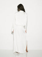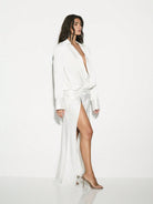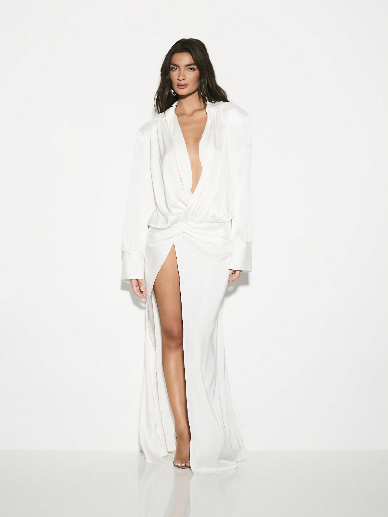 women KIZN KIZN - F Elegant Plunge Neck Draped Maxi Dress With Long Sleeves Formal Evening Wedding Guest Gathered Waist Special Occasion Gown Luxury Collection