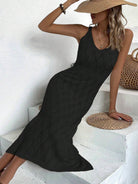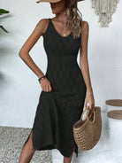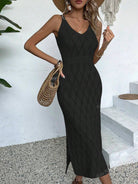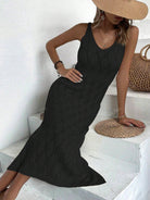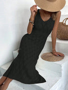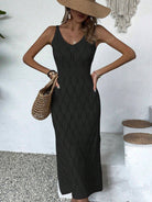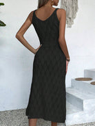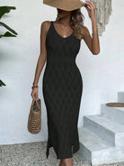 Knit Mix Women Casual V-Neck Solid Color Crochet Split Hem Dress, All White Summer Butter Yellow Back