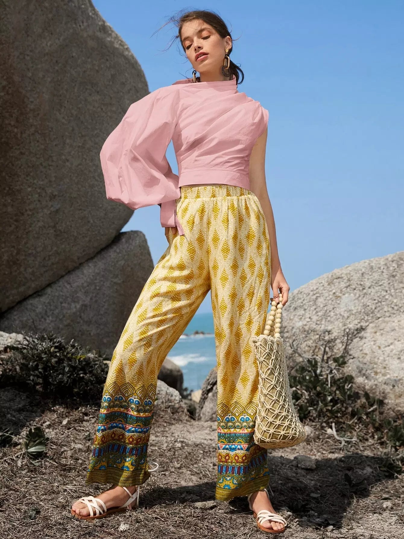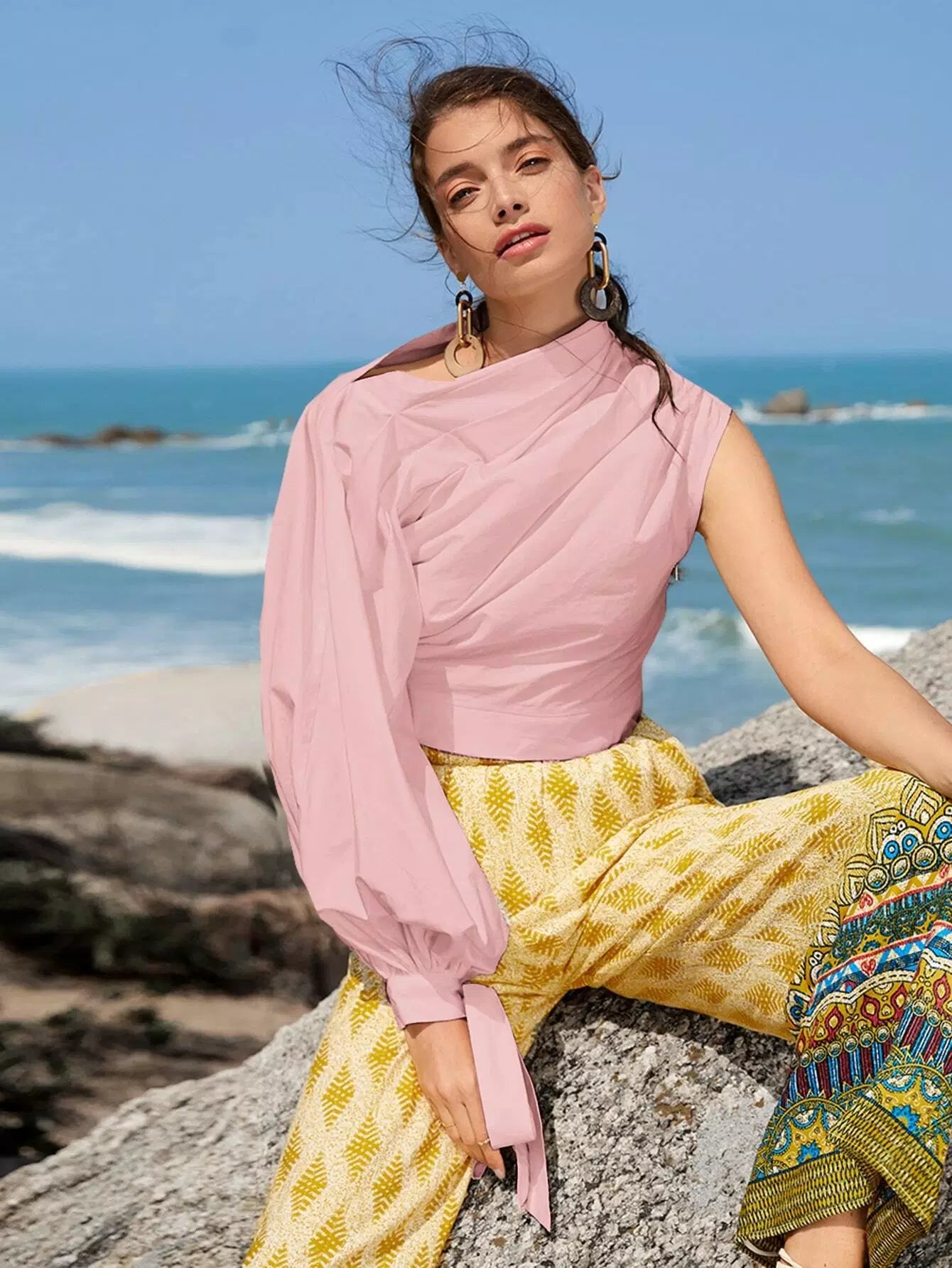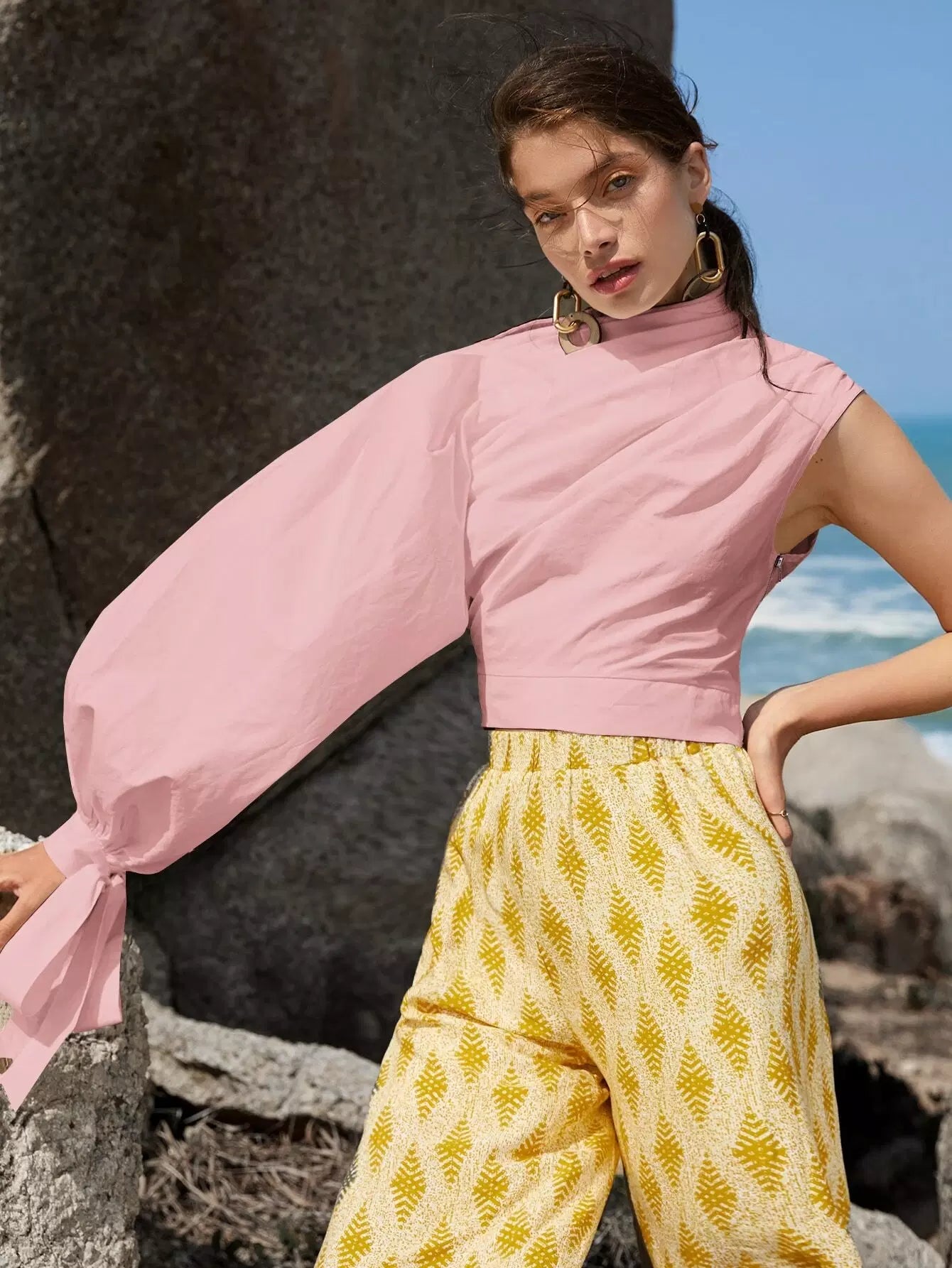 بلوزة بأكمام مكشكشة ذات عقدة بأكمام فانوسية