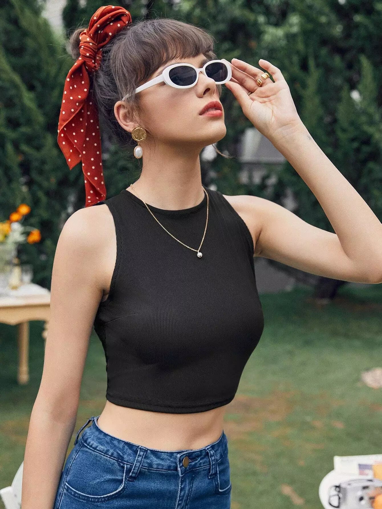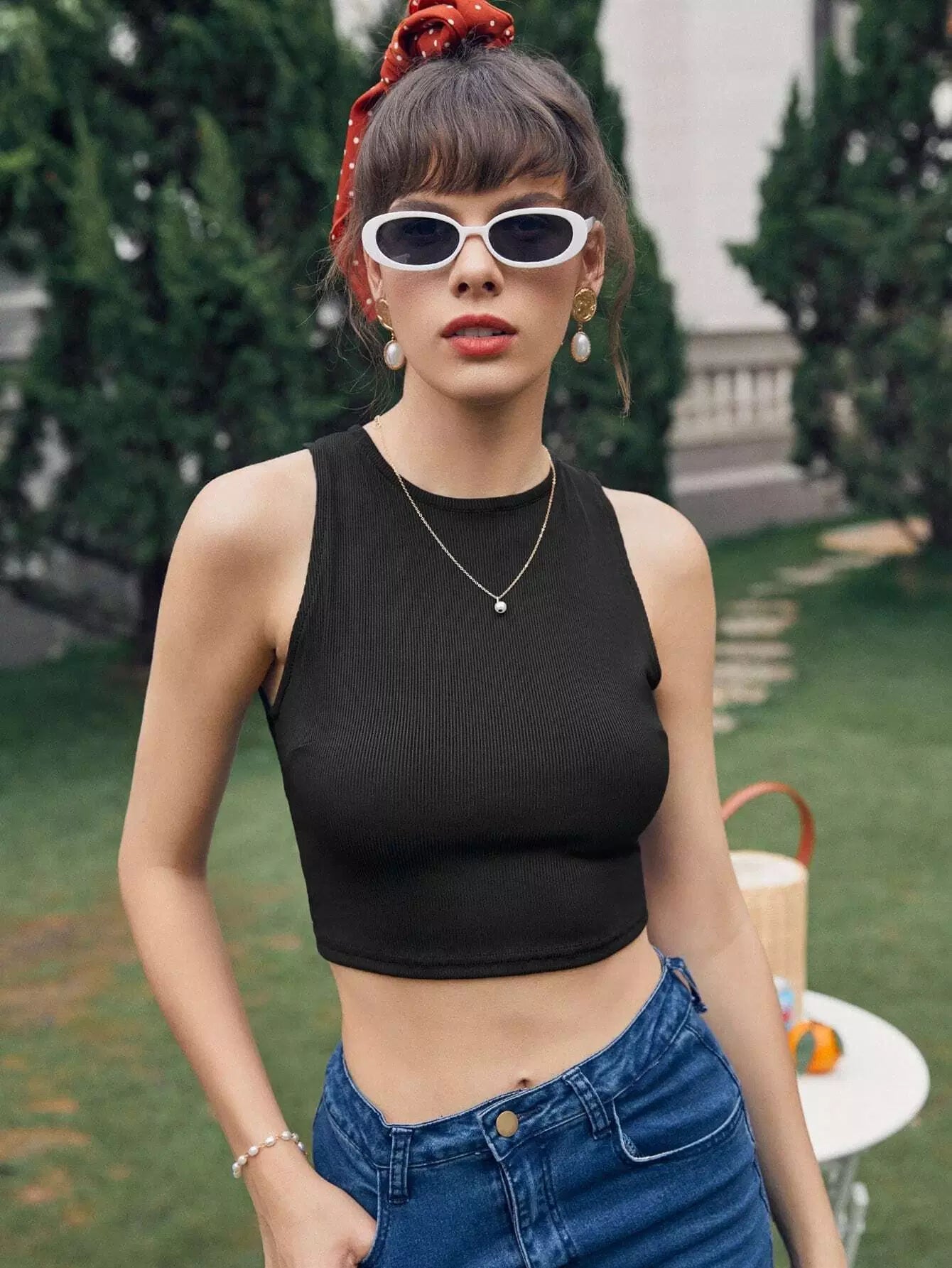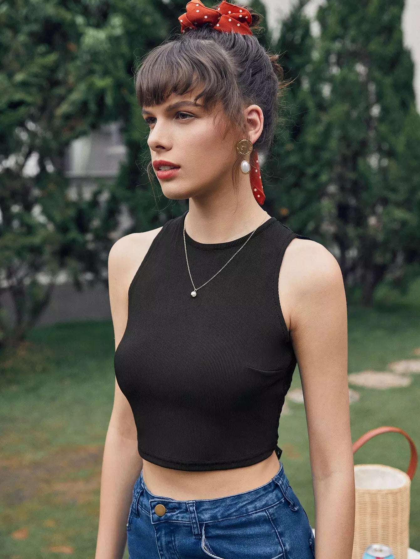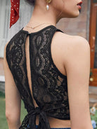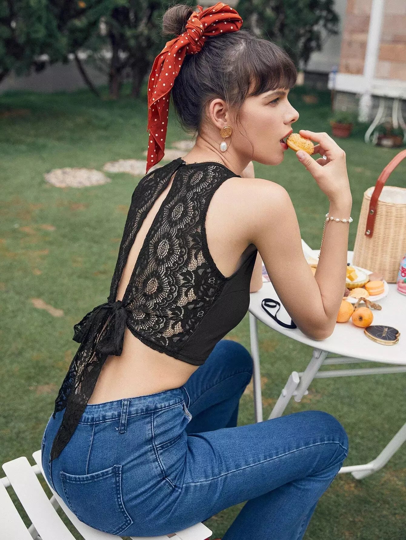 تانك بدون أكمام محبوك من الدانتيل ومفتوح من الخلف برباط منشق ومحبوك على شكل ضلع