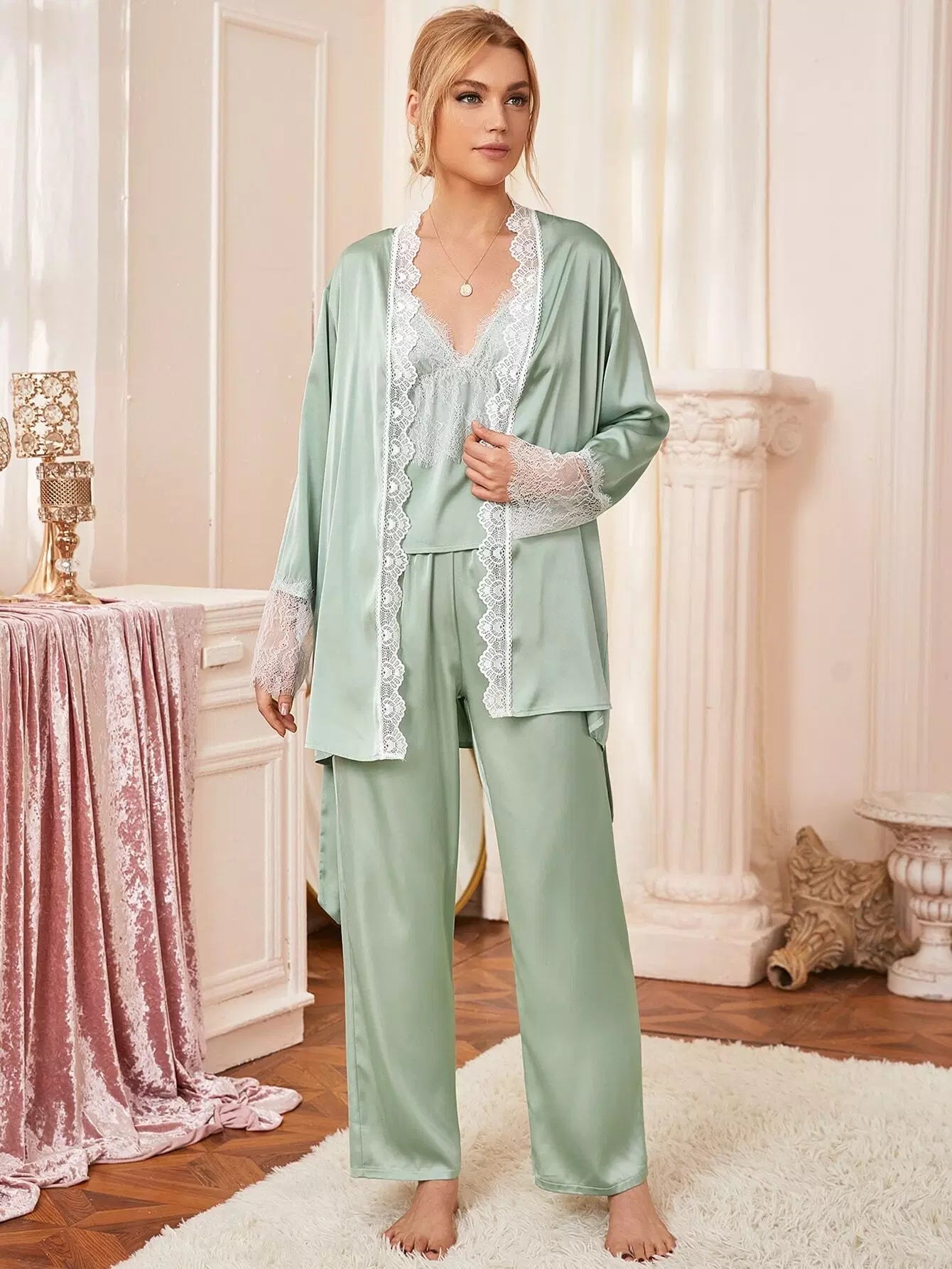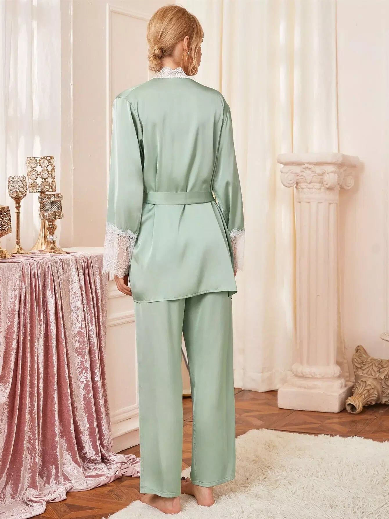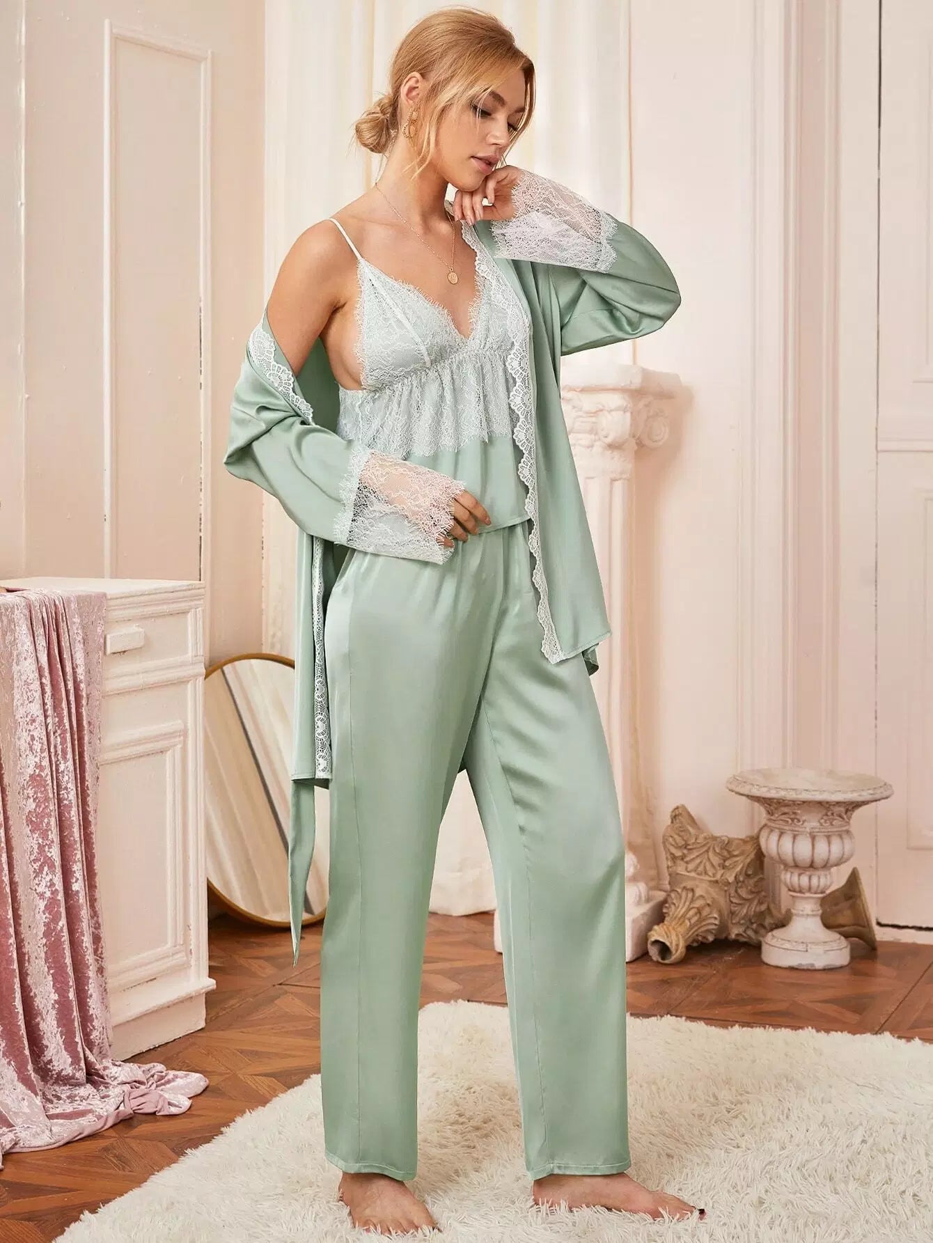 طقم بيجامة بنطلون وقميص دانتيل مع روب