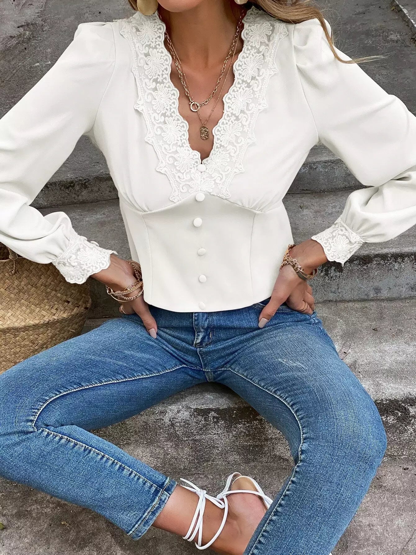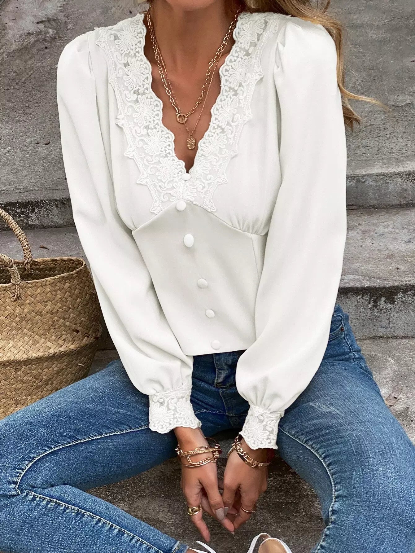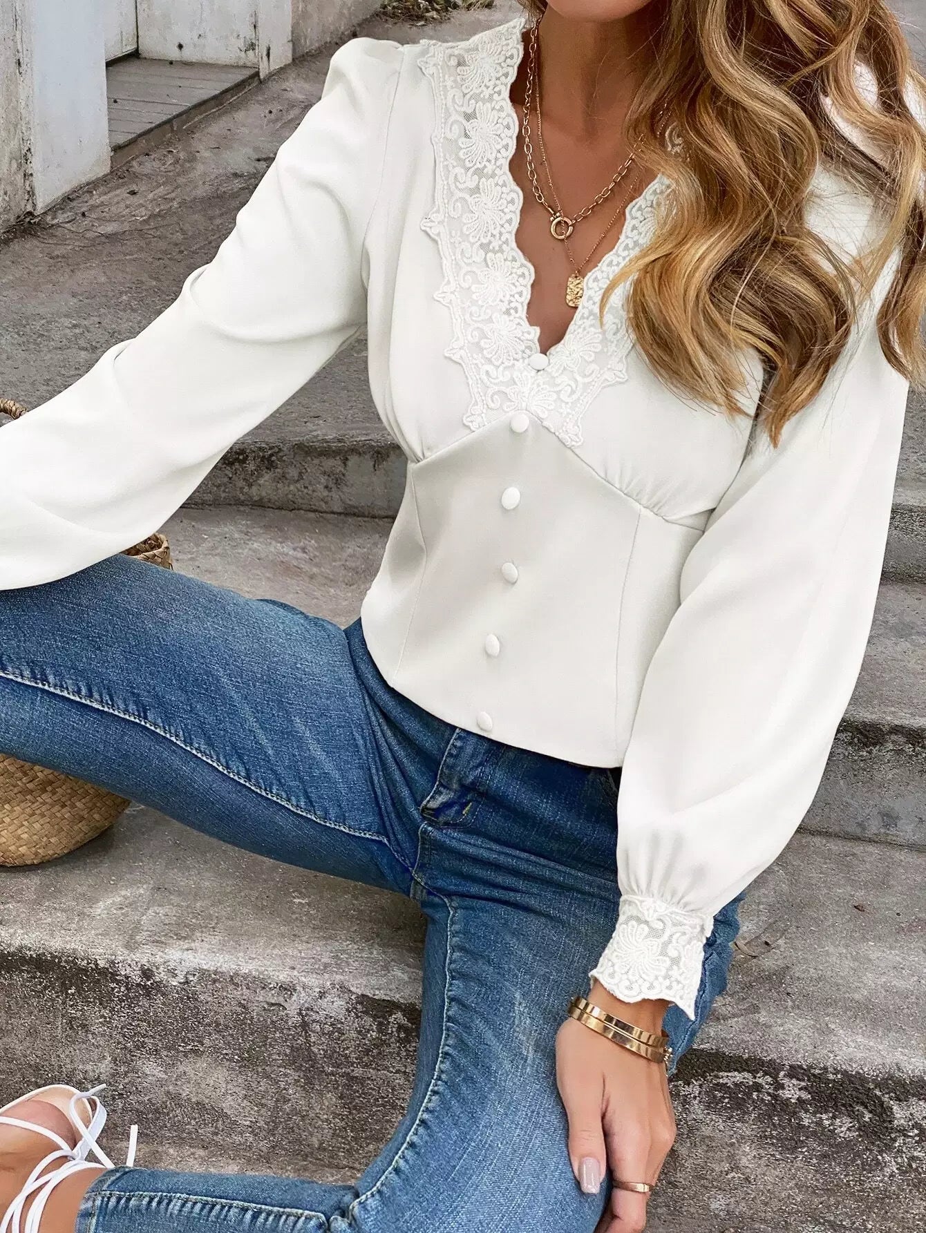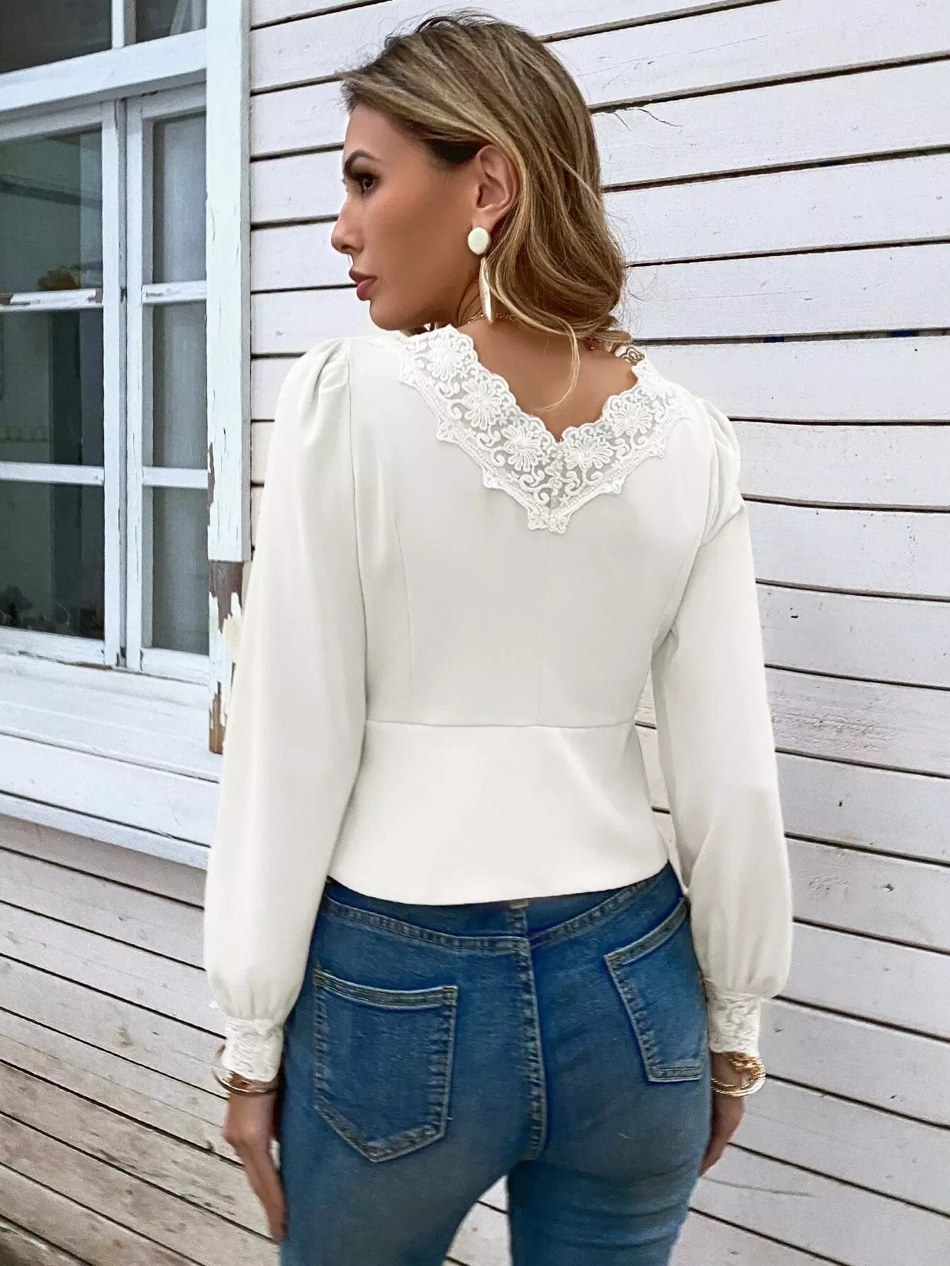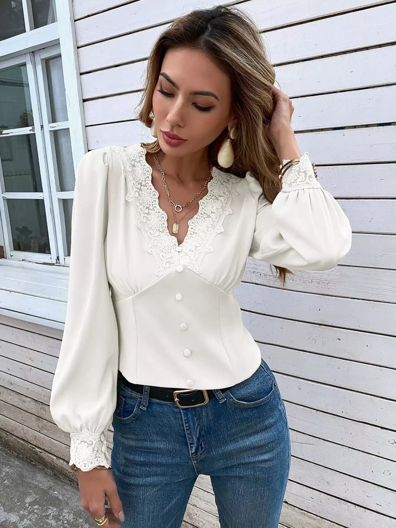 بلوزة بأكمام منتفخة من الدانتيل