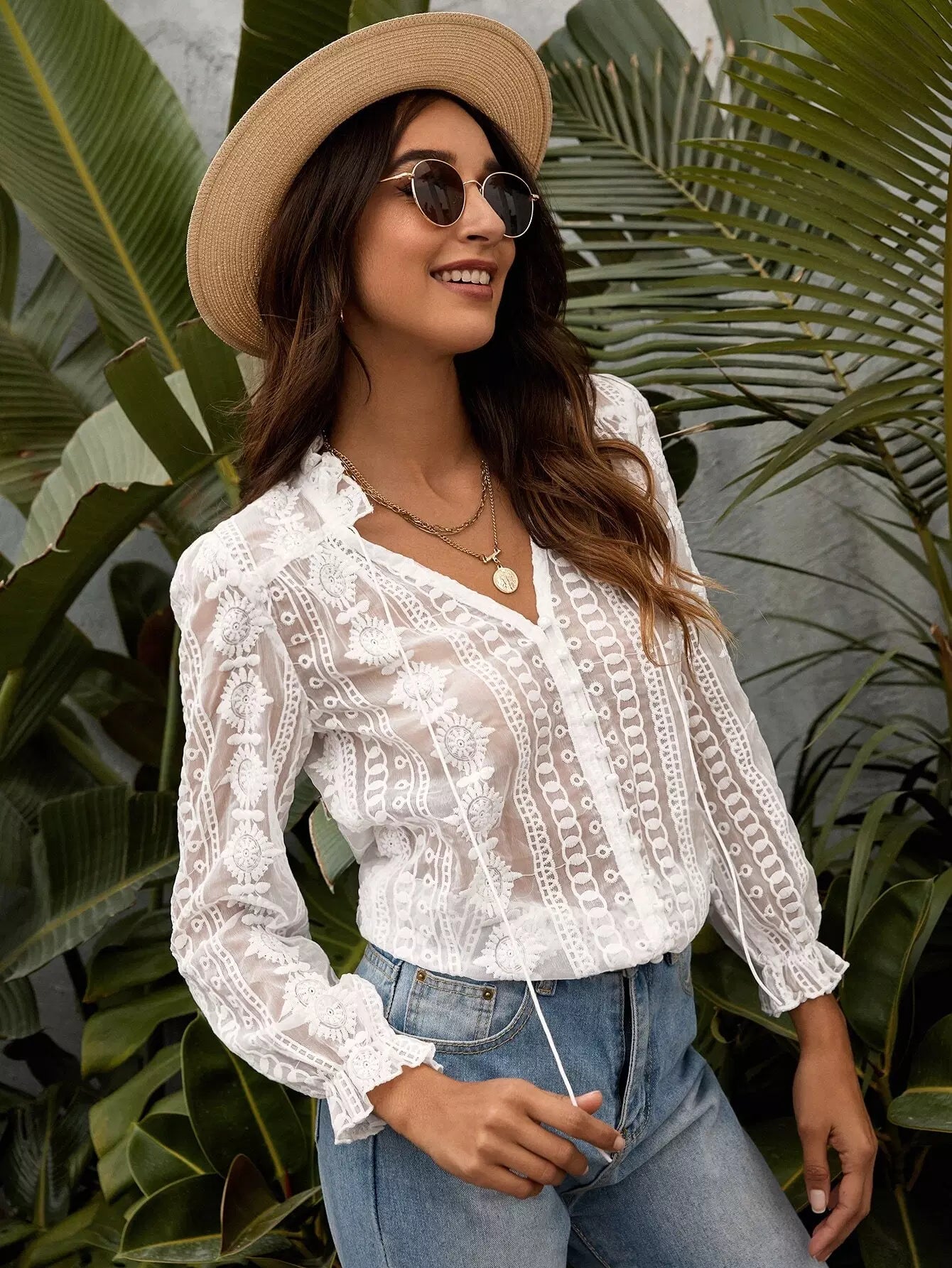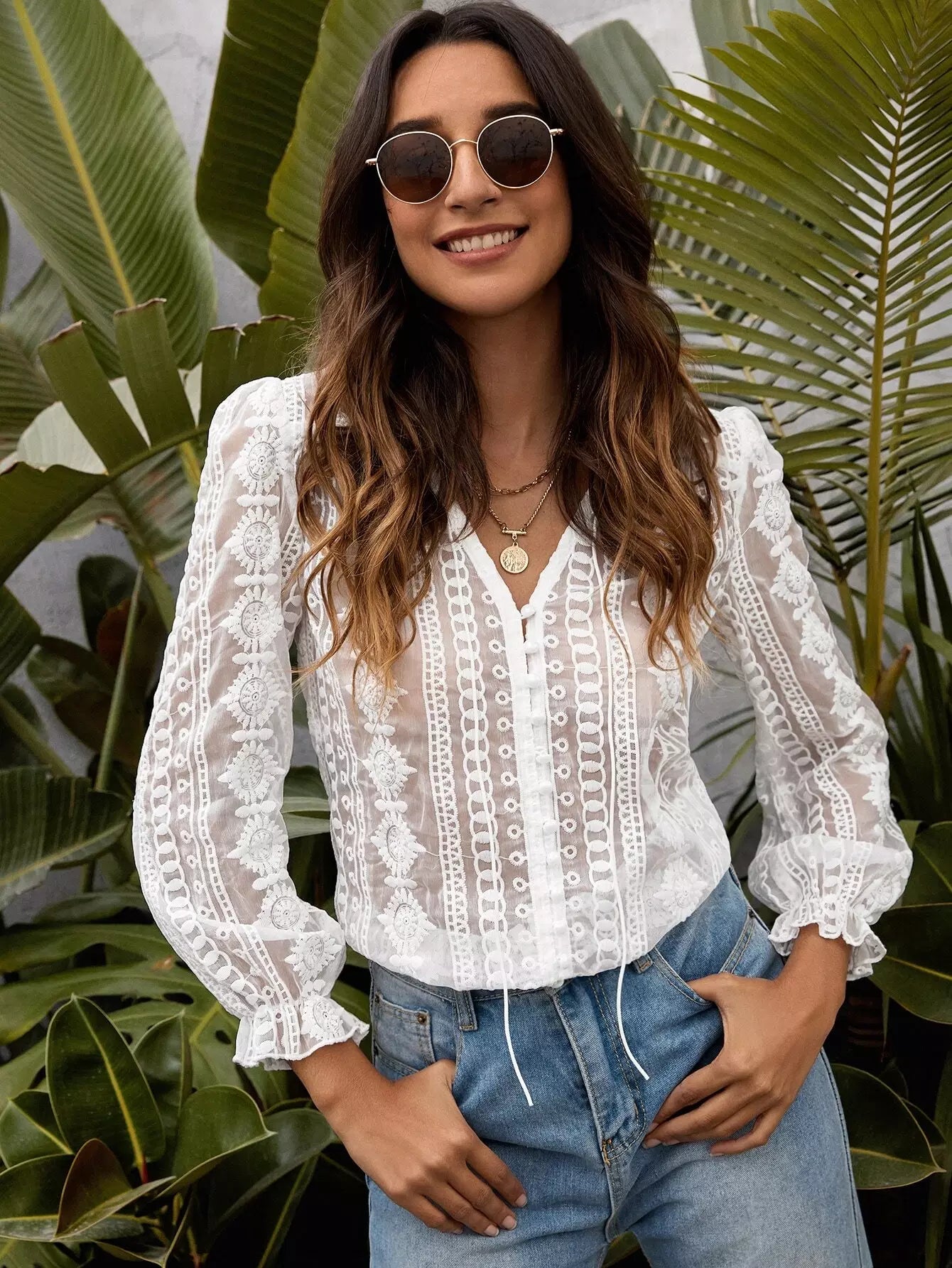 بلوزة بأكمام دانتيل شفافة بأكمام كشكش شفافة