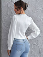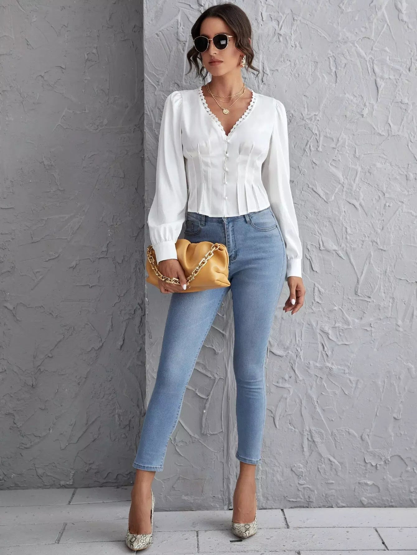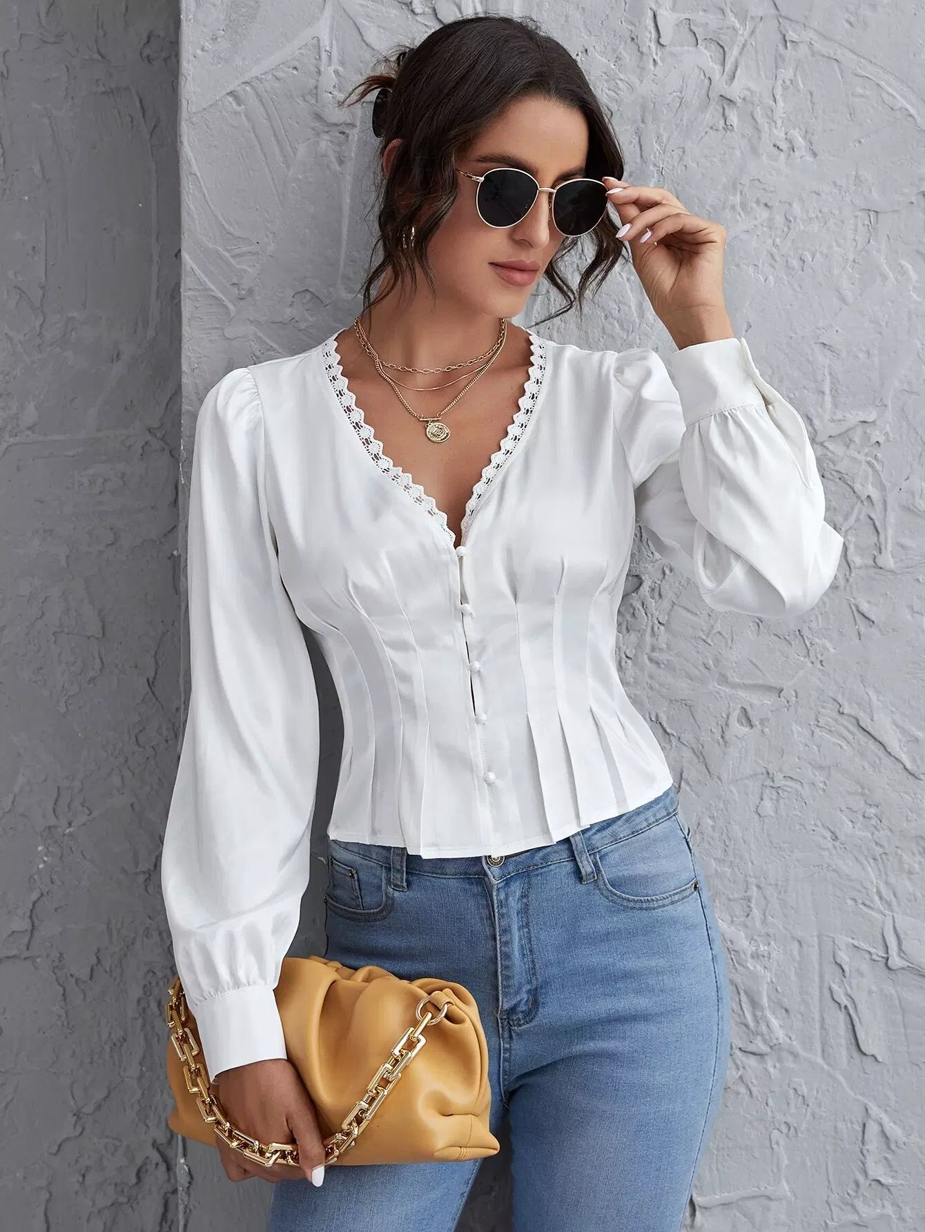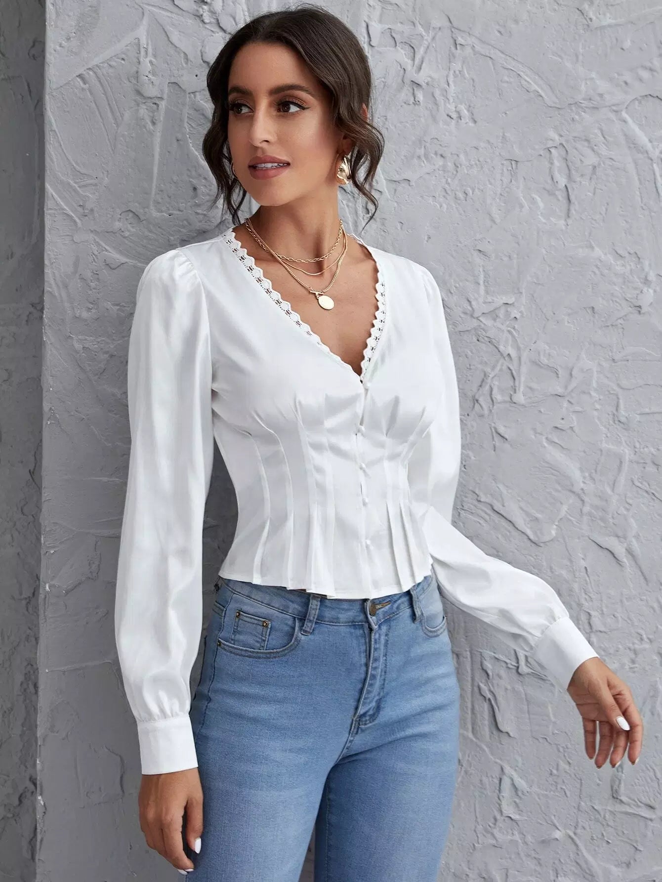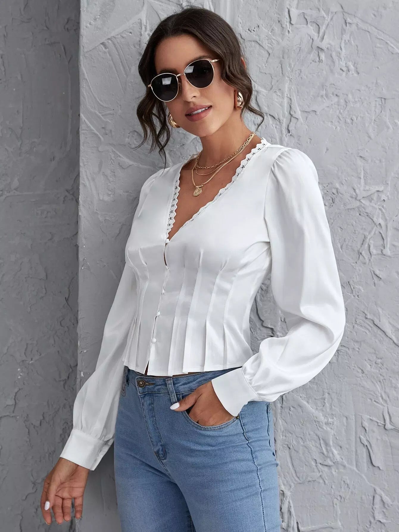 بلوزة بحواف من الدانتيل مطوية بطيات بأزرار أمامية
