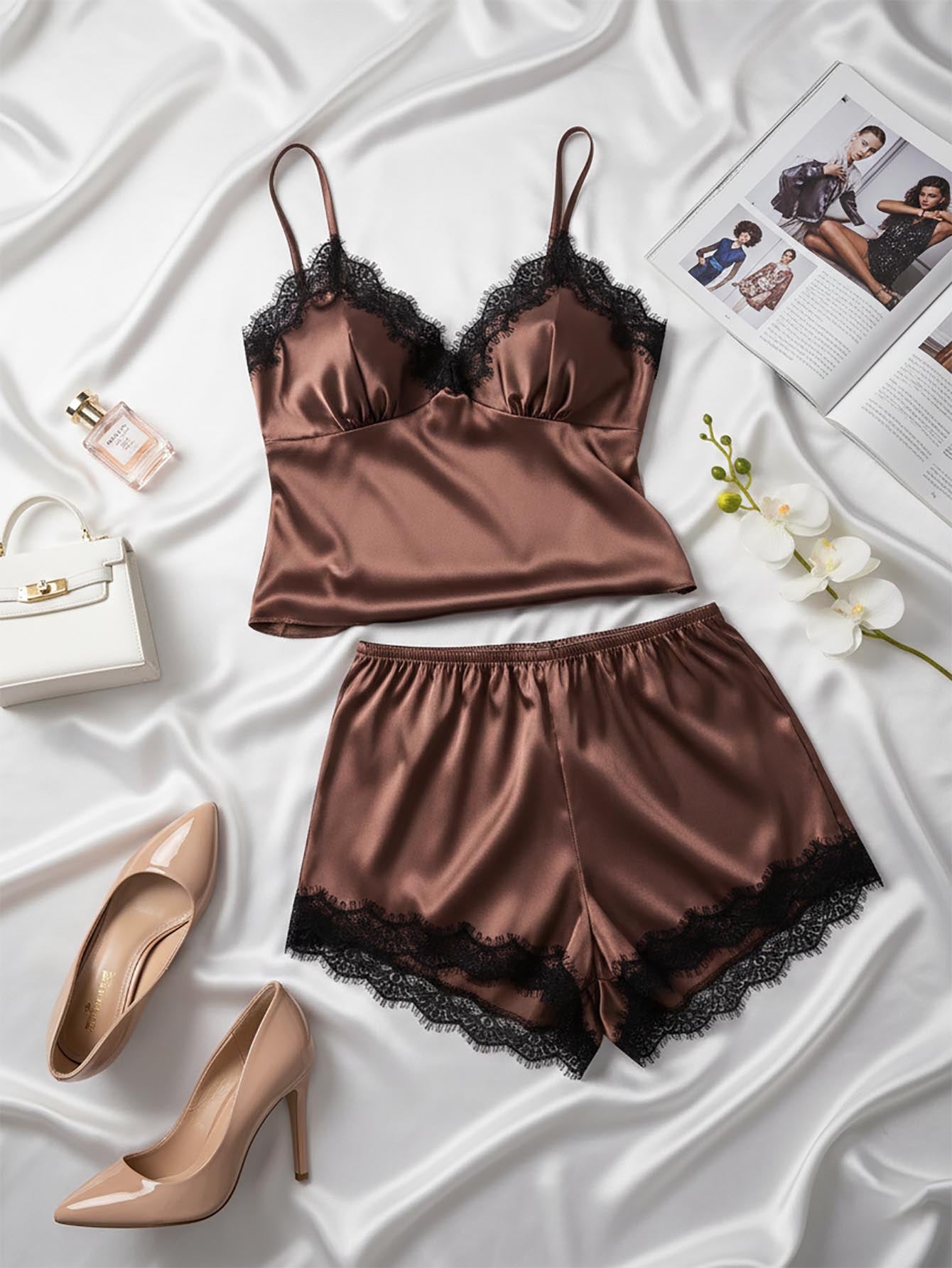 طقم بيجاما مكون من بلوزة قصيرة وسروال قصير من الساتان مزين بالدانتيل