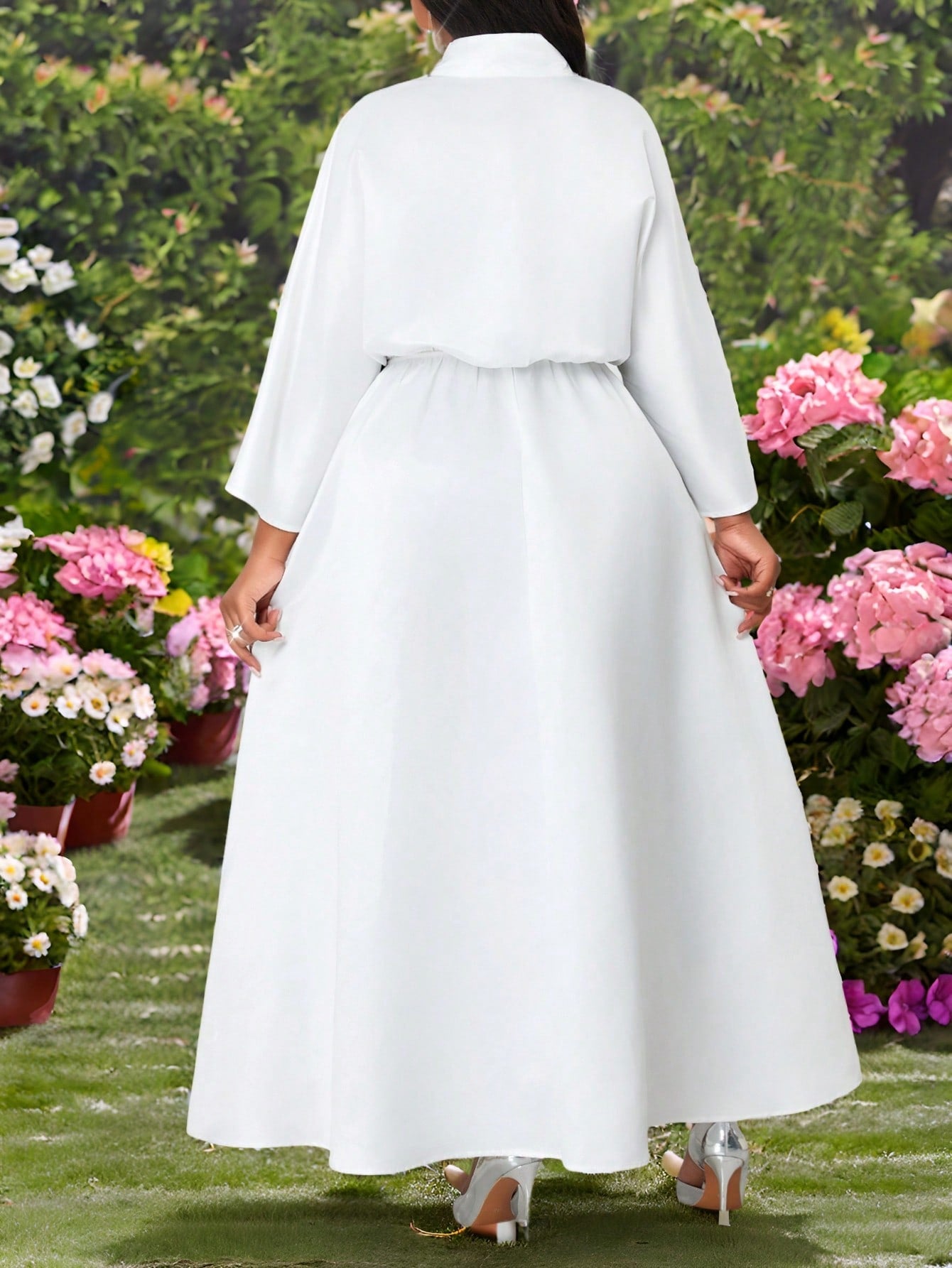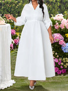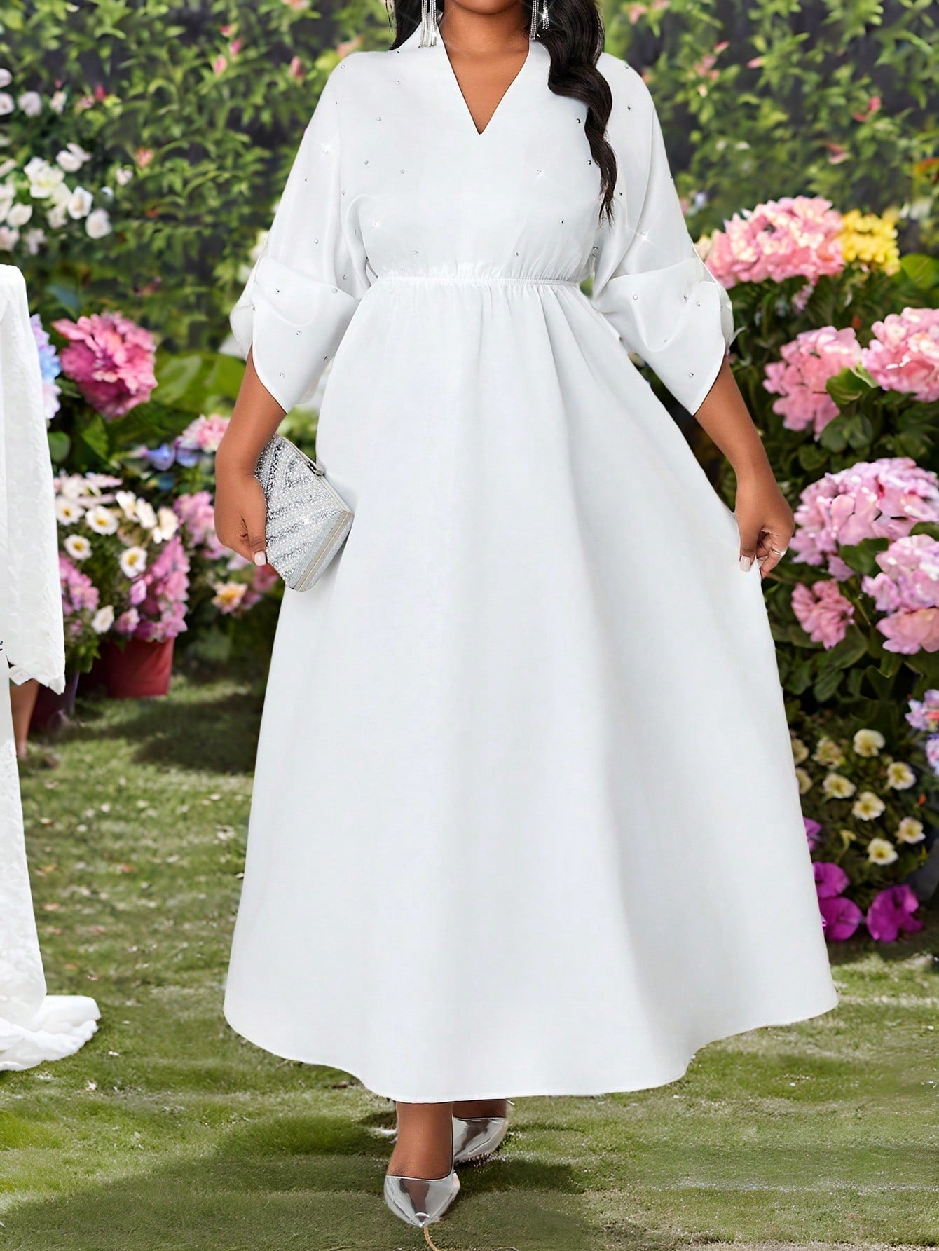 Lady Plus Size Women's Elegant Spring And Summer Elegant White Woven V-Neck Rhinestone Plus Size Dress