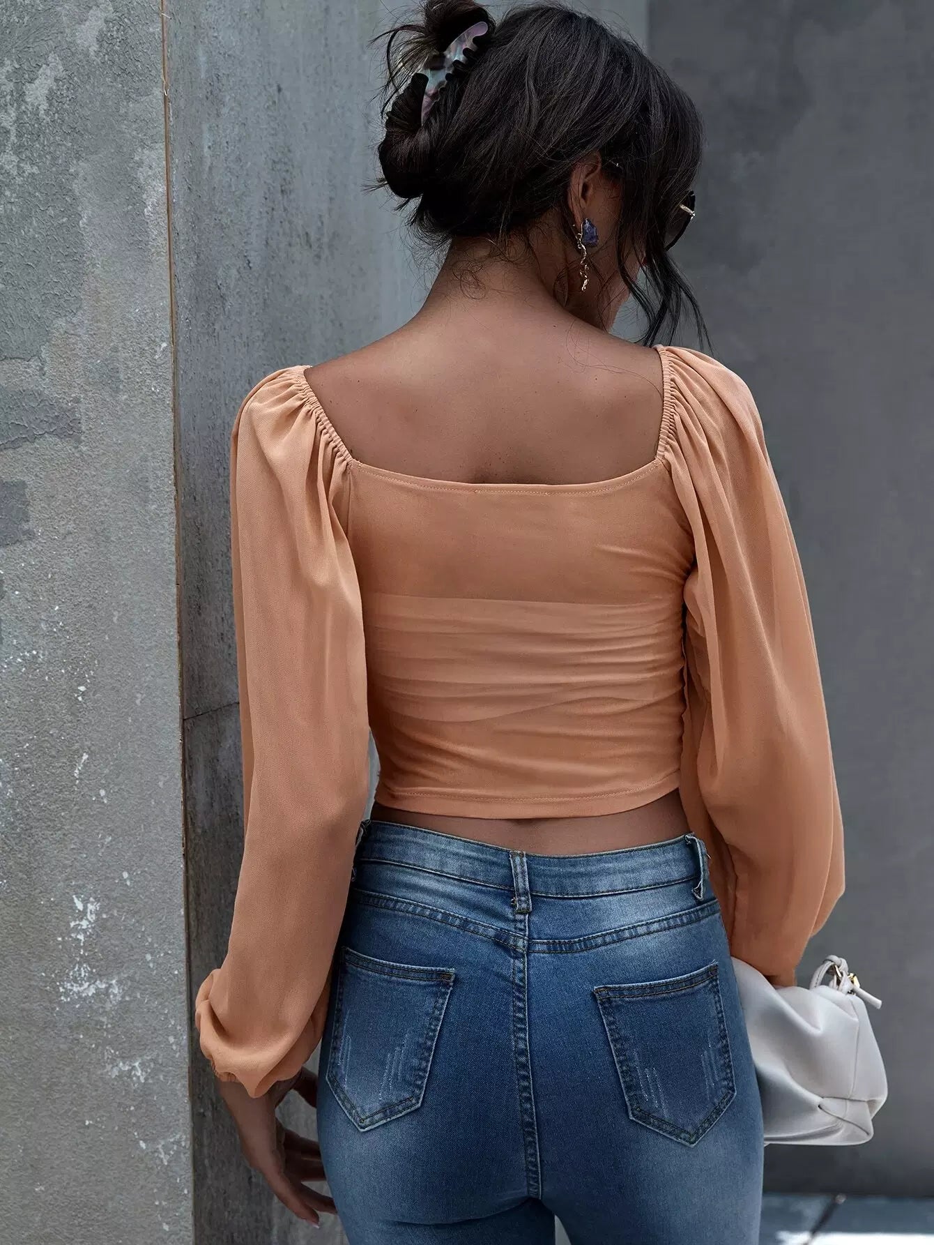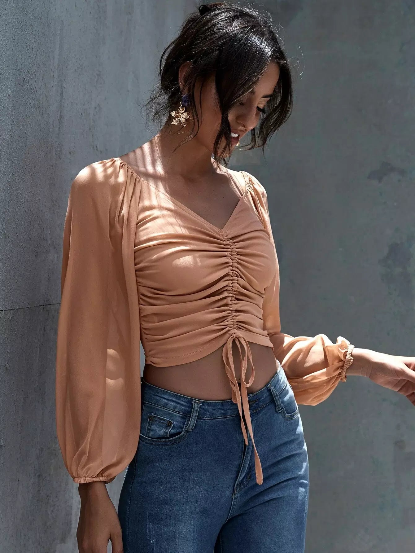 بلوزة مكشكشة برباط وأكمام على شكل فانوس