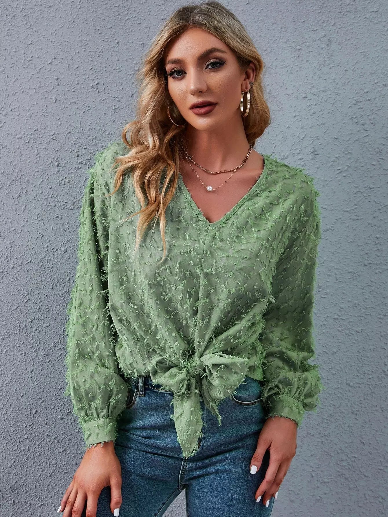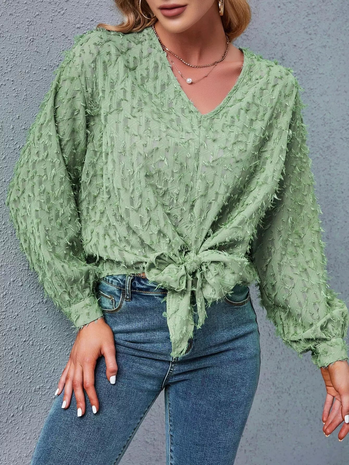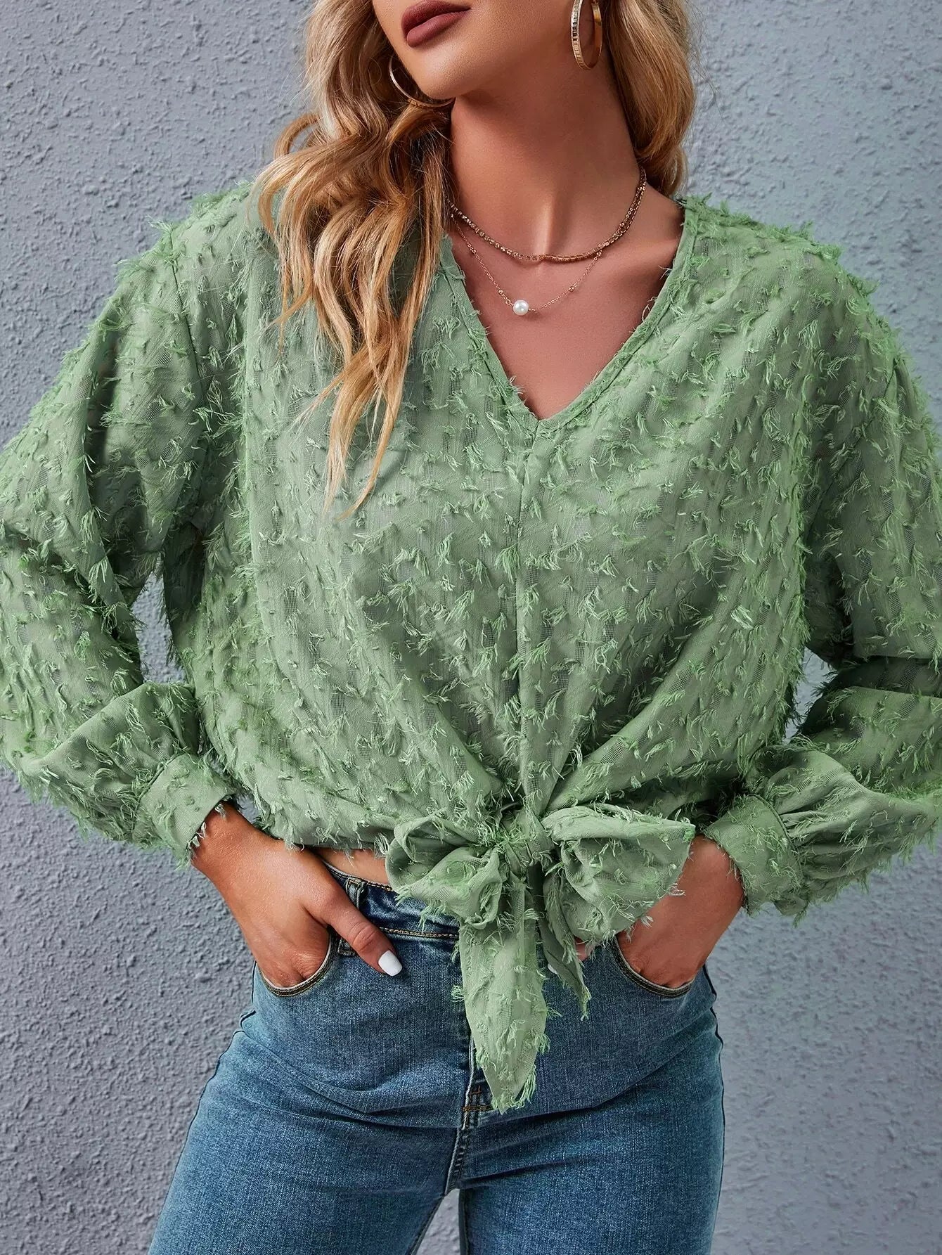 بلوزة بأكمام فانوسية ذات عقدة أمامية ضيقة من الأمام