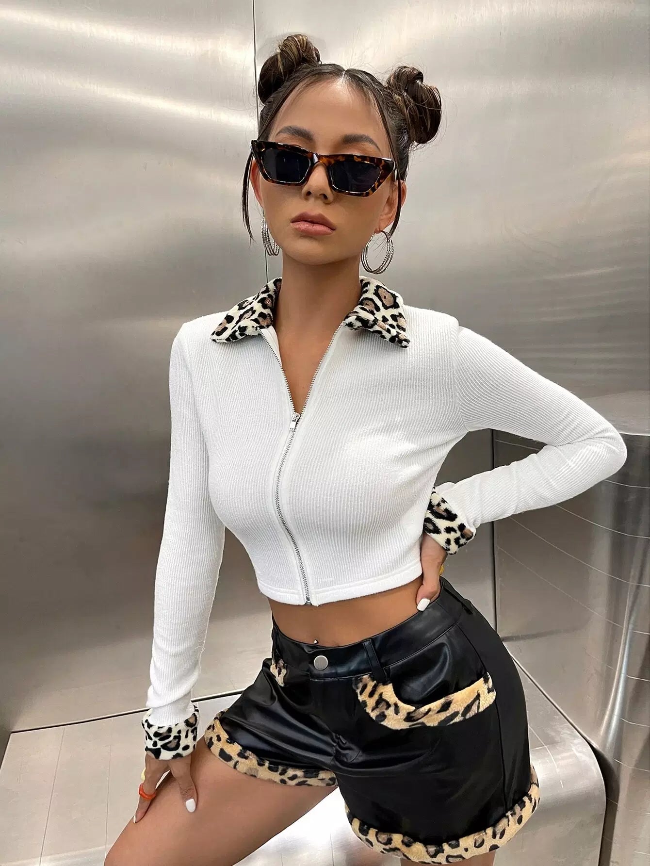 جاكيت قصير محبوك مضلع مضلع بطبعة جلد النمر