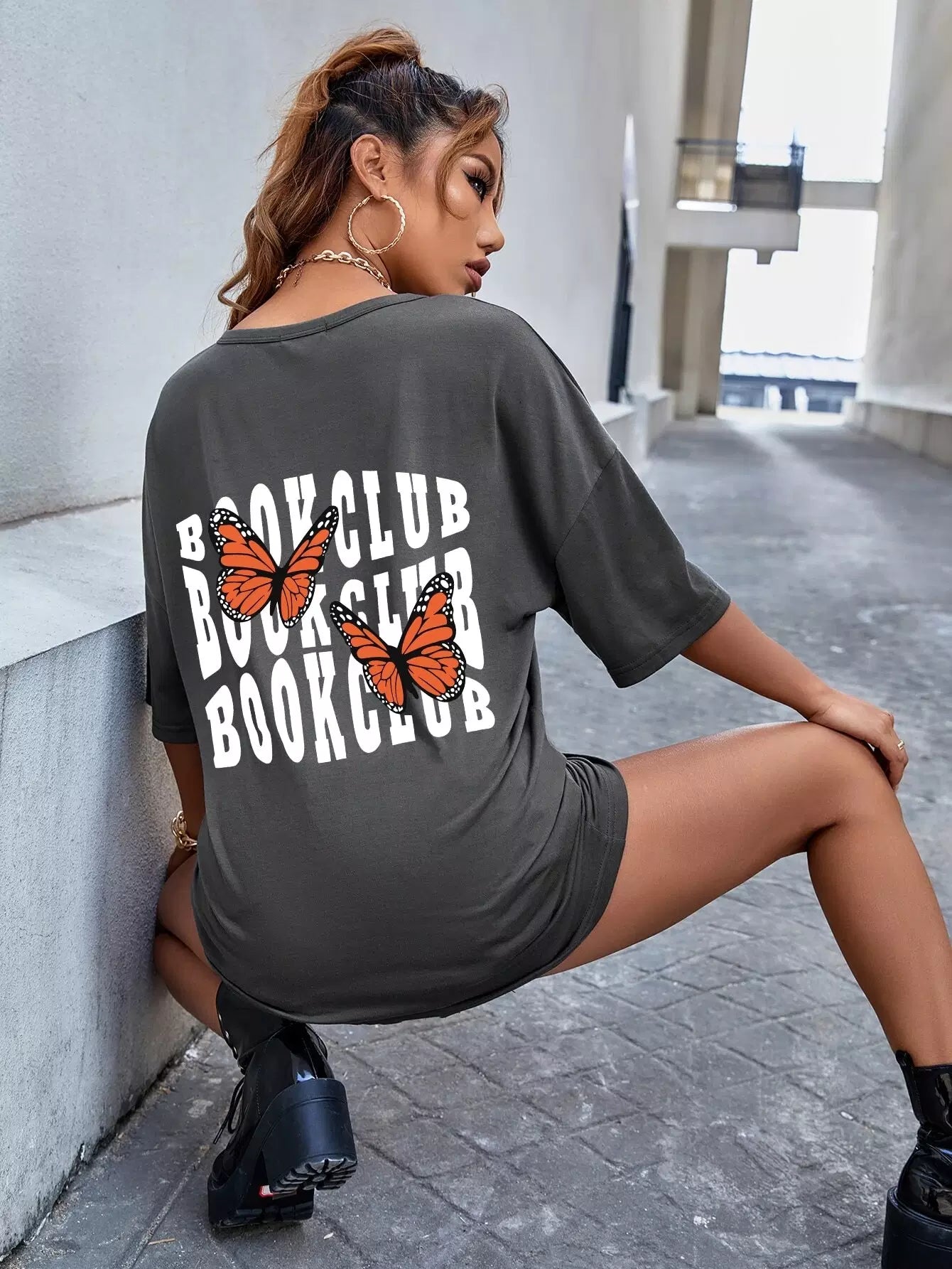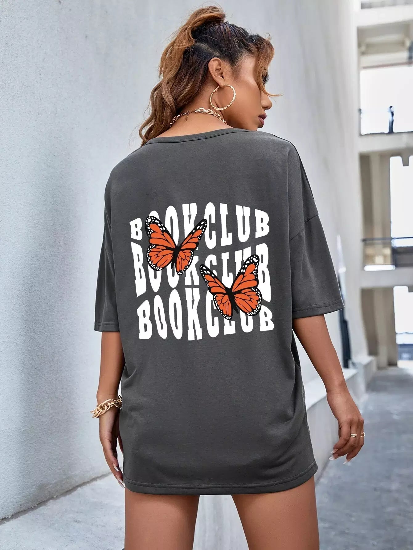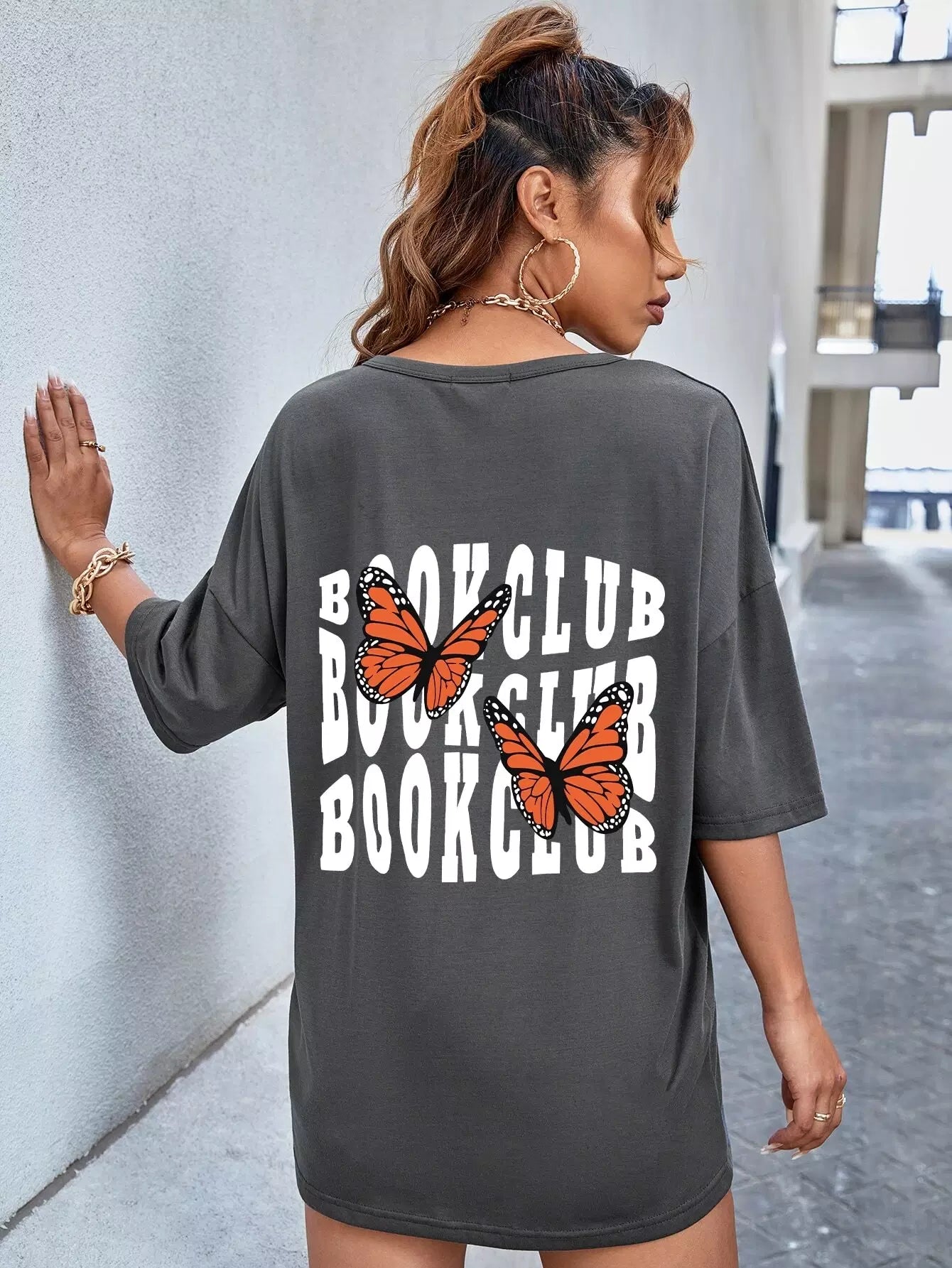 تي شيرت بكتف منسدل بطبعة حروف وفراشات