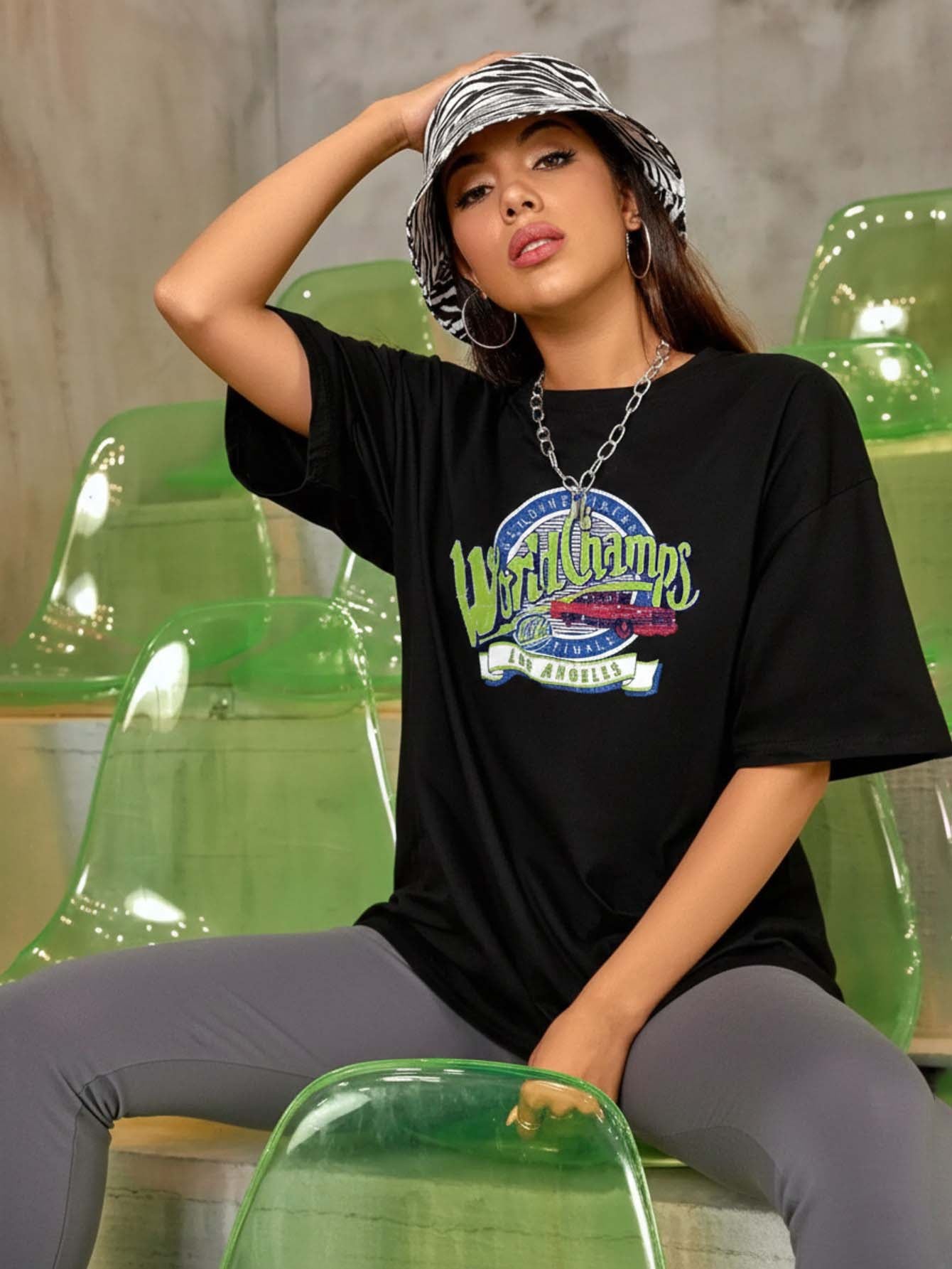 تي شيرت منسدل الكتفين مطبوع عليه حروف وسيارة