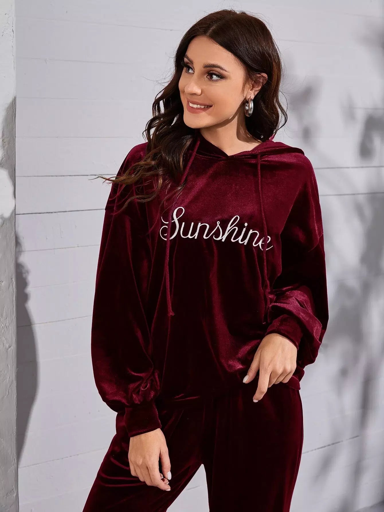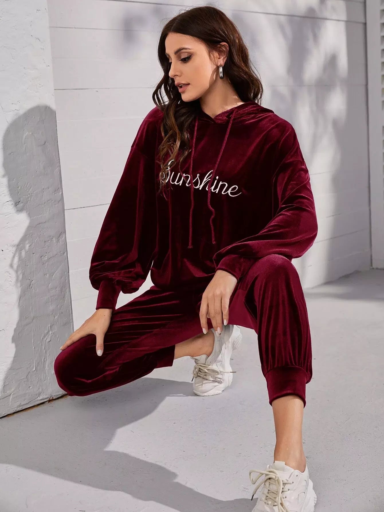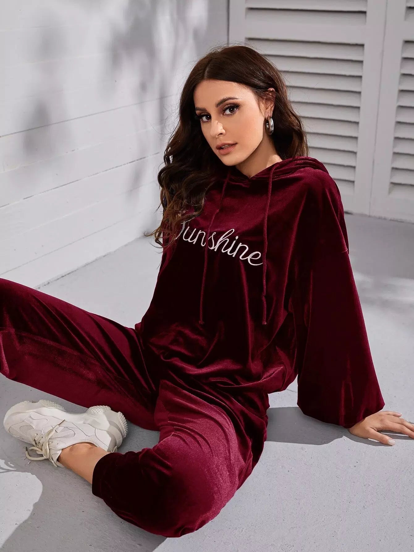 هودي مخملي برباط منسدل على الأكتاف مطرز بحروف، وبنطال رياضي مخملي