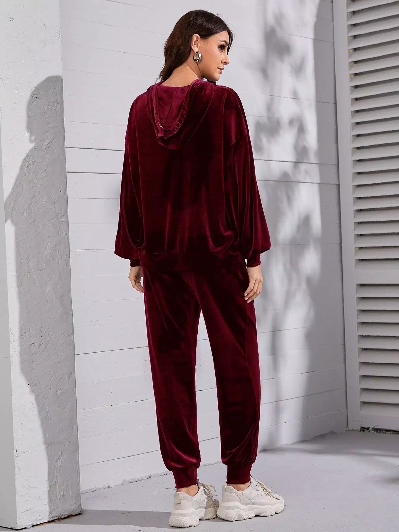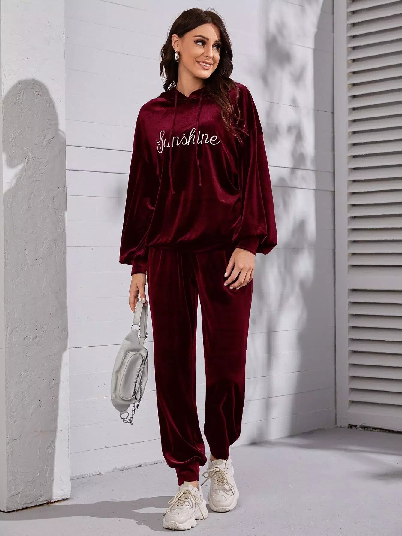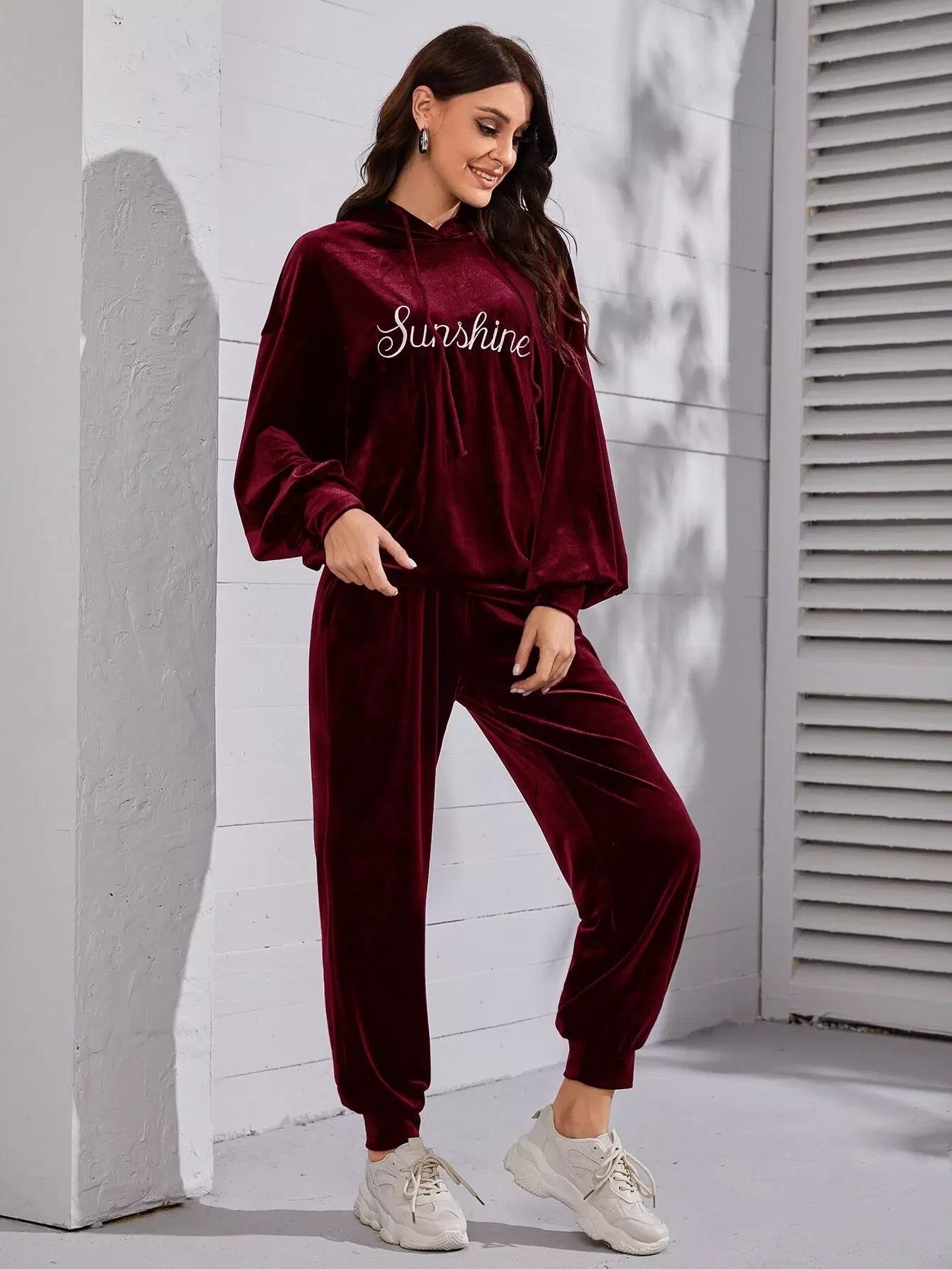 هودي مخملي برباط منسدل على الأكتاف مطرز بحروف، وبنطال رياضي مخملي