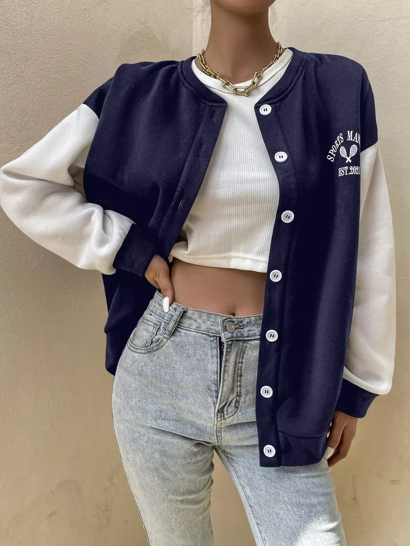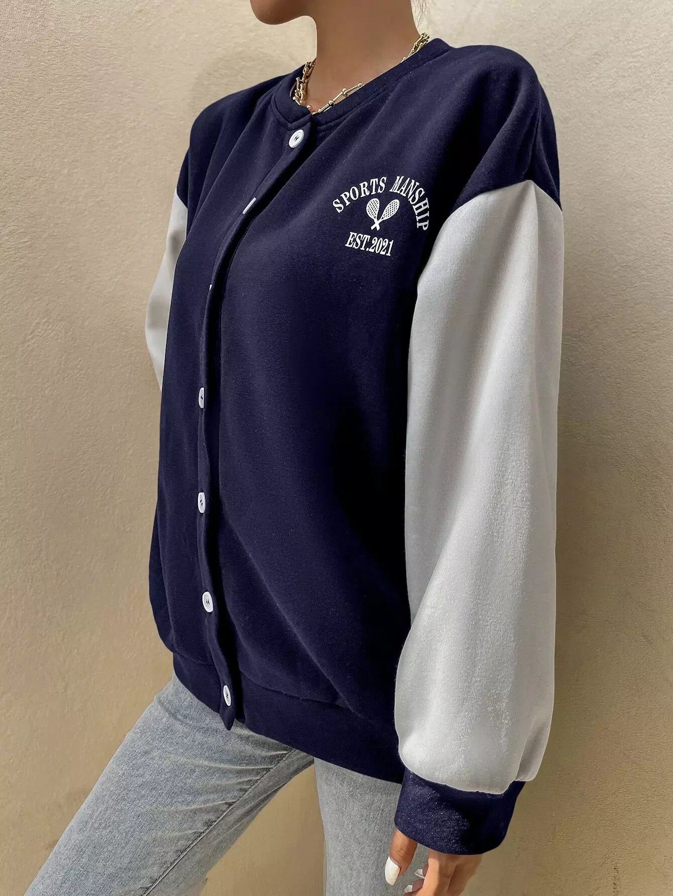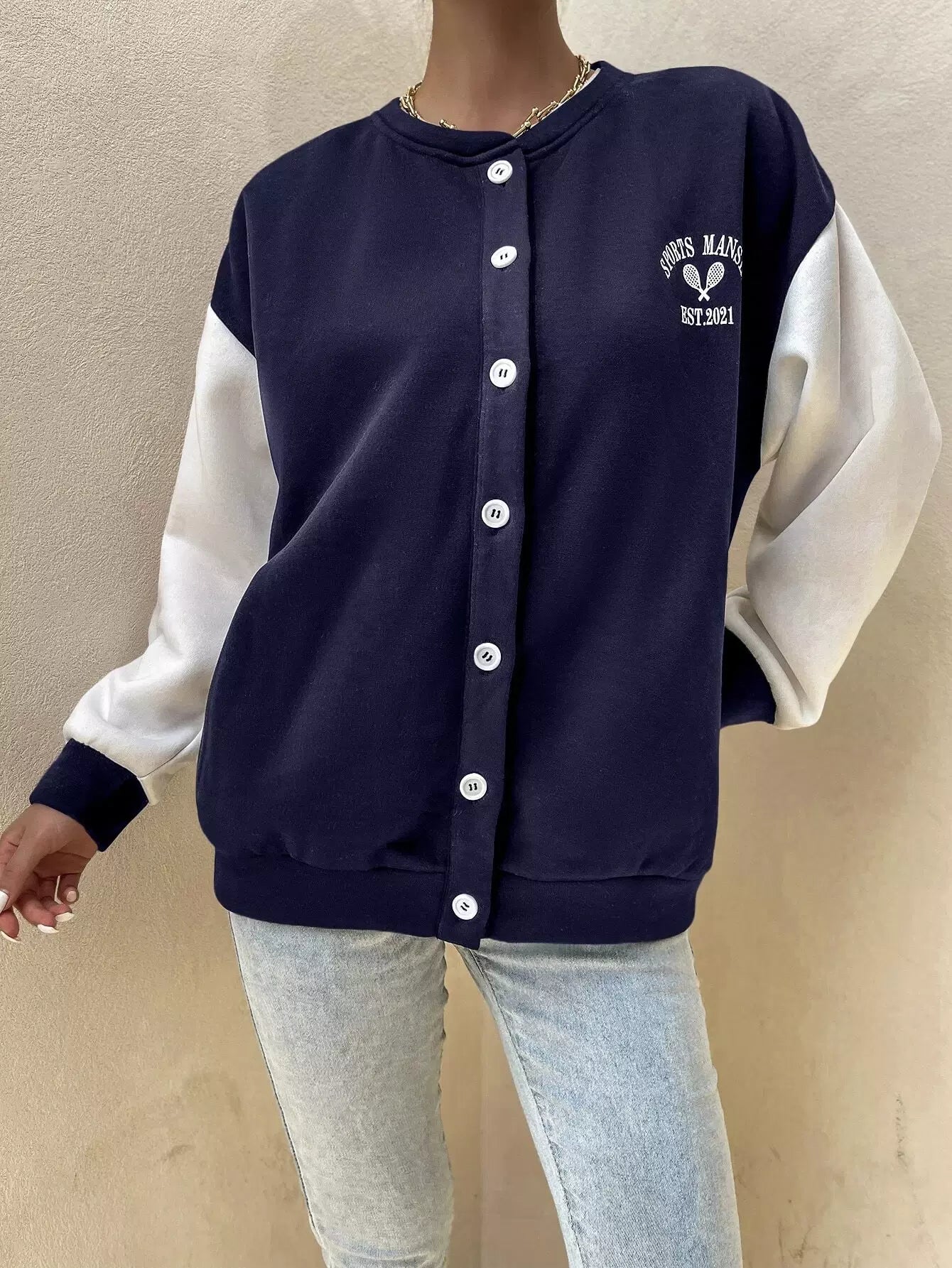 سويت شيرت برسومات حروف ملونة منسدلة على الكتف بأزرار أمامية