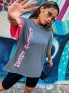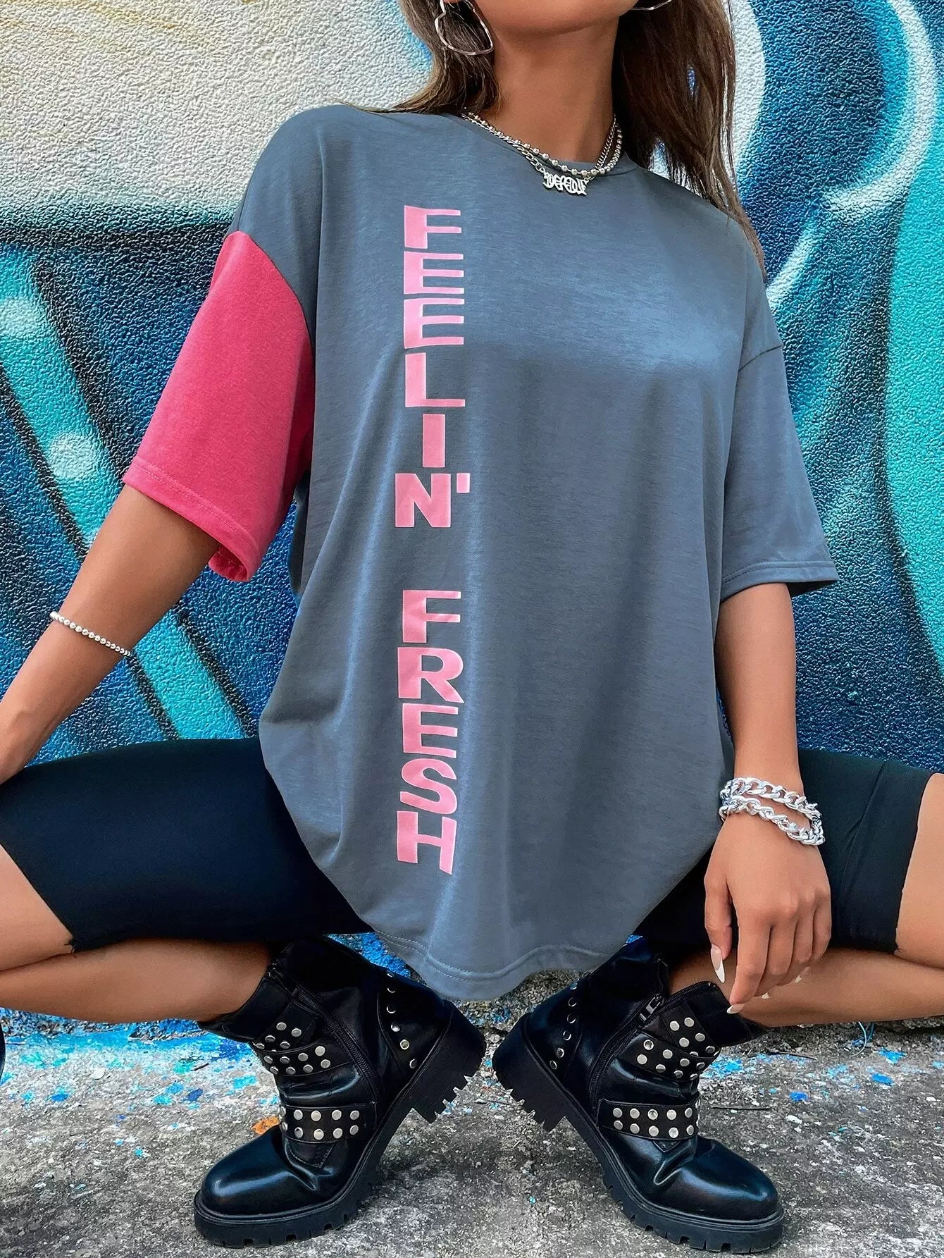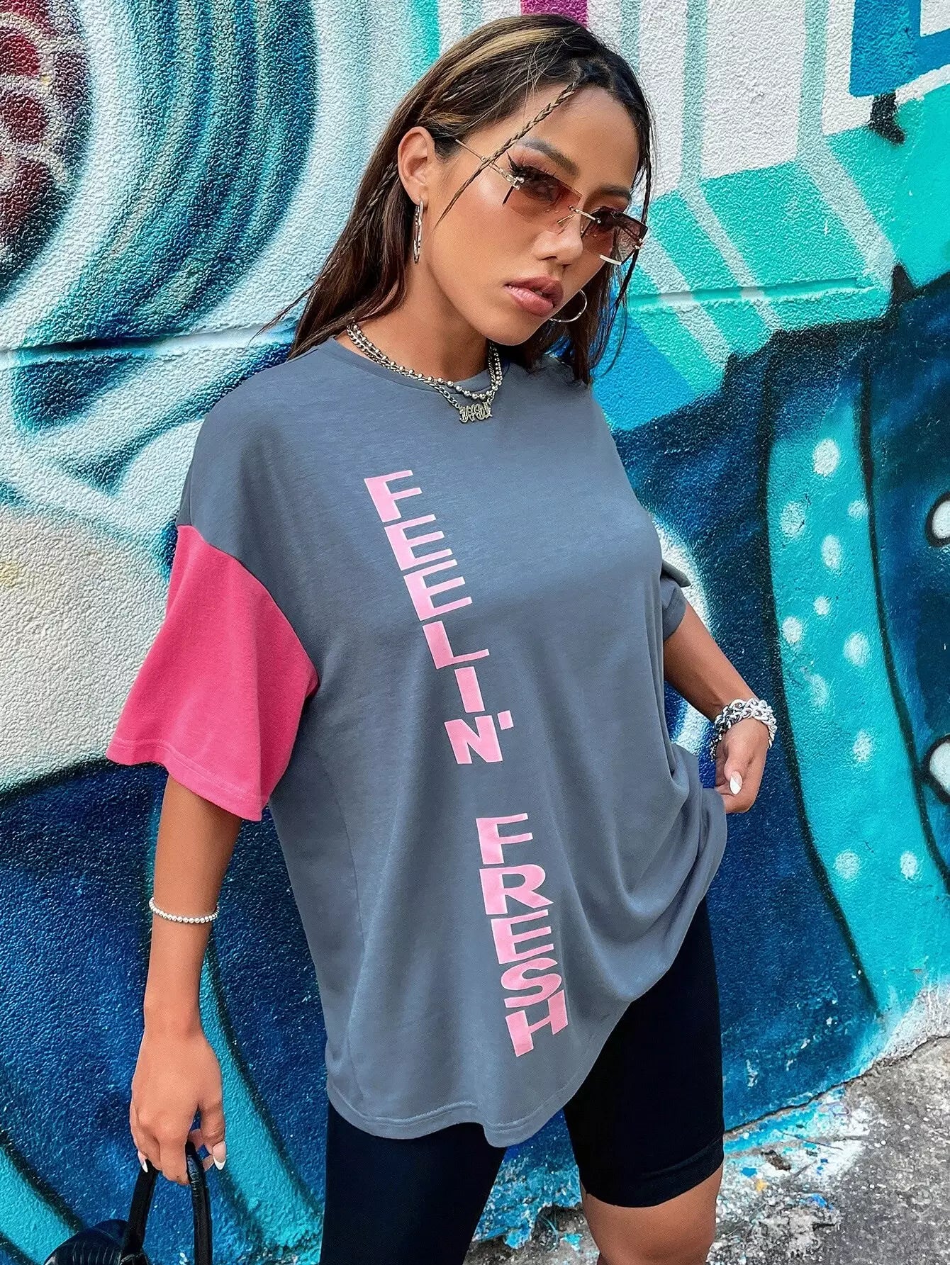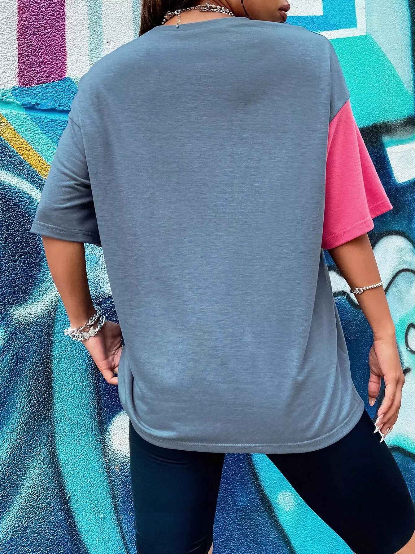 تي شيرت بألوان متعددة ورسومات أحرف وكتف منسدلة