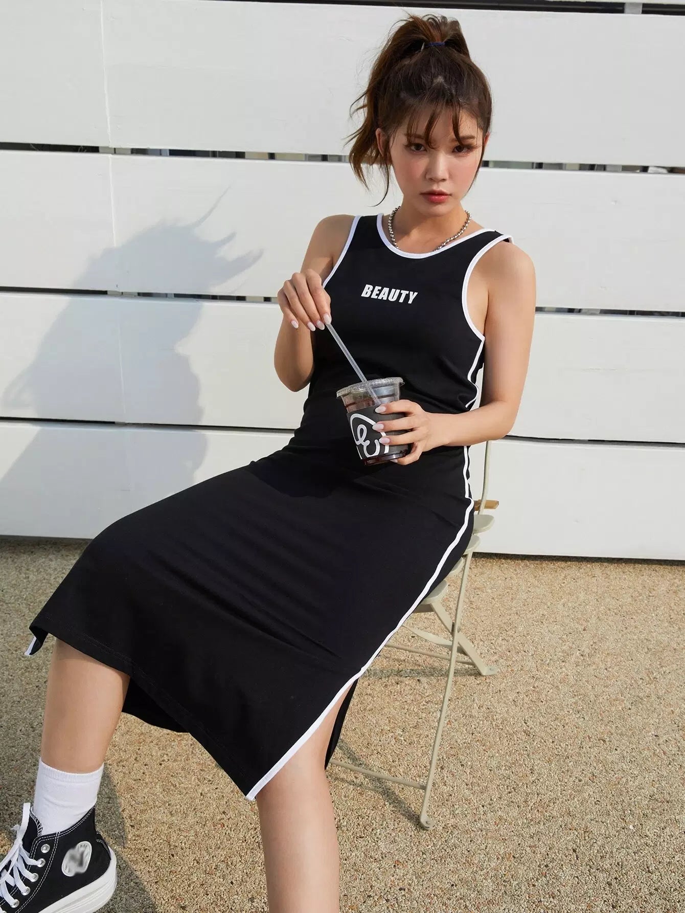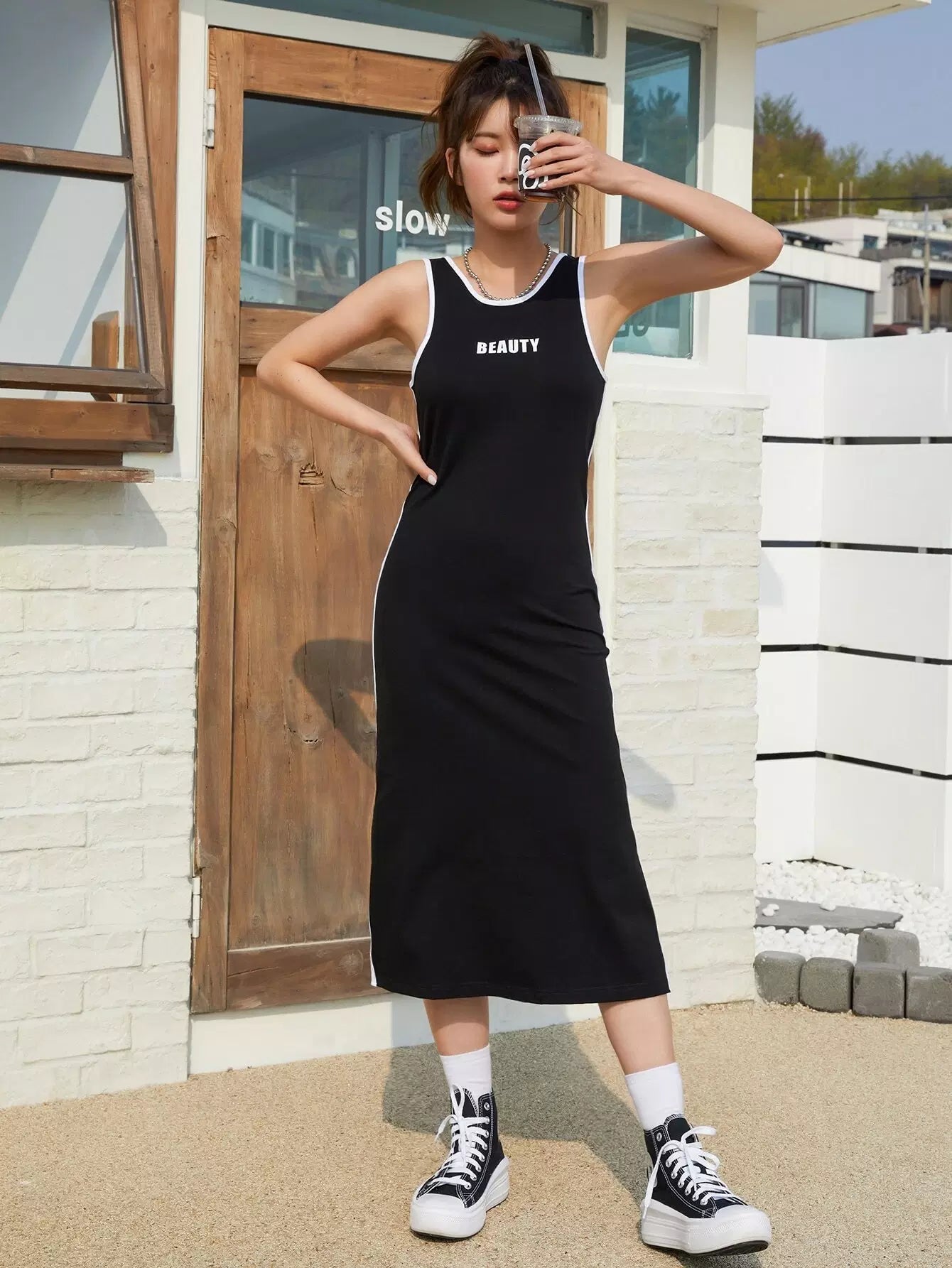 فستان بدون أكمام مزين برسومات حروف متباينة