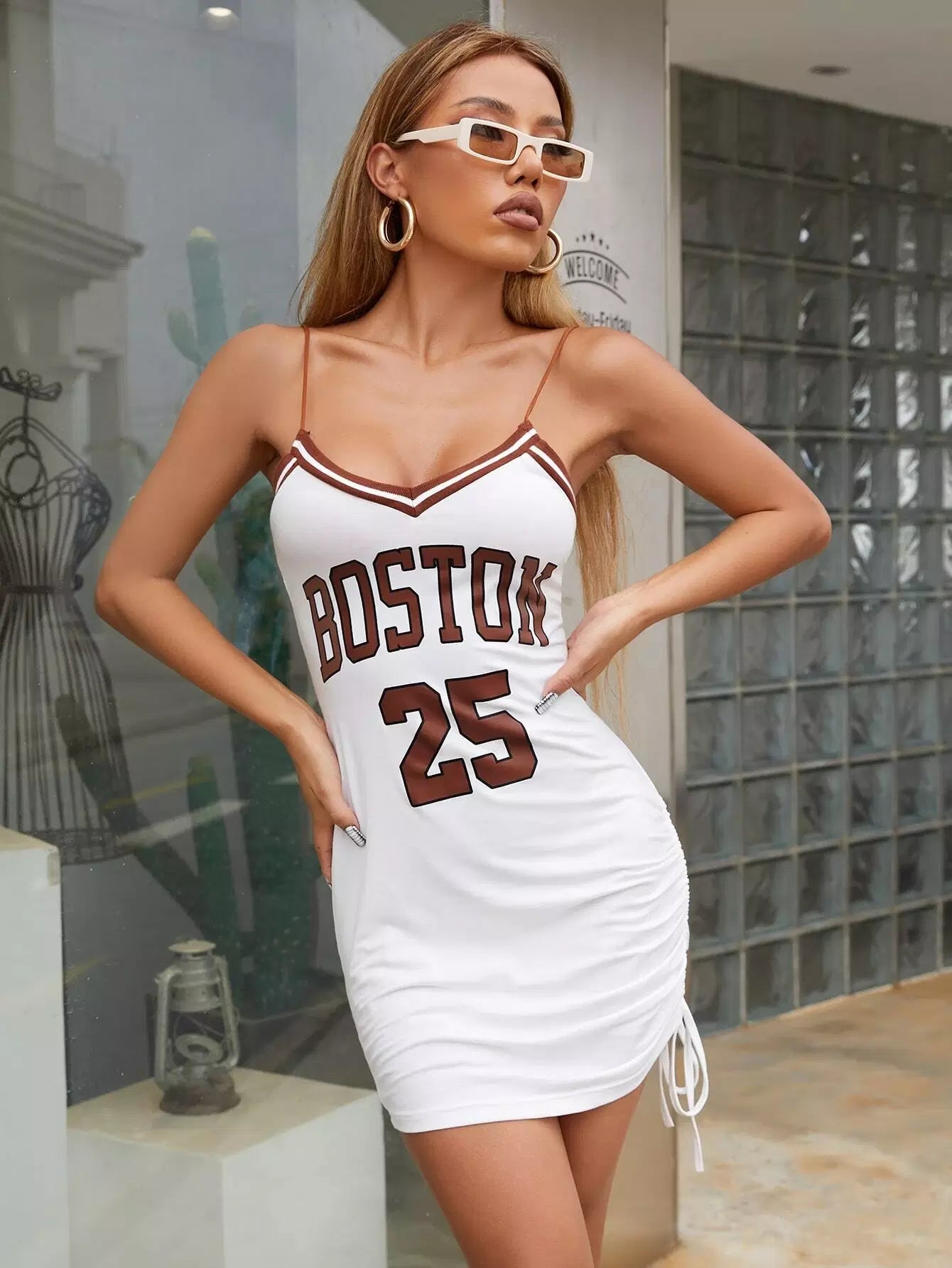 فستان كامي ضيق برباط جانبي ورسومات بأحرف