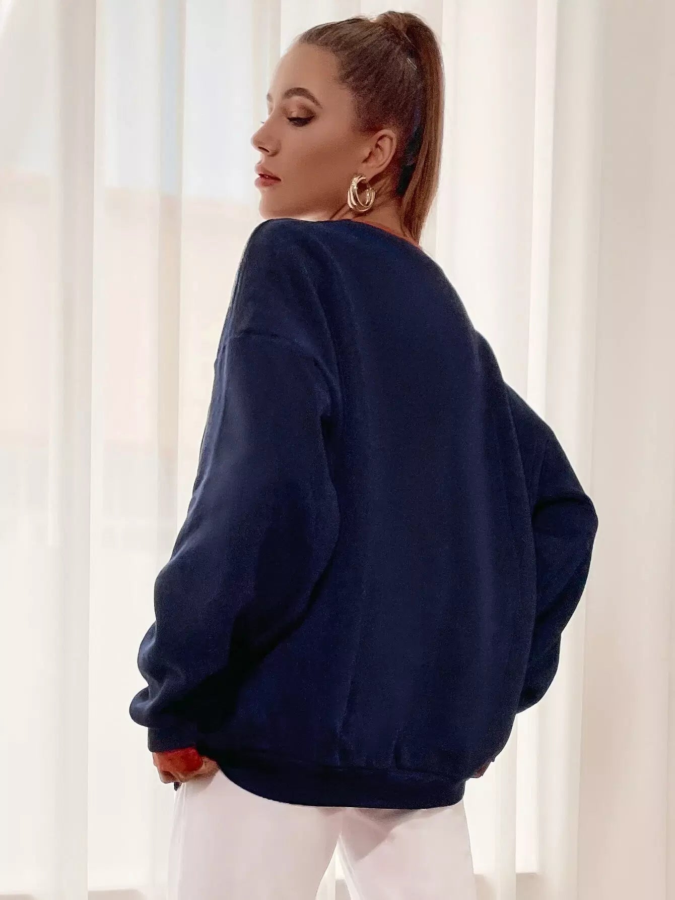 كنزة صوفية منسدلة الكتف ذات رسومات على شكل حرف منسدل