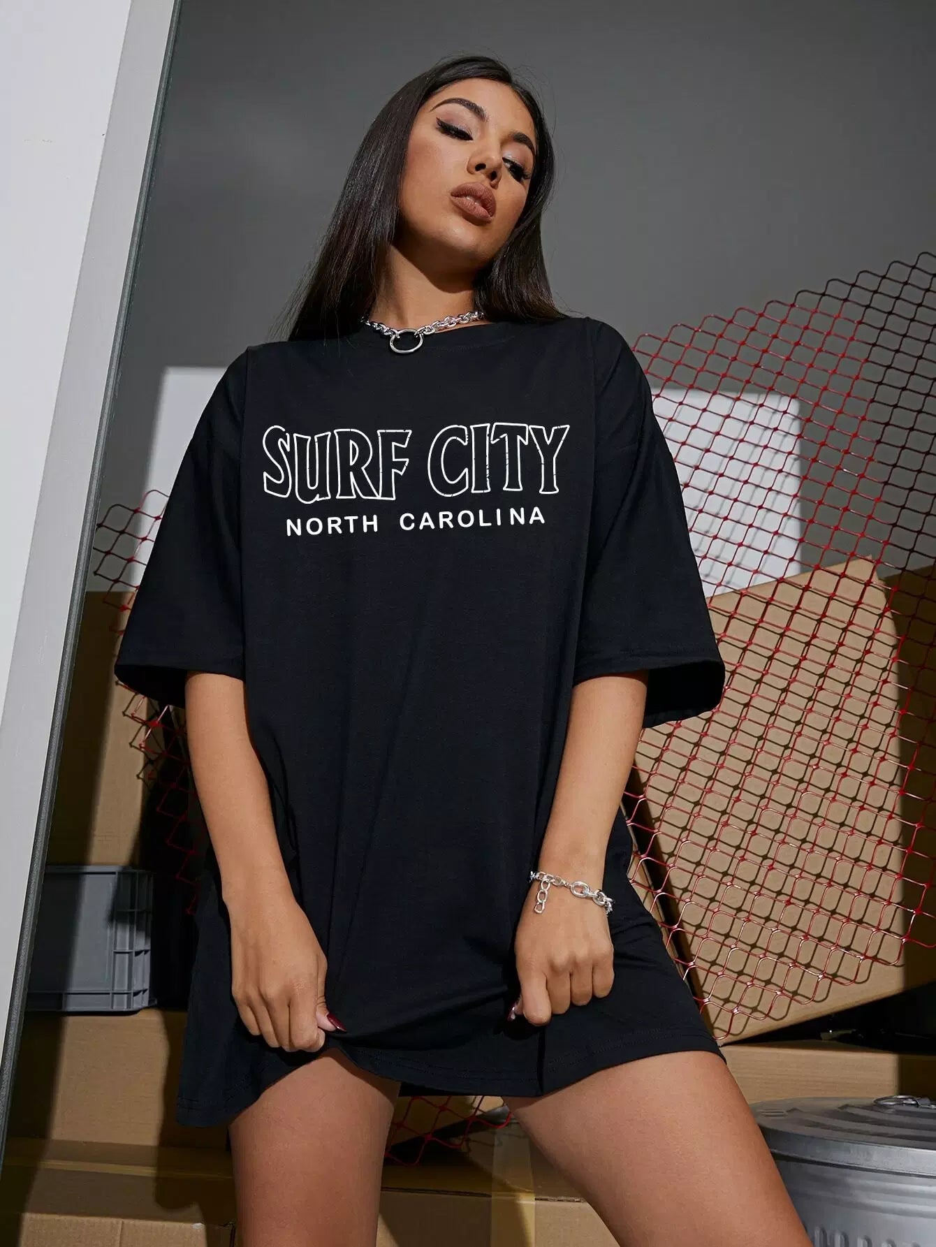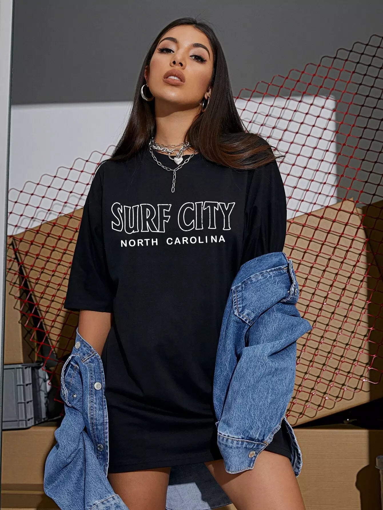 تي شيرت بتصميم منسدل الكتف برسمة حرف منسدل