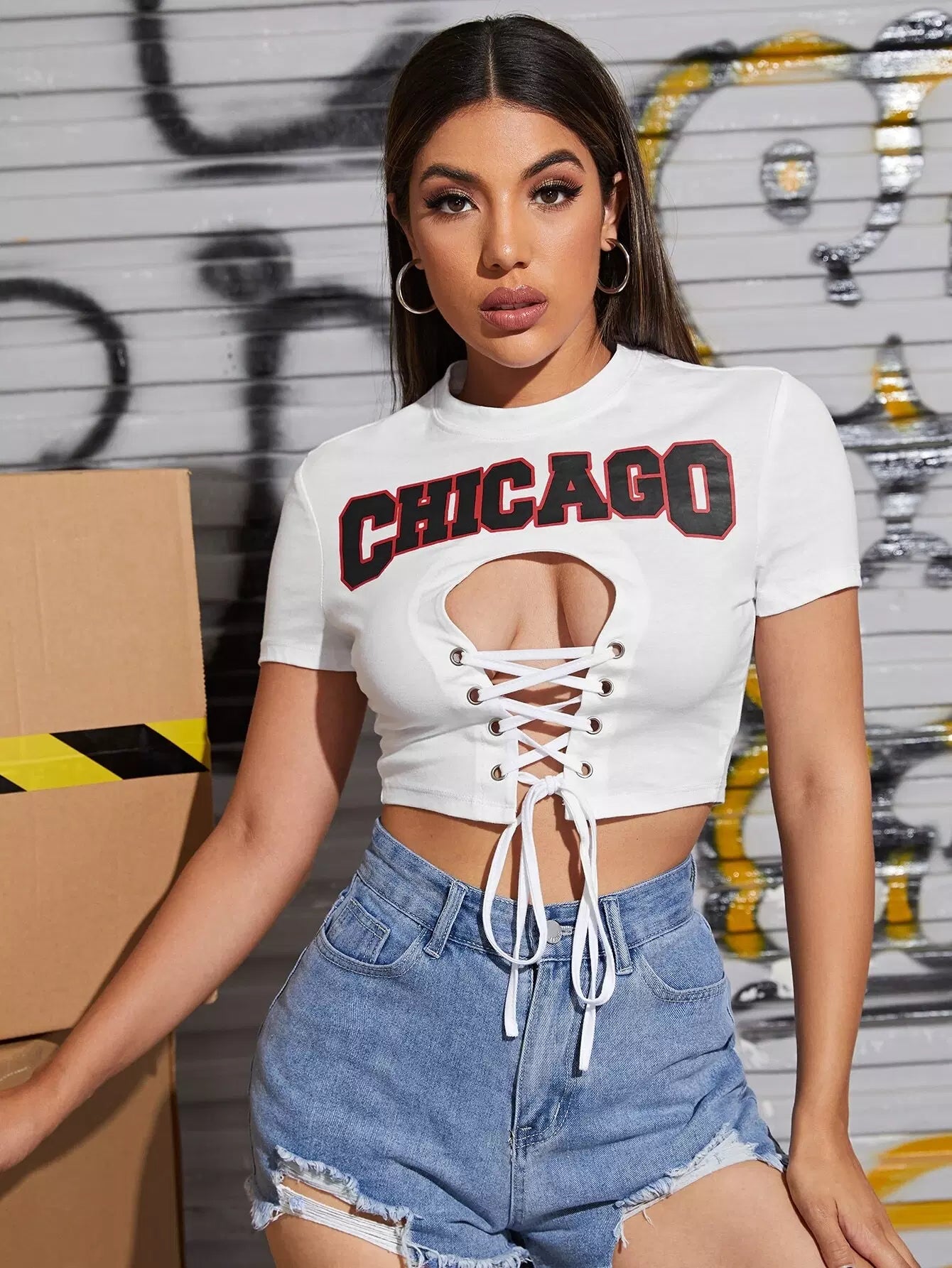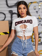 تي شيرت قصير مزين برسومات حروف على شكل عقدة دانتيل